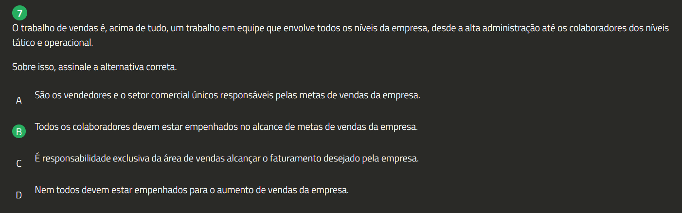 7 0 trabalho de vendas é, acima de tudo, um trabalho em equipe que envolve todos níveis da empresa, desde a alta administração até colaboradores dos níveis tático e operacional. Sobre isso, assinale a alternativa correta. A São vendedores e setor comercial únicos responsáveis pelas metas de vendas da empresa. Todos colaboradores devem estar empenhados no alcance de metas de vendas da empresa. É responsabilidade exclusiva da área de vendas alcançar 0 faturamento desejado pela empresa. D Nem todos devem estar empenhados para 0 aumento de vendas da empresa.