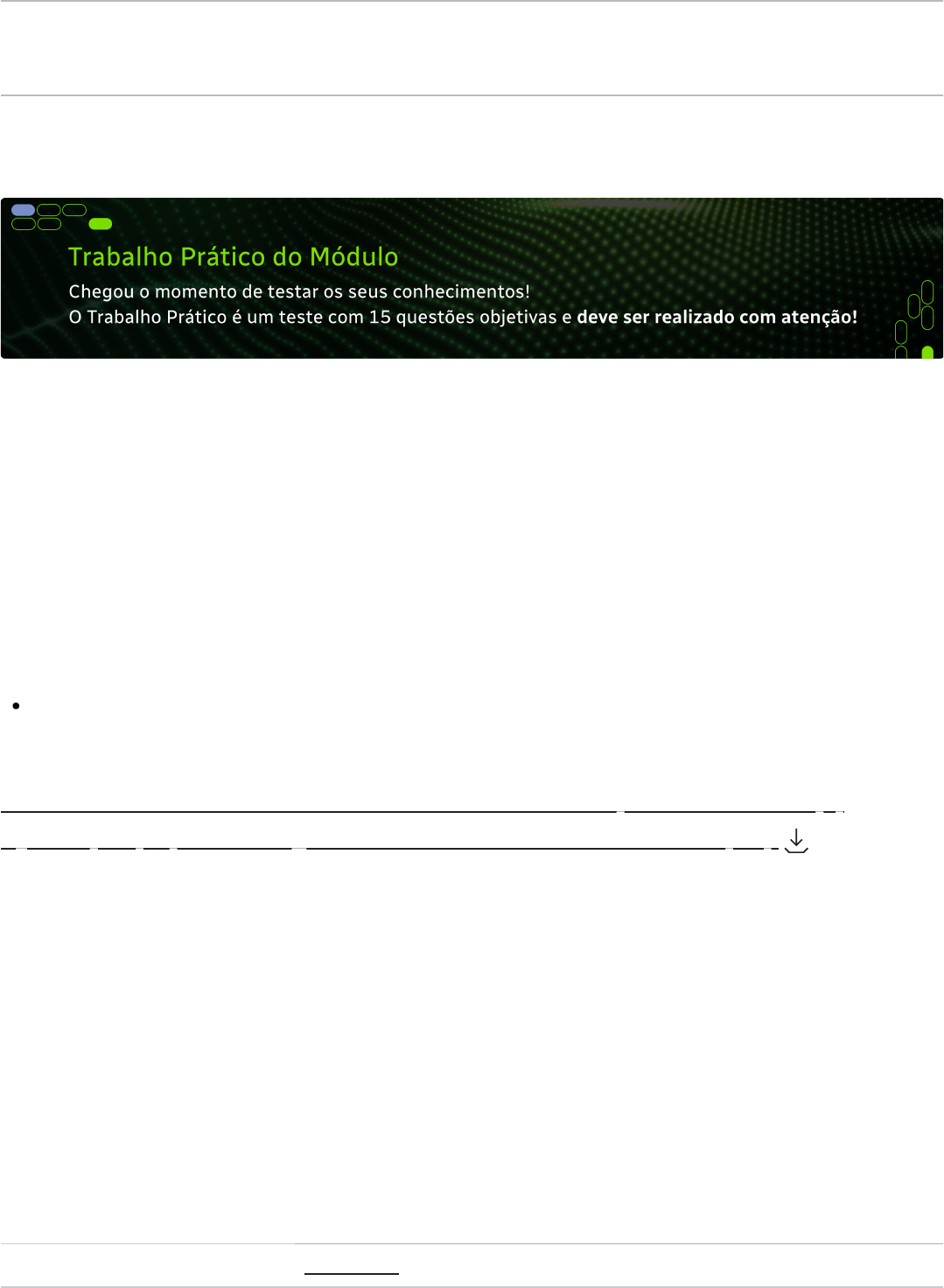 TPM3 - Trabalho Prático do Módulo 3 Entrega 1 set em 23:59 Pontos 45 Perguntas 15 Disponível até 1 set em 23:59 Limite de tempo Nenhum Instruções Histórico de tentativas Tentativa Tempo Pontuação MAIS RECENTE Tentativa 1 34 minutos 43,5 de 45 Reserve um tempo para realizar a atividade, leia as orientações e enunciados com atenção. Em caso de dúvidas utilize o Fórum de Dúvidas. Para iniciá-lo clique em "Fazer teste". Você tem somente uma tentativa e não há limite de tempo definido para realizá-lo. Caso precise interromper a atividade, apenas deixe a página e, ao retornar, clique em "Retomar teste". Clique em "Enviar teste" somente quando você concluí-lo. Antes de enviar confira todas as questões. O arquivo abaixo contém o enunciado do trabalho prático. Confira agora: Enunciado do Trabalho Prático - Módulo 3 - Bootcamp Desenvolvedor(a) Python.pdf (https://online.igti.com.br/courses/8169/files/676506?wrap=1) (https://online.igti.com.br/courses/8169/files/676506/download?download_frd=1) Bons estudos! Atenciosamente, Equipe XP Educação 07/08/25, 19:07 TPM3 - Trabalho Prático do Módulo 3: 2025-2A - ACR - Bootcamp Desenvolvedor(a) Python https://online.igti.com.br/courses/8169/quizzes/107735?module_item_id=670254 1/7 https://online.igti.com.br/courses/8169/quizzes/107735/history?version=1 https://online.igti.com.br/courses/8169/files/676506?wrap=1 https://online.igti.com.br/courses/8169/files/676506?wrap=1 https://online.igti.com.br/courses/8169/files/676506/download?download_frd=1 https://online.igti.com.br/courses/8169/files/676506/download?download_frd=1 https://online.igti.com.br/courses/8169/files/676506/download?download_frd=1 Pontuação deste teste: 43,5 de 45 Enviado 6 ago em 23:48 Esta tentativa levou 34 minutos. 3 / 3 ptsPergunta 1 Qual método HTTP foi utilizado no envio do formulário? POST Correto!Correto! DELETE PUT PATH 3 / 3 ptsPergunta 2 Qual o template engine utilizado do projeto? Jinja Correto!Correto! Flask Django Python 3 / 3 ptsPergunta 3 Qual nome do arquivo de configuração da pasta de templates? 07/08/25, 19:07 TPM3 - Trabalho Prático do Módulo 3: 2025-2A - ACR - Bootcamp Desenvolvedor(a) Python https://online.igti.com.br/courses/8169/quizzes/107735?module_item_id=670254 2/7 urls.py manage.py views.py settings.py Correto!Correto! 3 / 3 ptsPergunta 4 Em quantos arquivos é necessário configurar as urls 2 Correto!Correto! 3 1 0 3 / 3 ptsPergunta 5 Para a execução do projeto, é estritamente necessário o uso de banco de dados? Não. Correto!Correto! Sim. Mas não é essencial. Talvez. Sim. É essencial. 07/08/25, 19:07 TPM3 - Trabalho Prático do Módulo 3: 2025-2A - ACR - Bootcamp Desenvolvedor(a) Python https://online.igti.com.br/courses/8169/quizzes/107735?module_item_id=670254 3/7 3 / 3 ptsPergunta 6 Qual número mínimo de rotas utilizadas no projeto? 3. Duas GET e uma para POST. 0. Nenhuma é necessária. 2. Duas GET. 1. Apenas Uma com GET e POST. Correto!Correto! 3 / 3 ptsPergunta 7 Qual número mínimo de arquivos HTML que podem ser usados como template? Quatro. Por causa do número de respostas e do formulário. Três. Por causa da quantidade de possibilidades de resposta. Dois. Por causa do número de raízes ser dois. Em apenas um todo o frontend pode ser exibido. Correto!Correto! 3 / 3 ptsPergunta 8 O Django implementa algum padrão de projeto? Não, o usuário deve configurar. Sim, o MVC. Sim, o MVP. 07/08/25, 19:07 TPM3 - Trabalho Prático do Módulo 3: 2025-2A - ACR - Bootcamp Desenvolvedor(a) Python https://online.igti.com.br/courses/8169/quizzes/107735?module_item_id=670254 4/7 Sim, o MVT. Correto!Correto! 3 / 3 ptsPergunta 9 Como se cria um projeto Django? python startproject xyz django startproject xyz django-admin startproject xyz Correto!Correto! django-admin manage.py startproject xyz 3 / 3 ptsPergunta 10 Como se instala o Django? pip install python sudo apt-get install django pip install django Correto!Correto! python install django 3 / 3 ptsPergunta 11 Qual comando para iniciar o servidor da aplicação? python manage.py run 07/08/25, 19:07 TPM3 - Trabalho Prático do Módulo 3: 2025-2A - ACR - Bootcamp Desenvolvedor(a) Python https://online.igti.com.br/courses/8169/quizzes/107735?module_item_id=670254 5/7 python runserver python manage.py runserver Correto!Correto! manage.py runserver 1,5 / 3 ptsPergunta 12 Para verificar sua versão do Python são necessários alguns comandos. Qual(is) dos comandos abaixo não são? python -Version Correto!Correto! python -V python -Vv python –V esposta corretaesposta correta 3 / 3 ptsPergunta 13 Qual comando de criação de aplicativo em um projeto Django? python manage.py startapp app Correto!Correto! python manage.py startapp python manage.py app python startapp app 3 / 3 ptsPergunta 14 07/08/25, 19:07 TPM3 - Trabalho Prático do Módulo 3: 2025-2A - ACR - Bootcamp Desenvolvedor(a) Python https://online.igti.com.br/courses/8169/quizzes/107735?module_item_id=670254 6/7 O que é Django? É um sistema web. É um criador de sites. É um framework. Correto!Correto! É uma biblioteca do python. 3 / 3 ptsPergunta 15 Qual a responsabilidade das views do projeto? As views reprocessam os dados e devolvem ao frontend. As views recebem os dados do frontend e reprocessam esses valores. As views renderizam os templates. As views recebem os dados do frontend, reprocessam e devolvem ao frontend renderizando os templates. Correto!Correto! Pontuação do teste: 43,5 de 45 07/08/25, 19:07 TPM3 - Trabalho Prático do Módulo 3: 2025-2A - ACR - Bootcamp Desenvolvedor(a) Python https://online.igti.com.br/courses/8169/quizzes/107735?module_item_id=670254 7/7