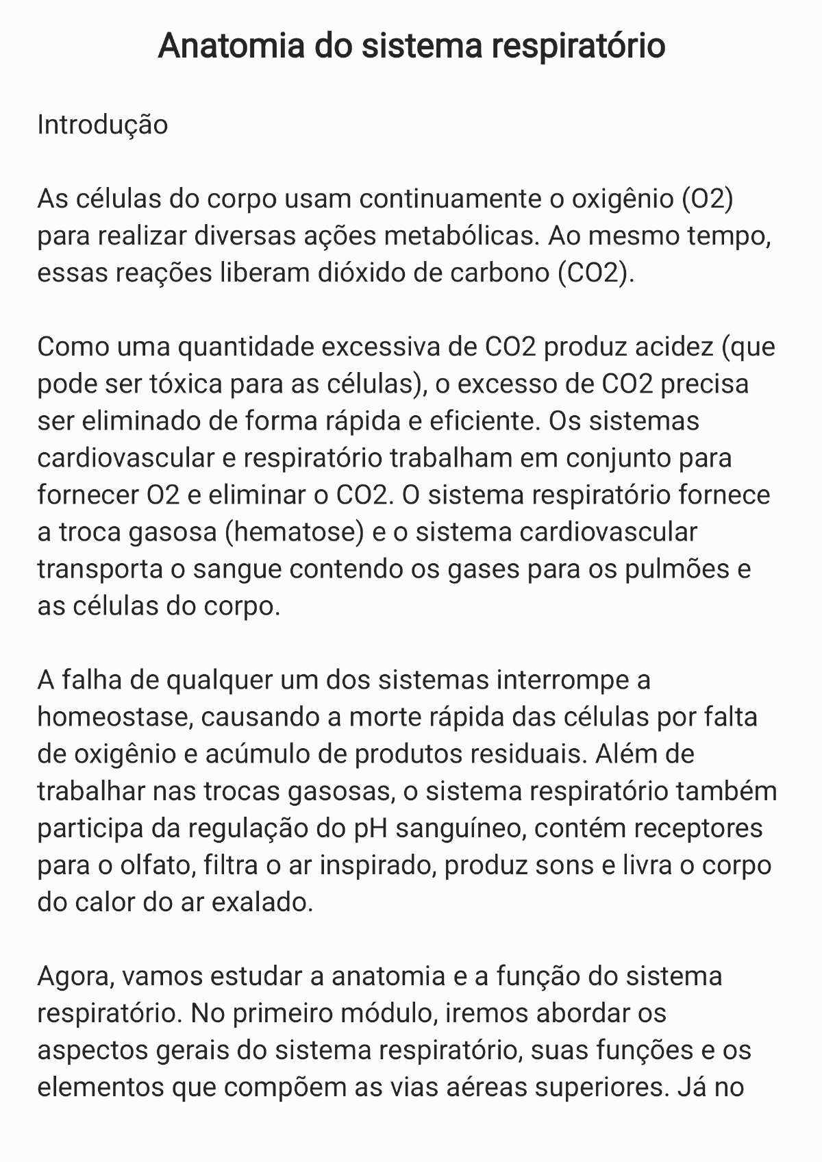 Anatomia do sistema respiratório Introdução As células do corpo usam continuamente oxigênio (02) para realizar diversas ações metabólicas. Ao mesmo tempo, essas reações liberam dióxido de carbono (CO2). Como uma quantidade excessiva de CO2 produz acidez (que pode ser tóxica para as células), excesso de CO2 precisa ser eliminado de forma rápida e eficiente. Os sistemas cardiovascular e respiratório trabalham em conjunto para fornecer 02 e eliminar CO2. sistema respiratório fornece a troca gasosa (hematose) e sistema cardiovascular transporta sangue contendo os gases para os pulmões e as células do corpo. A falha de qualquer um dos sistemas interrompe a homeostase, causando a morte rápida das células por falta de oxigênio e acúmulo de produtos residuais. Além de trabalhar nas trocas gasosas, sistema respiratório também participa da regulação do pH sanguíneo, contém receptores para olfato, filtra ar inspirado, produz sons e livra corpo do calor do ar exalado. Agora, vamos estudar a anatomia e a função do sistema respiratório. No primeiro módulo, iremos abordar os aspectos gerais do sistema respiratório, suas funções e os elementos que compõem as vias aéreas superiores. Já nosegundo módulo, iremos abordar os órgãos que participam das vias aéreas inferiores e detalhar como se dá a ventilação pulmonar. Generalidades sobre sistema respiratório sistema respiratório é composto por nariz, faringe, laringe, traqueia, brônquios e pulmões. Esses elementos podem ser classificados de acordo com sua estrutura ou função. Estruturalmente, sistema respiratório consiste em duas partes: Vias aéreas superiores - As vias aéreas superiores, que incluem nariz, a cavidade nasal, a faringe, a laringe e as estruturas associadas; Vias aéreas inferiores - As vias aéreas inferiores, que incluem a traqueia, os brônquios e os pulmões. Veja a figura a seguir. Cavidade nasal Narina Faringe Epiglote Laringe Traqueia Brônquio Primário Cavidade Pleural Pulmão Pulmão direito Diafragma esquerdo Elementos do sistema respiratório.Funcionalmente, sistema respiratório também é divido em duas partes: Porção (ou zona) condutora - A porção (ou zona) condutora consiste em uma série de cavidades e tubos interconectados tanto fora quanto dentro dos pulmões. Esses incluem nariz, cavidade nasal, faringe, laringe, traqueia, brônquios, bronquíolos e bronquíolos terminais. Sua função é filtrar, aquecer e umedecer ar e conduzi-lo aos pulmões. Porção (ou zona) respiratória - A porção (ou zona) respiratória consiste em uma tubulação e tecidos dentro dos pulmões onde ocorre a hematose. Essa porção inclui os bronquíolos respiratórios, os dutos alveolares, os sacos alveolares e os alvéolos que lembram um cacho de uva. sistema respiratório: Realiza a troca de oxigênio e dióxido de carbono entre sangue e ar. Participa da fonação emitindo a fala e outras vocalizações, como choro e risada. Fornece sentido do olfato, que é importante nas interações sociais, na seleção de alimentos e detecção de perigos (como vazamento de gás ou comida estragada).Atua no equilíbrio ácido-base: ao eliminar CO2 ajuda a controlar pH dos fluidos corporais. excesso de CO2 reage com a água e libera íons de hidrogênio. Portanto, se sistema respiratório não acompanhar a taxa de produção de CO2, H+ se acumula e os fluidos corporais apresentam um pH anormalmente baixo (acidose). Auxilia a regular a pressão arterial, visto que os pulmões realizam uma etapa na síntese de um vasoconstritor denominado angiotensina II. Auxilia na circulação: a respiração cria gradientes de pressão entre tórax e abdômen que promovem fluxo de linfa e sangue venoso. Expulsa conteúdo da cavidade abdominal, das vias digestória e urinária: respirar fundo e prender a respiração enquanto contrai os músculos abdominais (manobra de Valsalva) ajuda a expelir conteúdo abdominal durante a defecação e parto. Elementos das vias aéreas superiores Nariz e cavidade nasal nariz é um órgão especializado na entrada do sistema respiratório que consiste em uma porção externa e uma porção interna dentro do crânio chamada cavidade nasal.nariz externo é a porção do nariz visível na face e consiste em uma estrutura de suporte de e cartilagem hialina coberta por músculo e pele. frontal, nasais e maxilas formam estrutura óssea do nariz externo. porção cartilaginosa do nariz externo consiste em várias peças de cartilagem hialina conectadas entre si e certos ossos do crânio revestidos por tecido conjuntivo fibroso. Os componentes da estrutura cartilaginosa são: a cartilagem septal nasal, que forma a porção anterior do septo nasal; as cartilagens nasais laterais, inferiores aos ossos nasais; e as cartilagens alares, que formam a asa do nariz. Já a parte óssea do septo nasal é composta pelo vômer e pelo etmoide. Por consistir em cartilagem hialina flexível, a estrutura cartilaginosa do nariz externo é um tanto flexível. Na superfície inferior do nariz, existem duas aberturas chamadas de narinas (ou aberturas nasais anteriores). 1 Osso nasal 1 2 Cartilagem septal 2 3 Cartilagem nasal lateral 3 4 Cartilagem alar maior 6 5 Tecido fibroadiposo alar 5 4 Vista anterolateral 6 Cartilagem alar menor 7 Crura medial 7 Vista inferior 8 4 Columela (septo nasa) 8 9 Cartilagem septal 9 Anatomia do nariz.nariz tem várias funções: aquece, limpa e umidifica ar inalado, detecta odores na corrente de ar e serve como uma câmara de ressonância que amplifica Ressonância nesta situação significa prolongar, amplificar ou modificar um som pela vibração. A cavidade nasal começa em uma pequena câmara dilatada chamada de vestíbulo nasal, logo na parte interna de cada narina, limitada pela asa do nariz, e se estende até as aberturas nasais posteriores (coanas), que comunicam a cavidade nasal com a nasofaringe. vestíbulo nasal é revestido por epitélio escamoso estratificado, assi