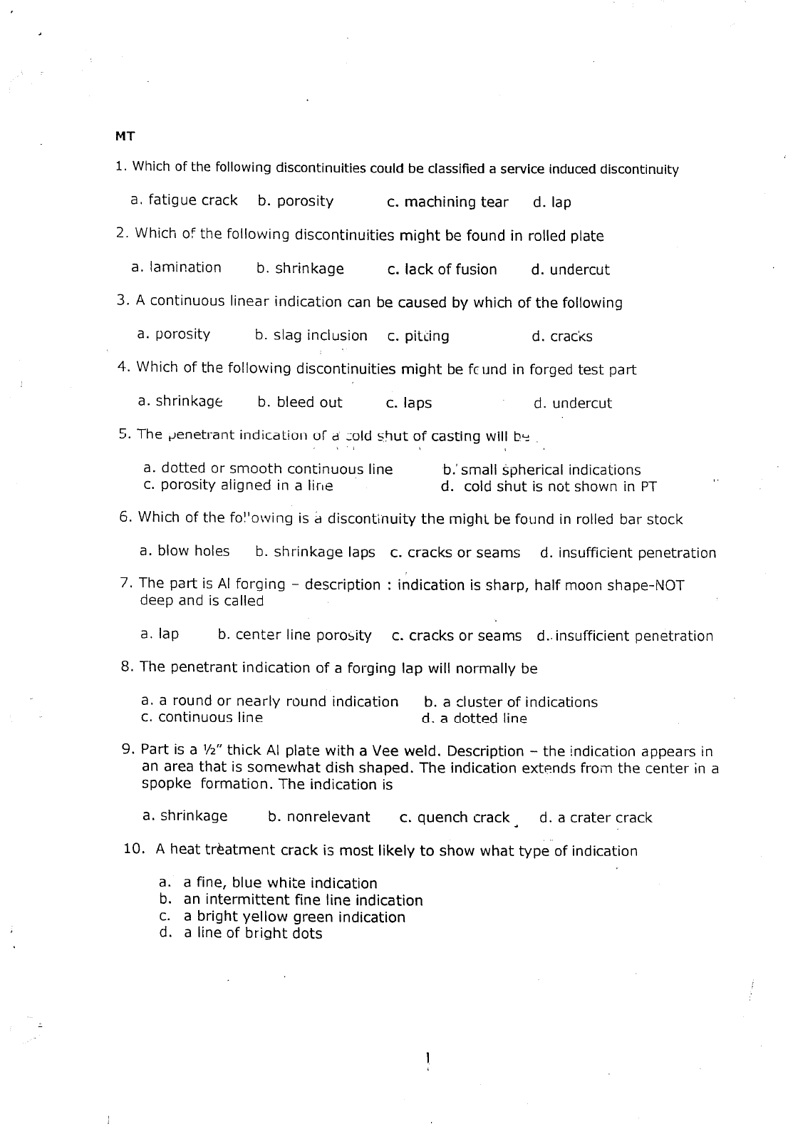 MT 1. Which of the following discontinuities could be classified a service induced discontinuity a. fatigue crack b. porosity C. machining tear d. lap 2. Which of the following discontinuities might be found in rolled plate a. lamination b. shrinkage C. lack of fusion d. undercut 3. A continuous linear indication can be caused by which of the following a. porosity b. slag inclusion C. pitting d. cracks 4. Which of the following discontinuities might be und in forged test part a. shrinkage b. bleed out C. laps d. undercut 5. The penetrant indication of a cold shut of casting will by a. dotted or smooth continuous line b. small spherical indications C. porosity aligned in a line d. cold shut is not shown in PT 6. Which of the owing is a discontinuity the might be found in rolled bar stock a. blow holes b. shrinkage laps C. cracks or seams d. insufficient penetration 7. The part is forging - description : indication is sharp, half moon shape-NOT deep and is called a. lap b. center line porosity C. cracks or seams d. insufficient penetration 8. The penetrant indication of a forging lap will normally be a. a round or nearly round indication b. a cluster of indications C. continuous line d. a dotted line 9. Part is a thick AI plate with a Vee weld. Description - the indication appears in an area that is somewhat dish shaped. The indication extends from the center in a spopke formation. The indication is a. shrinkage b. nonrelevant C. quench crack d. a crater crack 10. A heat treatment crack is most likely to show what type of indication a. a fine, blue white indication b. an intermittent fine line indication C. a bright yellow green indication d. a line of bright dots11. Which one of th following is not probably from a fatigue crack a. a fine line of dots b. a fine, straight line C. an area 0 fine sharp indications d. a fine, sh irp and jagged or forked indication 12. A defect can Iso be which of the following a. discontinu ty b. blemish C. flaw d. all of the above 13. Which of the llowing discontinuities would not be revealed in penetrant testing crater crack b. forging lap grinding cracks d. nometallic inclusions 14. Penetrant may not show which of the following a. inclusions b. bursts d. quench cracks 15. Which of the following welding methods would not equire the removal slag and oxides prior to the penetrant indication a. metal inert gas b. rod weld C. submergeu arc d. electroslag welds e. all of the above needs precleaning 1. Which one of the following is ferromagnetic a. a nickel alloy b. a copper alloy C. a low carbon steel both a & C 2. The magnetic lines of force contained in a permagnet magnet leave from the higher magnetic permeability to lower at a. at northe pole b. at south pole C. at both poles d. it cannot leave the magnet 3. In a current carrying conductor, the magnetic lines of force is always perpendicular to the direction of current and the field strength is maximum at a. at the center of the conductor b. at the surface of the C. only on the surface of a ferromagnetic conductor d. maximum at the inner surface of a nonmagnetic conductor 4. A permanent magnet always produce a. a circular field b. a longitudinal field C. a vector field d. direction on the direction of placement of the magnet on the job 5. Which of the steels mentioned below is difficult to magnetize: a. steel with low carbon content b. steel with very high permeability steel with very low permeability and generally less than 100 steel before to heat treatment6. AC meter shows 1000 amps. The actual current passed on the job is: b. 1.14 times the meter reading 1.41 times the meter reading d. 1.41 times less than that read on the meter is S: me as read on the meter 18. The recomme nded I rod spacing is: a. above inch b. below 3 inch c. betwee ! 3 and 8 inch d. below inch. 19. In order to detect defects in different directions in a material by magnetic particle inspection, it best to use: a. two or more fields in different directions b. only one field but with varying current density other probe locations d. with different frequencies 20. An example of a nonrelevant indication that would be classed as a magnetic irregularity rather than an actual discontinuity could be caused by: a. a slag packet b. grinding cracks an abrupt change in the hardness of part d. none of the above 21. Reluctance in the magnetic circuit can be compared to in n AC circuit f. inductance g. impedance h. resistance i. inductive reactance 22. A 90 inch long and 5 inch dia is to be tested using coil magnetization. For best results which one of the following would you recommend, j. 4 equal segments and using the formula NI=45000/(L/D) k. 5 equal segments and using the formula NI=45000/(L/D) with enough overlap and with more than 5 coil shots. 1. 3 equal shots and completely wrapping the coil m. cannot be tested. 23. If an overall pattern (sometimes circular lines) appears on the test surfaces, how should the inspector reprocess the test piece? a. retest at a higher amps. b. demagnetize and retest retest at lower amperage compare Que d both a and b 24 What happens to a magnetic material when it reaches to curie temperature? a. it becomes paramagnetic b. it becomes dia magnetic it becomes nonmagnetic compare with d. it becomes radioactive 10. 325. MT equipmer has got maximum capacity of 1500 mps. If it is desired to magnetize job with solenoid how many turns are required to test a bar of 15 inch long an 3 inch in dia. 5 b. 6 turns C. 71 d. 8 turns 26. Which one of them would produce a strong external poles a. shaft tested with head shot b. ! shaft tested with central conductor shaft tested with coild shot d. shaft tested with direct method of magnetization by passing current on the job in the direction of long axis 27. The most magnetic properties of powder for magnetic icle testing is a. low permeability and high retentivity b. high permeability and low retentivity c. high permeability d. low retentivity 28. The depth of of a magnetizing curre