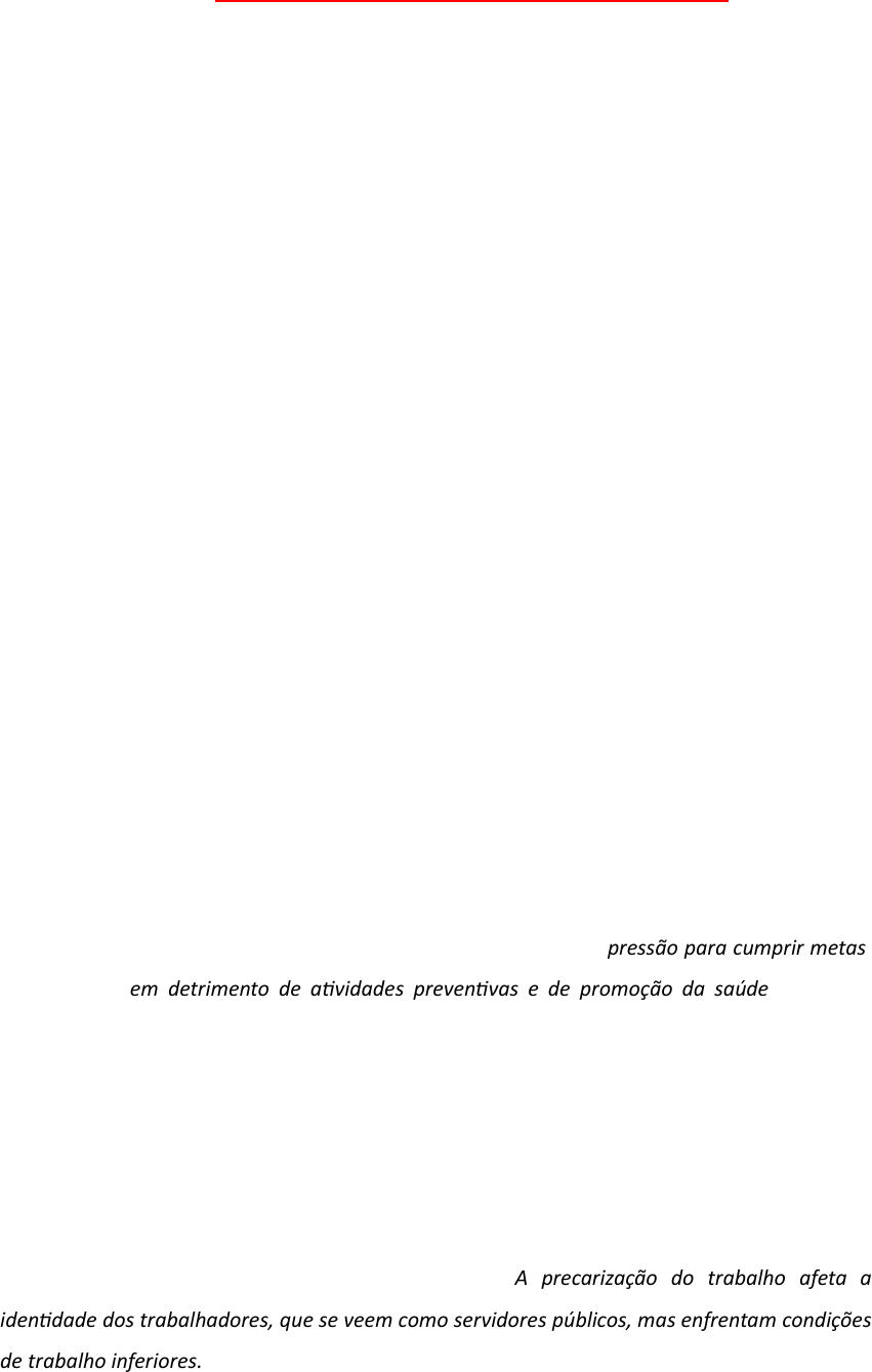 Precarização das relações de trabalho O artigo "Trabalho e precarização na saúde pública" analisa a experiência de trabalhadores terceirizados em uma cidade do interior de São Paulo durante um período de demissões em massa. Utilizando a metodologia de "Campo-Tema", a pesquisa envolveu observação de atos públicos, atividades dos trabalhadores e entrevistas. Os resultados mostram que os trabalhadores aceitaram a terceirização por falta de alternativas e se identificam como servidores públicos, alinhados com os princípios do SUS. A precariedade do emprego e a iminência do desemprego geram sofrimento tanto pessoal quanto profissional, afetando a qualidade do serviço prestado à população. A pesquisa destaca a naturalização da terceirização, a sensação ilusória de estabilidade e o desrespeito da administração municipal, além da omissão do sindicato. A situação resultou em desgaste mental e precariedade subjetiva, prejudicando tanto os trabalhadores quanto os usuários do SUS. As implicações da terceirização na saúde pública, conforme discutido no artigo, incluem: 1. Precarização do Trabalho: Os trabalhadores terceirizados enfrentam condições de trabalho mais precárias, com salários menores e menos benefícios em comparação aos servidores públicos concursados. 2. Instabilidade e Insegurança: A iminência de demissões e a falta de estabilidade no emprego geram insegurança e sofrimento entre os trabalhadores, afetando sua saúde mental e desempenho profissional. 3. Desassistência à População: A instabilidade no emprego e a redução do número de trabalhadores impactam negativamente a qualidade e a continuidade dos serviços de saúde prestados à população. 4. Desgaste Mental: A situação de precariedade e a pressão para cumprir metas, muitas vezes em detrimento de atividades preventivas e de promoção da saúde, levam ao desgaste mental dos trabalhadores. 5. Desrespeito e Desvalorização: Os trabalhadores terceirizados sentem-se desrespeitados e desvalorizados pela administração municipal, o que agrava o sentimento de insegurança e insatisfação no trabalho. 6. Falta de Reconhecimento: A ausência de reconhecimento e a percepção de desigualdade em relação aos trabalhadores concursados geram frustração e desmotivação. 7. Impacto na Identidade Profissional: A precarização do trabalho afeta a identidade dos trabalhadores, que se veem como servidores públicos, mas enfrentam condições de trabalho inferiores. inara Realce inara Realce inara Realce Essas implicações mostram que a terceirização na saúde pública não só prejudica os trabalhadores, mas também compromete a qualidade dos serviços oferecidos à população. A precarização das relações de trabalho na saúde refere-se ao processo de deterioração das condições de trabalho e dos direitos dos profissionais de saúde, o que impacta diretamente a qualidade dos serviços prestados à população. Esse fenômeno ocorre quando os trabalhadores enfrentam condições de trabalho desfavoráveis, inseguras e instáveis, que prejudicam sua saúde física e mental, além de comprometer a eficácia e a continuidade do atendimento. Aqui estão os principais aspectos que caracterizam a precarização do trabalho na saúde: 1. Informalidade e Falta de Estabilidade: • Contratos temporários ou terceirizados: Muitos profissionais de saúde, como médicos, enfermeiros e técnicos, são contratados de forma temporária ou como prestadores de serviços por meio de terceirização (pessoa jurídica - PJ), o que impede o acesso a direitos trabalhistas garantidos pela legislação, como férias, 13º salário, licença remunerada, e aposentadoria. • Instabilidade no emprego: Contratos sem vínculo permanente ou com prazos curtos geram insegurança para os profissionais, que ficam sujeitos a dispensas frequentes, sem garantias de continuidade no trabalho. 2. Baixos Salários e Benefícios: • Os profissionais de saúde, especialmente os em áreas periféricas e mais carentes, muitas vezes recebem salários baixos, abaixo do esperado para a carga de trabalho exigida. • A falta de bons pacotes de benefícios (como assistência à saúde, seguro de vida e outros), somada à falta de valorização profissional, pode afetar a motivação e a qualidade do atendimento oferecido. 3. Excesso de Carga de Trabalho e Jornadas Extensas: • Sobrecarga de trabalho é uma realidade para muitos profissionais de saúde, que enfrentam turnos exaustivos e jornadas de trabalho muito longas, sem a devida compensação. Isso pode resultar em fadiga, estresse e burnout (esgotamento profissional), prejudicando o bem-estar dos trabalhadores e a qualidade do cuidado prestado aos pacientes. 4. Falta de Capacitação e Desenvolvimento Profissional: • A precarização também se reflete na falta de oportunidades de treinamento e especialização para os trabalhadores da saúde, o que limita o crescimento profissional inara Realce inara Realce inara Realce inara Realce inara Realce e a atualização sobre as melhores práticas de cuidado. A falta de uma formação contínua impacta a qualidade do atendimento prestado. 5. Condições de Trabalho Insatisfatórias: • A infraestrutura inadequada, como unidades de saúde com equipamentos antiquados, falta de materiais médicos e escassez de recursos humanos, é um fator que agrava as condições de trabalho na saúde. Essas condições dificultam o desempenho das funções de maneira eficaz e segura. • Profissionais que atuam em condições precárias, com estruturas desorganizadas ou em unidades de saúde superlotadas, acabam expostos ao risco de erros médicos, prejudicando a saúde do paciente e, muitas vezes, a sua própria. 6. Falta de Autonomia Profissional: • A falta de autonomia dos profissionais de saúde, especialmente no contexto de sistemas de saúde mais burocratizados ou em organizações sociais, onde decisões podem ser tomad