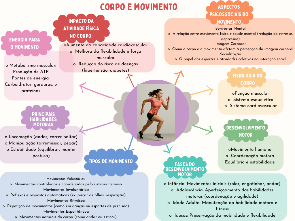 CORPO E MOVIMENTO ASPECTOS PSICOSSOCIAIS DO IMPACTO DA MOVIMENTO ATIVIDADE FÍSICA Bem-estar Mental: NO CORPO: A relação entre movimento físico e saúde mental (redução do estresse, ENERGIA PARA depressão) oAumento da capacidade cardiovascular Imagem Corporal: MOVIMENTO Melhora da flexibilidade e força Como corpo movimento afetam a percepção da imagem corporal Socialização: muscular O papel dos esportes e atividades coletivas na interação social O Metabolismo muscular: Redução do risco de doenças Produção de ATP (hipertensão, diabetes) FISIOLOGIA DO Fontes de energia: Carboidratos, gorduras, e CORPO proteínas oFunção muscular Sistema esquelético Sistema cardiovascular PRINCIPAIS HABILIDADES MOTORAS DESENVOLVIMENTO Locomoção (andar, correr, saltar) MOTOR Manipulação (arremessar, pegar) Estabilidade (equilibrar, manter oMovimento humano postura) Coordenação motora TIPOS DE MOVIMENTO FASES DO Equilíbrio e estabilidade DESENVOLVIMENTO MOTOR Movimentos Voluntários: Movimentos controlados e coordenados pelo sistema nervoso Infância: Movimentos iniciais (rolar, engatinhar, andar) Movimentos Involuntários: Adolescência: Aperfeiçoamento das habilidades Reflexos e respostas automáticas (ex: piscar de olhos, respiração) motoras (coordenação e agilidade) Movimentos Rítmicos: Idade Adulta: Manutenção da habilidade motora e Repetição de movimentos (como em danças ou esportes de precisão) fitness Movimentos Espontâneos: Movimentos naturais do corpo (como andar ou esticar) Idosos: Preservação da mobilidade e flexibilidade