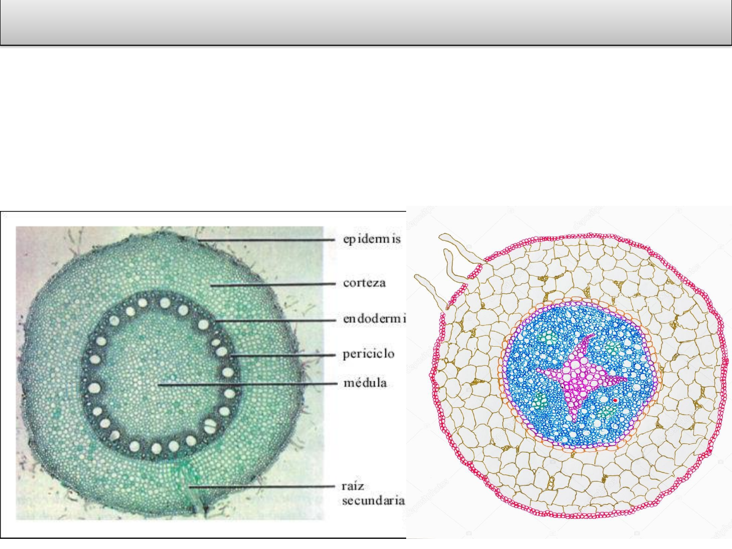 Regiões: • Revestimento (superficial) • Córtex • Cilindro central ou vascular Anatomia da raiz em crescimento primário 1. Revestimento - Epiderme (rizoderme) geralmente unisseriada, com presença de pêlos (região pilífera) Parênquima cortical EXODERME: tecido subepidérmico que se forma na região onde houve a queda dos tricomas Córtex da raiz 2. CÓRTEX a) Parênquima cortical b) Endoderme Detalhe da endoderme ENDODERME: (endo=dentro) - camada de células justapostas - presença de estrias de Caspary (suberina) nas paredes transversais e radiais - barreira de entrada de material via apoplasto - local de controle e seleção de substâncias para o cilindro central 3. Cilindro central ou vascular - Periciclo (atividade meristemática) – forma raízes laterais - Sistema vascular xilema floema raiz lateral periciclo EN Cilindro vascular Corte transversal da raiz primária de Mandevilla velutina. Ep = epiderme; Pr = pêlos radicular; Ex = exoderme; Pc = parênquima cortical; En = endoderme; P = periciclo; Xp = xilema primária; Fp = floema primário. - Xilema e floema alternados - Xilema: maturação centrípeta (EXARCO) e forma projeções (arcos) - Xilema se diferencia até o centro da raiz - Ex. Eudicotiledôneas e gimnospermas Características do sistema vascular: - Algumas monocotiledôneas: Centro da raiz ocupado por parênquima medular Raiz pentarca de morangueiro Oliveira e Machado (2009) - raízes tuberosas – estruturas secundárias não-usuais Variações no crescimento secundário Ex: Cenoura – Daucus carota a) Proliferação de parênquima nos tecidos vasculares secundários Proliferação de parênquima nos tecidos vasculares secundários bem como de floema b) Câmbios acessórios (supranuméricos) Câmbio vascular Câmbio acessório Ex: beterraba - Beta vulgaris