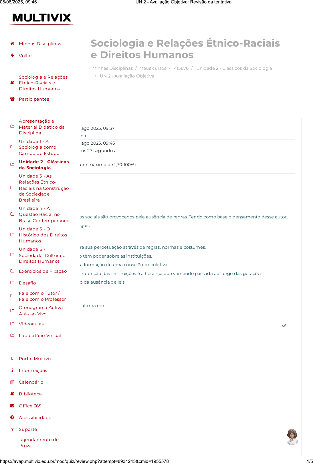 Minhas Disciplinas / Meus cursos / 415876 / Unidade 2 - Clássicos da Sociologia / UN 2 - Avaliação Objetiva Sociologia e Relações Étnico-Raciais e Direitos Humanos Iniciado em sexta, 8 ago 2025, 09:37 Estado Finalizada Concluída em sexta, 8 ago 2025, 09:45 Tempo empregado 8 minutos 27 segundos Avaliar 1,70 de um máximo de 1,70(100%) Questão 1 Correto Atingiu 0,34 de 0,34 Para Durkheim, os conflitos sociais são provocados pela ausência de regras. Tendo como base o pensamento desse autor, analise as afirmações a seguir. I. A sociedade assegura sua perpetuação através de regras, normas e costumes. II. As regras sociais não têm poder sobre as instituições. III. As leis determinam a formação de uma consciência coletiva. IV. O que garante a manutenção das instituições é a herança que vai sendo passada ao longo das gerações. V. Os conflitos são fruto da ausência de leis É correto apenas o que se afirma em Escolha uma opção: a. I, III, IV, V. b. I, IV, V. c. I, II, V. d. II, III, IV, V. e. I, III, V. Minhas Disciplinas Voltar Sociologia e Relações Étnico-Raciais e Direitos Humanos Participantes Apresentação e Material Didático da Disciplina Unidade 1 - A Sociologia como Campo de Estudo Unidade 2 - Clássicos da Sociologia Unidade 3 - As Relações Étnico- Raciais na Construção da Sociedade Brasileira Unidade 4 - A Questão Racial no Brasil Contemporâneo Unidade 5 - O Histórico dos Direitos Humanos Unidade 6 - Sociedade, Cultura e Direitos Humanos Exercícios de Fixação Desafio Fale com o Tutor / Fale com o Professor Cronograma Aulives – Aula ao Vivo Videoaulas Laboratório Virtual Portal Multivix Informações Calendário Biblioteca Office 365 Acessibilidade Suporte Agendamento de Prova 08/08/2025, 09:46 UN 2 - Avaliação Objetiva: Revisão da tentativa https://avap.multivix.edu.br/mod/quiz/review.php?attempt=8934245&cmid=1955578 1/5 https://avap.multivix.edu.br/my/ https://avap.multivix.edu.br/course/view.php?id=36019 https://avap.multivix.edu.br/course/view.php?id=36019§ion=3 https://avap.multivix.edu.br/mod/quiz/view.php?id=1955578 https://avap.multivix.edu.br/my/ https://avap.multivix.edu.br/course/view.php?id=36019 https://avap.multivix.edu.br/user/index.php?id=36019 https://avap.multivix.edu.br/course/view.php?id=36019§ion=1 https://avap.multivix.edu.br/course/view.php?id=36019§ion=2 https://avap.multivix.edu.br/course/view.php?id=36019§ion=3 https://avap.multivix.edu.br/course/view.php?id=36019§ion=4 https://avap.multivix.edu.br/course/view.php?id=36019§ion=5 https://avap.multivix.edu.br/course/view.php?id=36019§ion=6 https://avap.multivix.edu.br/course/view.php?id=36019§ion=7 https://avap.multivix.edu.br/course/view.php?id=36019§ion=8 https://avap.multivix.edu.br/course/view.php?id=36019§ion=9 https://avap.multivix.edu.br/course/view.php?id=36019§ion=10 https://avap.multivix.edu.br/course/view.php?id=36019§ion=11 https://avap.multivix.edu.br/course/view.php?id=36019§ion=12 https://avap.multivix.edu.br/course/view.php?id=36019§ion=13 https://avap.multivix.edu.br/hooks/portal/ https://avap.multivix.edu.br/mod/page/view.php?id=1252%2F%22%20target%3D%22_blank https://avap.multivix.edu.br/calendar/view.php/ https://avap.multivix.edu.br/local/staticpage/view.php?page=biblioteca https://multivix.edu.br/office-365/ https://multivix.edu.br/acessibilidade/ https://avap.multivix.edu.br/mod/page/view.php?id=7%2F%22%20target%3D%22_blank https://docs.google.com/forms/d/e/1FAIpQLSfyH1O0KRhpI8B0cFqDv3aXT41lziF0mULzRNTBk2x0miNkNA/viewform https://avap.multivix.edu.br/ https://avap.multivix.edu.br/ https://avap.multivix.edu.br/ https://avap.multivix.edu.br/ https://avap.multivix.edu.br/ https://avap.multivix.edu.br/ Questão 2 Correto Atingiu 0,34 de 0,34 Max Weber é considerado um dos principais autores da Sociologia. Seus estudos sobre a sociedade causaram grande impacto nas Ciências Sociais. Em relação às teorias de Max Weber, analise as afirmações a seguir. I. Sua biografia é marcada por uma grande produção intelectual. II. Max Weber, embora bastante reconhecido, nunca se envolveu em movimentos sociais e/ou políticos. III. Weber defendia que a riqueza deve ser sempre condenada. IV. Para Weber não havia nenhuma relação entre protestantismo e capitalismo. V. Max Weber, observando os Estados Unidos, conclui que se tratava de uma grande sociedade capitalista. É correto apenas o que se afirma em Escolha uma opção: a. II, III e IV. b. II, III, IV e V. c. I e IV. d. I e V. e. I, III, IV e V. Minhas Disciplinas Voltar Sociologia e Relações Étnico-Raciais e Direitos Humanos Participantes Apresentação e Material Didático da Disciplina Unidade 1 - A Sociologia como Campo de Estudo Unidade 2 - Clássicos da Sociologia Unidade 3 - As Relações Étnico- Raciais na Construção da Sociedade Brasileira Unidade 4 - A Questão Racial no Brasil Contemporâneo Unidade 5 - O Histórico dos Direitos Humanos Unidade 6 - Sociedade, Cultura e Direitos Humanos Exercícios de Fixação Desafio Fale com o Tutor / Fale com o Professor Cronograma Aulives – Aula ao Vivo Videoaulas Laboratório Virtual Portal Multivix Informações Calendário Biblioteca Office 365 Acessibilidade Suporte Agendamento de Prova 08/08/2025, 09:46 UN 2 - Avaliação Objetiva: Revisão da tentativa https://avap.multivix.edu.br/mod/quiz/review.php?attempt=8934245&cmid=1955578 2/5 https://avap.multivix.edu.br/my/ https://avap.multivix.edu.br/course/view.php?id=36019 https://avap.multivix.edu.br/user/index.php?id=36019 https://avap.multivix.edu.br/course/view.php?id=36019§ion=1 https://avap.multivix.edu.br/course/view.php?id=36019§ion=2 https://avap.multivix.edu.br/course/view.php?id=36019§ion=3 https://avap.multivix.edu.br/course/view.php?id=36019§ion=4 https://avap.multivix.edu.br/course/view.php?id=36019§ion=5 https://avap.multivix.edu.br/course/view.php?id=36019§ion=6 https://avap.multivix.edu.br/course/view.php?id=36019§ion=7 https://avap.multivix.edu.br/c