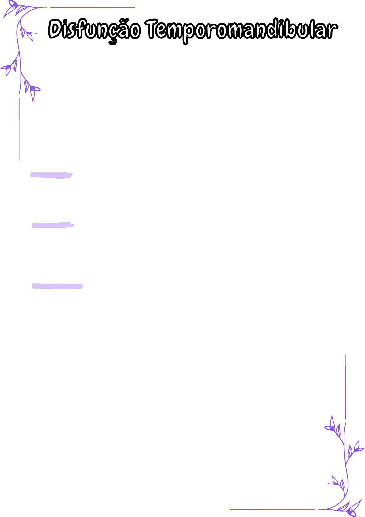 Disfunção TemporomandibularDisfunção Temporomandibular A disfunção temporomandibular (DTM) é um termo abrangente que inclui uma série de problemas relacionados aos músculos mastigatórios e à articulação temporomandibular (ATM), que liga o maxilar ao crânio. A ATM permite movimentos essenciais, como falar, mastigar, bocejar e outras funções relacionadas à mandíbula. Quando essa articulação não funciona corretamente, pode surgir a DTM, caracterizada por dor e limitações funcionais. Conceito: •É a principal causa de dor não-dental na região orofacial. Causas: • Estresse; • Má postura; • Bruxismo (ranger ou apertar os dentes); • Desalinhamento da mandíbula; • Traumas na região da mandíbula; As causas da DTM são multifatoriais e podem ser divididas em três grandes categorias: • Mecânicas: - Desalinhamento da mordida (má oclusão) ou problemas no encaixe dos dentes. - Bruxismo (ranger ou apertar os dentes) que coloca estresse sobre a articulação. - Desgaste da cartilagem da ATM, que pode ocorrer com o tempo ou devido a doenças como artrite. - Trauma ou lesão na mandíbula, como uma pancada forte ou acidente. • Musculares: - Sobrecarga dos músculos mastigatórios devido à tensão constante. - Estresse emocional, que pode resultar em aumento da contração muscular ao redor da mandíbula. - Postura inadequada, principalmente ao usar dispositivos eletrônicos, que pode forçar a musculatura cervical e mandibular. • Outros fatores: - Doenças sistêmicas como artrite reumatoide e doenças autoimunes podem afetar a ATM. - Fatores psicológicos como ansiedade e depressão também podem intensificar os sintomas da DTM. De modo geral: Sinais e sintomas: • Variam em intensidade e frequência, atingem os músculos da mastigação, ATM e todas as estruturas associadas, podendo incluir: • Dor facial ou mandibular: Pode ser localizada na área ao redor da orelha e se estender ao maxilar, pescoço e ombros. • Dores de cabeça. • Estalos ou crepitações: Sons de estalo, clique ou sensação de ranger ao mover a mandíbula. • Dificuldade em abrir ou fechar a boca: Em alguns casos, a mandíbula pode “travar” em uma posição aberta ou fechada. • Dor ao mastigar: Desconforto ao comer alimentos duros ou mastigar por longos períodos. • Sensibilidade nos dentes: Embora não haja um problema dentário evidente, o paciente pode sentir os dentes doloridos. • Zumbido no ouvido ou sensação de ouvido cheio: Isso pois o distúrbio pode afetar os nervos ao redor da ATM. Desordens Musculares: Desordens Articulares: • Mialgia; • Dor Miofascial; • Trismo; • Espasmo Muscular; • Miosite; • Remodelamento; • Disco deslocado com redução; • Disco deslocado sem redução; • Disco aderido; • Luxação; • Anquilose; • Osteoartrite; • Osteoartrose; • Neoplasias, aplasias, hiperplasias, hipoplasia; Mialgia: • Termo médico usado para descrever dor muscular. Ela pode ocorrer em qualquer músculo do corpo e ter diversas causas, que variam desde o esforço físico excessivo até doenças sistêmicas. A dor pode ser localizada em um músculo específico ou generalizada em vários músculos. • Dor imprecisa, forte contínua ou intermitente, localizada na área muscular que piora com a função. • Sensibilidade a palpação e ao toque, encontrada no mínimo em um lugar. • Sensação de rigidez ou fadiga muscular. • A amplitude de movimento pode não ser afetada. Dor miofascial: • Tipo de dor crônica que afeta os músculos e o tecido conjuntivo que os envolve, chamado fáscia. Essa dor geralmente é causada por pontos-gatilho (trigger points), que são áreas tensas dentro dos músculos que, quando pressionadas, causam dor local e também irradiada para outras partes do corpo. • Dor imprecisa, forte contínua ou intermitente, localizada na área muscular que piora com a função. • Sensibilidade em pontos de gatilhos, localizadas em áreas parecidas com faixas ou cordas dentro do músculo. • Padrão de dor referida à palpação. • Abertura restrita. • Rigidez e sensação de “nós” nos músculos afetados. • Dificuldade de movimentação ou fadiga muscular. • Possível formigamento ou sensação de queimação nas áreas afetadas. Trismo: • Dificuldade ou incapacidade de abrir completamente a boca, também conhecido como “trava de mandíbula”. • Resulta de uma contração involuntária dos músculos mastigatórios, muitas vezes acompanhada de dor, que pode limitar a abertura da boca. • Não é uma doença em si, mas um sintoma de várias condições. Espasmo muscular: • Contração involuntária e súbita de um músculo ou grupo de músculos, que pode causar dor intensa e desconforto temporário. • Geralmente ocorrem de forma repentina e podem durar de alguns segundos a vários minutos, afetando qualquer músculo do corpo, mas são bastante comuns no pescoço. Miosite: • Inflamação dos músculos esqueléticos, que pode causar fraqueza, dor muscular e, em alguns casos, incapacidade de realizar movimentos normais. • Existem vários tipos que podem ser causados por infecções, doenças autoimunes, medicamentos ou outras condições subjacentes. • Pode afetar um único músculo ou um grupo muscular, e sua gravidade varia de leve a grave. Remodelamento: • Refere-se às mudanças que ocorrem nas estruturas ósseas e nos tecidos da articulação temporomandibular ao longo do tempo, em resposta a forças ou lesões. • Alteração da forma do côndilo, eminência e disco. • O remodelamento pode ser um processo adaptativo natural do corpo ou uma consequência de condições patológicas, como disfunção temporomandibular (DTM), traumas, ou doenças articulares. •Estalo estável (ocorre na mesma amplitude de abertura) que com manipulação fica mais alto. •Desvio em abertura. Disco deslocado: • Envolve o deslocamento do disco, que é uma estrutura fibrosa que age como um amorte