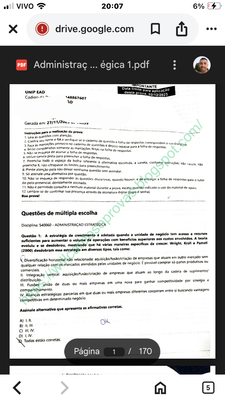 VIVO 20:07 6% X ! drive.google.com PDF Administraç égica 1.pdf Data limite IMPORTANTE Para aplicação UNIP EAD desta prova: 02/12/2023 io Gerada em: 27/11/202 Instruções para realização da prova: 1. as questões com Confira e RA e verifique se o caderno de questão e folha de respostas correspondem sua disciplina 3. Faça as marcações primeiro no de questões e depois repasse para a de 4. Serão consideradas somente as marcações feitas na folha de respostas 5. se de assinar a de respostas 6. Utilize caneta preta para preencher a folha de 7. Preencha todo 0 espaço da bolha referente alternativa a conforme instruções: não não preencha não ultrapasse as limites para 8. Preste atenção para não deixar nenhuma questão 9. uma alternativa por 10. Não se esqueça de responder as questões quando e de entregar a folha de respostas para tutor do polo devidamente assinada 11. Não permitido consulta a nenhum material durante a exceto quando indicado uso do material de Boa Questões de múltipla escolha 12. Lembre-se de confirmar sua presença através da assinatura digital (login e Disciplina: 540060 ADMINISTRAÇÃO ESTRATEGICA Questão 1: A estratégia de crescimento é adotada quando a unidade de negócio tem acesso a recursos suficientes para aumentar volume de operações com beneficios superiores aos custos envolvidos. A teoria evoluiu e se desdobrou, mostrando que há várias maneiras de crescer. Wright, Kroll e Pamell (2000) desdobram essa estratégia em diversos tipos, tais como: Diversificação horizontal não relacionada: aquisição/fusão/criação de empresas que atuam em outro mercado sem qualquer relação com os mercados atendidos pelas unidades de negócio. possivel comprar só partes produtivas ou Integração aquisição/fusão/criação de empresas que atuam ao longo da cadeia de suprimento/ Fusões união de duas mais empresas em uma nova para ganhar competitividade por sinergia e compartilhamento. Alianças estratégicas: parcerias em que duas ou mais empresas diferentes cooperam entre si buscando vantagens competitivas em determinado negócio. Assinale alternativa que apresenta as afirmativas corretas. A) fl. OK B) III. C) IV. D) I, IV. Todas estão corretas. Página 1 / 170 5