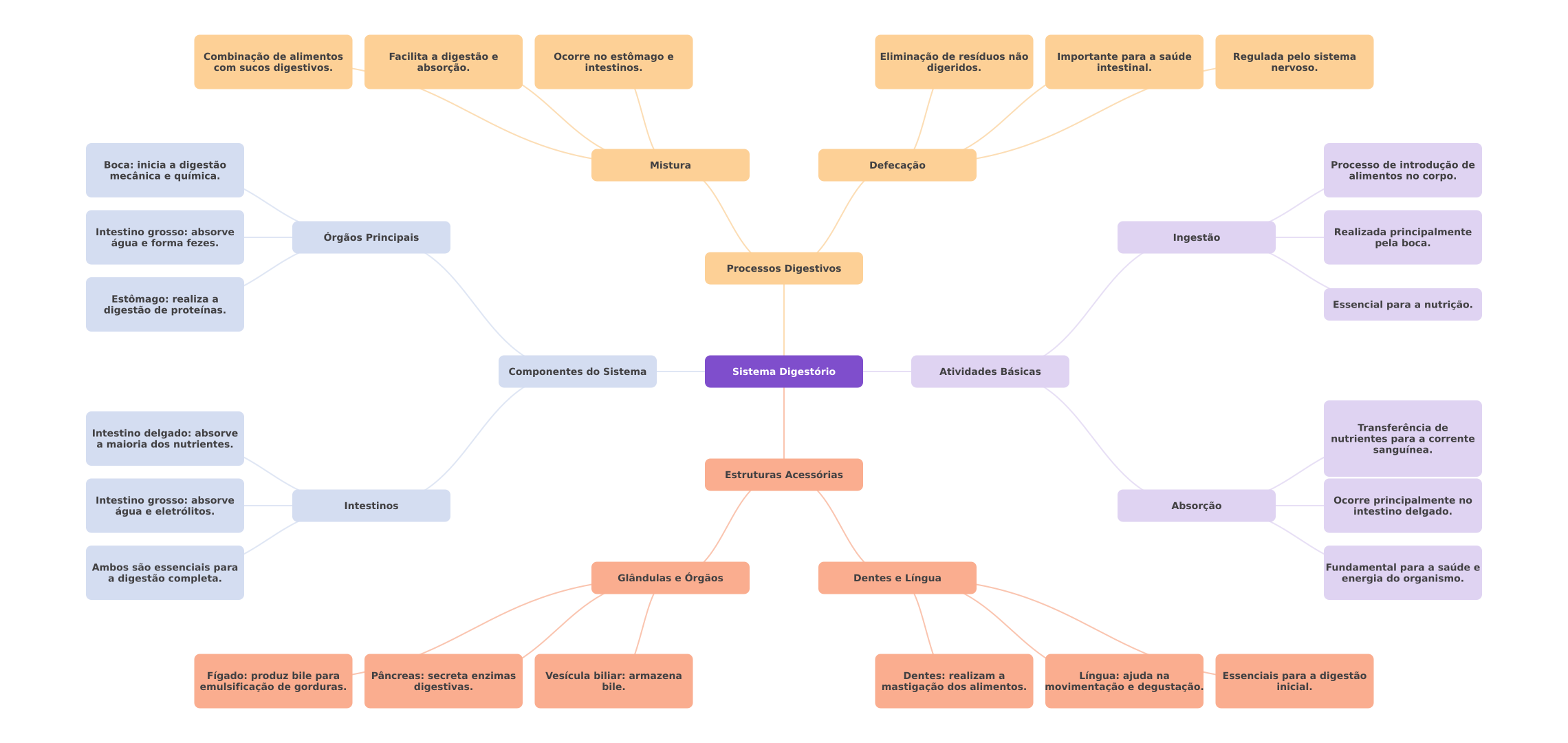 Combinação de alimentos Facilita a digestão e Ocorre no estômago e Eliminação de resíduos não Importante para a saúde Regulada pelo sistema com sucos digestivos. absorção. intestinos. digeridos. intestinal. nervoso. Boca: inicia a digestão Mistura Defecação Processo de introdução de mecânica e química. alimentos no corpo. Intestino grosso: absorve água e forma fezes. Órgãos Principais Ingestão Realizada principalmente pela boca. Processos Digestivos Estômago: realiza a digestão de proteínas. Essencial para a nutrição. Componentes do Sistema Sistema Digestório Atividades Básicas Transferência de Intestino delgado: absorve a maioria dos nutrientes. nutrientes para a corrente sanguínea. Estruturas Acessórias Intestino grosso: absorve Intestinos Absorção Ocorre principalmente no água e eletrólitos. intestino delgado. Ambos são essenciais para Fundamental para a saúde e a digestão completa. Glândulas e Órgãos Dentes e Língua energia do organismo. Fígado: produz bile para Pâncreas: secreta enzimas Vesícula biliar: armazena Dentes: realizam a Língua: ajuda na Essenciais para a digestão emulsificação de gorduras. digestivas. bile. mastigação dos alimentos. movimentação e degustação. inicial.
