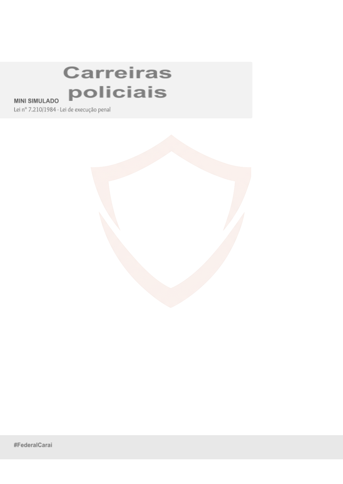 Prova objetiva “A persistência é o caminho do êxito.” Charles Chaplin 1. Assinale a alternativa que não está de acordo com as disposições da Lei de Execução Penal (Lei nº 7.210/1984). A) A Comissão Técnica de Classificação, existente em cada estabelecimento, será presidida pelo diretor e composta, no mínimo, por 2 (dois) chefes de serviço, 1 (um) psiquiatra, 1 (um) psicólogo e 1 (um) assistente social, quando se tratar de condenado à pena privativa de liberdade. B) O condenado ao cumprimento de pena privativa de liberdade, em regime fechado, será obrigatoriamente submetido a exame criminológico para a obtenção dos elementos necessários a uma adequada classificação e com vistas à individualização da execução. C) O trabalho do preso será remunerado, mediante prévia tabela, não podendo ser inferior a 3/4 (três quartos) do salário mínimo. D)O condenado que cumpre a pena em regime fechado ou semiaberto poderá remir, por trabalho ou por estudo, parte do tempo de execução da pena. 2. A Lei de Execução Penal (Lei nº 7.210/1984) dispõe sobre o RDD (Regime Disciplinar Diferenciado). Com base no art. 52 da referida lei, marque a alternativa correta. A) As entrevistas são sempre monitoradas, até mesmo as com o defensor. B) É direito do preso a saída da cela por 2 (duas) horas diárias para banho de sol, em grupos de até 4 (quatro) presos, desde que não haja contato com presos de grupos criminosos. C) Após os primeiros 3 (três) meses de regime disciplinar diferenciado, o preso que não receber visita poderá, após prévio agendamento, ter contato telefônico, que será gravado, com uma pessoa da família, 2 (duas) vezes por mês e por 10 (dez) minutos. D) Existindo indícios de que o preso exerce liderança em organização criminosa, associação criminosa ou milícia privada, ou que tenha atuação criminosa em 2 (dois) ou mais Estados da Federação, o regime disciplinar diferenciado será obrigatoriamente cumprido em estabelecimento prisional federal. 3. O Conselho Nacional de Política Criminal e Penitenciária tem como membros professores e profissionais da área do Direito Penal, Processual Penal, Penitenciário e ciências correlatas, bem como por representantes da comunidade e dos Ministérios da área social. Com isso, é possível afirmar que não incumbe ao Conselho Nacional de Política Criminal e Penitenciária: A) Zelar pelo correto cumprimento da pena e da medida de segurança. B) Elaborar programa nacional penitenciário de formação e aperfeiçoamento do servidor. C) Inspecionar e fiscalizar os estabelecimentos penais. D) Estimular e promover a pesquisa criminológica. 4. De acordo com a Lei 7.210/1984, é correto afirmar que: A) Os condenados que cumprem pena em regime semiaberto poderão obter autorização para saída temporária do estabelecimento, com vigilância direta. B) O Conselho Penitenciário é órgão consultivo e fiscalizador da execução da pena. C) Em caso de falta grave, o juiz poderá revogar até 2/3 (dois terços) do tempo remido. D) A autoridade administrativa encaminhará semestralmente ao juízo da execução cópia do registro de todos os condenados que estejam trabalhando ou estudando. 5. De acordo com a seção VI da Lei nº 7.210/1984, qual das alternativas abaixo indica quando o juiz não pode determinar o uso da monitoração eletrônica? A) Para determinar a prisão domiciliar. B) Para conceder o livramento condicional. C) Para autorizar a saída temporária no regime aberto. D) Para aplicar pena restritiva de direitos que estabeleça limitação de frequência a lugares específicos. 6. Colaborar com unidades federativas com o intuito de realizar cursos de formação dos agentes penitenciários e de ensino profissionalizante dos condenados e dos internados é atribuição de quem? A) Conselho da Comunidade B) Conselho Penitenciário C) Patronato D) Departamento Penitenciário Nacional 7. Em relação aos estabelecimentos penais abordados na Lei nº 7.210/1984, indique a opção correta: A) A cadeia pública destina-se ao condenado à pena de reclusão. B) O Centro de Observação destina-se aos inimputáveis e semi-imputáveis. C) A penitenciária destina-se ao condenado à pena de reclusão, nos regimes fechado e semiaberto. D) A Colônia Agrícola, Industrial ou Similar destina-se ao cumprimento da pena em regime semiaberto. 8. De acordo com as decisões do STF e do STJ em relação à Lei de Execução Penal, marque a alternativa correta: A) O percentual a ser aplicado para a progressão de regime de condenado por crime hediondo ou equiparado, sem morte, que seja reincidente por crime comum é de 45%. B) A competência para a execução penal é definida pela lei local de organização judiciária e, na sua ausência, pelo juiz das garantias. C) É possível reconhecer a ocorrência de falta grave no curso da execução penal, independentemente do trânsito em julgado da condenação criminal por fato definido como crime doloso. D) O STF decidiu que não é possível extinguir o processo contra condenado que cumpriu a pena de prisão, sem pagar a pena de multa estipulada pela Justiça. 9. Os artigos 120 e 121 da Lei 7.210/1984 indicam as condições para a permissão de saída e para a saída temporária. Levando em consideração os artigos citados, avalie as afirmativas a seguir e assinale (V) para a verdadeira e (F) para a falsa. ( ) Os condenados que cumprem pena em regime fechado ou semiaberto e os presos provisórios poderão obter permissão para sair do estabelecimento, mediante escolta, quando for visitar a família. ( ) A permissão de saída será concedida pelo juiz da execução. ( ) Os condenados que cumprem pena em regime semiaberto poderão obter autorização para saída temporária do estabelecimento, com vigilância direta, para frequentar curso supletivo profissionalizante, bem como de instrução do 2º grau ou superior, na Comarca do Juízo da Execução. ( ) A permiss