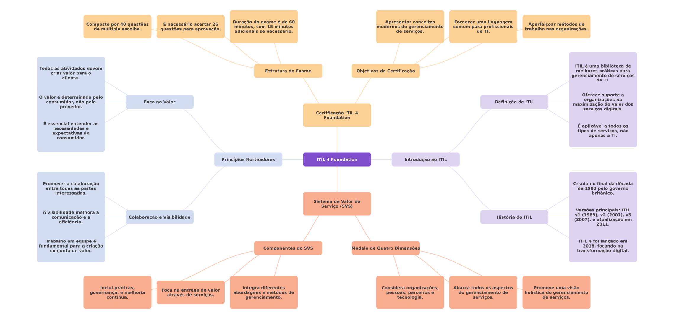 É necessário acertar 26 Duração do exame é de 60 Composto por 40 questões Apresentar conceitos Fornecer uma linguagem minutos, com 15 minutos de múltipla escolha. modernos de gerenciamento comum para profissionais Aperfeiçoar métodos de questões para aprovação. adicionais se necessário. de serviços. de TI. trabalho nas organizações. ITIL é uma biblioteca de Todas as atividades devem Estrutura do Exame criar valor para Objetivos da Certificação melhores práticas para cliente. gerenciamento de serviços de TI valor é determinado pelo Oferece suporte a consumidor, não pelo Foco no Valor Definição de ITIL organizações na maximização do valor dos provedor. serviços digitais. Certificação ITIL 4 Foundation É essencial entender as É aplicável a todos os necessidades e expectativas do tipos de serviços, não consumidor. apenas à TI. Princípios Norteadores ITIL 4 Foundation Introdução ao ITIL Promover a colaboração Criado no final da década entre todas as partes de 1980 pelo governo interessadas. britânico. Sistema de Valor do Serviço (SVS) A visibilidade melhora a Versões principais: ITIL comunicação ea Colaboração e Visibilidade História do ITIL v1 (1989), v2 (2001), v3 eficiência. (2007), e atualização em 2011. Trabalho em equipe é ITIL 4 foi lançado em fundamental para a criação Modelo de Quatro Dimensões 2018, focando na conjunta de valor. Componentes do SVS transformação digital. Inclui práticas, Foca na entrega de valor Integra diferentes Considera organizações, Abarca todos os aspectos Promove uma visão governança, e melhoria através de serviços. abordagens e métodos de pessoas, parceiros e do gerenciamento de holística do gerenciamento contínua. gerenciamento. tecnologia. serviços. de serviços.