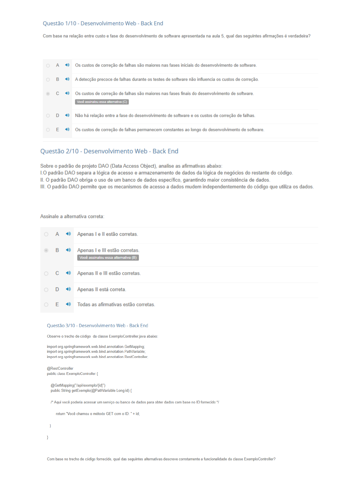 Questão 1/10 Desenvolvimento Web Back End Com base na relação entre custo e fase do desenvolvimento de software apresentada na aula 5, qual das seguintes afirmações é verdadeira? A Os custos de correção de falhas são maiores nas fases iniciais do desenvolvimento de software. A detecção precoce de falhas durante os testes de software não influencia custos de correção. Os custos de correção de falhas são maiores nas fases finais do desenvolvimento de software. Você assinalou essa alternativa (C) D Não há relação entre a fase do desenvolvimento de software e os custos de correção de falhas. E Os custos de correção de falhas permanecem constantes ao longo do desenvolvimento de software. Questão 2/10 Desenvolvimento Web Back End Sobre 0 padrão de projeto DAO (Data Access Object), analise as afirmativas abaixo: padrão DAO separa a lógica de acesso e armazenamento de dados da lógica de negócios do restante do código. II. 0 padrão DAO obriga 0 uso de um banco de dados específico, garantindo maior consistência de dados. III. 0 padrão DAO permite que mecanismos de acesso a dados mudem independentemente do código que utiliza dados. Assinale a alternativa correta: A Apenas e estão corretas. Apenas e III estão corretas. Você assinalou essa alternativa (B) Apenas e III estão corretas. D Apenas está correta. E Todas as afirmativas estão corretas. Questão 3/10 Desenvolvimento Web Back End Observe 0 trecho de código da classe java abaixo: import springframework web bind import org.springframework.web.bind.annotation.PathVariable; import @RestController public class ExemploController { @GetMapping("/api/exemplo/{id}") public String getExemplo(@PathVariable Long id) { Aqui você poderia acessar um serviço ou banco de dados para obter dados com base no ID fornecido */ return "Você chamou método GET com 0 ID: + id; Com base no trecho de código fornecido, qual das seguintes alternativas descreve corretamente a funcionalidade da classe ExemploController?A A classe ExemploController define um método que responde a solicitações HTTP POST na URL /api/exemplo/{id}. A classe ExemploController utiliza a anotação @PostMapping para mapear solicitações HTTP GET para 0 método getExemplo. A classe ExemploController define um método que responde a solicitações HTTP GET na URL /api/exemplo/{id} e retorna uma mensagem contendo 0 ID fornecido na Você assinalou essa alternativa (C) D método getExemplo da classe ExemploController não aceita nenhum parâmetro. E A anotação @PathVariable é usada para mapear a URL para um objeto JSON no método getExemplo. Questão 4/10 Desenvolvimento Web Back End Quais das seguintes características descrevem corretamente as classes de serviço no Spring MVC? A São responsáveis por gerenciar a interface gráfica e a interação com 0 usuário. Encapsulam a lógica de negócios da aplicação, realizando operações como validação de dados e cálculos. Você assinalou essa alternativa (B) Armazenam diretamente os dados no banco de dados sem a utilização de repositórios. D Promovem a reutilização de lógica de negócios e não podem ser injetadas em outras classes. E Não podem ser injetadas em outras partes da aplicação devido à falta de suporte para Injeção de Dependência. Questão 5/10 Desenvolvimento Web Back End Ler em voz alta Com base no gerenciamento de transações para garantir 0 sucesso das operações, qual dos seguintes exemplos representa corretamente uma transação bem gerenciada? A Atualizar 0 saldo de uma conta bancária sem verificar se a transferência foi concluída com sucesso. Realizar um pagamento online e registrar 0 pedido no sistema, mas sem garantir que ambos foram bem-sucedidos. Iniciar uma transação para transferir fundos entre duas contas e, em caso de falha, deixar as contas com saldos inconsistentes. D Atualizar múltiplos registros em um banco de dados, mas sem garantir que todas as atualizações ocorram ou nenhuma. E Realizar uma transferência de fundos entre contas e, em caso de falha, reverter todas as operações para manter a consistência do sistema. Você assinalou essa alternativa (E) Questão 6/10 Desenvolvimento Web Back End Ler em voz alt Qual das alternativas a seguir descreve corretamente uma tecnologia de Web Services? A HTTP (HyperText Transfer Protocol): Protocolo de comunicação usado para a transferência de páginas web, sem suporte para operações de serviços web. XML (Extensible Markup Language) é uma linguagem de programação projetada para armazenar e transportar dados. C SOAP (Simple Object Access Protocol):Protocolo de mensagens baseado em XML usado para a troca de informações estruturadas na implementação de serviços web. Você assinalou essa alternativa (C) D REST (Representational State Transfer): é um estilo de arquitetura criada para projetos Java. A sua versão mais atual é conhecida como E JSON (JavaScript Object Notation): é um formato de estrutura de dados baseado na linguagem Java, componente do framework Spring.Questão 7/10 Desenvolvimento Web Back End Qual das seguintes alternativas NÃO está em conformidade com os critérios para uma API ser considerada do tipo RESTful? A AAPI deve ter uma arquitetura cliente/servidor com solicitações gerenciadas por HTTP. A comunicação entre cliente e servidor deve ser stateful, armazenando informações do cliente entre as solicitações. Você assinalou essa alternativa (B) AAPI deve permitir 0 armazenamento de dados em cache para otimizar as interações entre cliente e servidor. D AAPI deve ter uma interface uniforme com recursos identificáveis e mensagens autodescritivas. E AAPI pode possibilitar código sob demanda, permitindo que 0 servidor envie código executável ao cliente. Questão 8/10 Desenvolvimento Web Back End Ler em voz Com base nos tipos de teste de software vistos na aula 5 são feitas as seguintes afirmativas: 1.0 Teste de Sistema verifica se todos os requisitos est