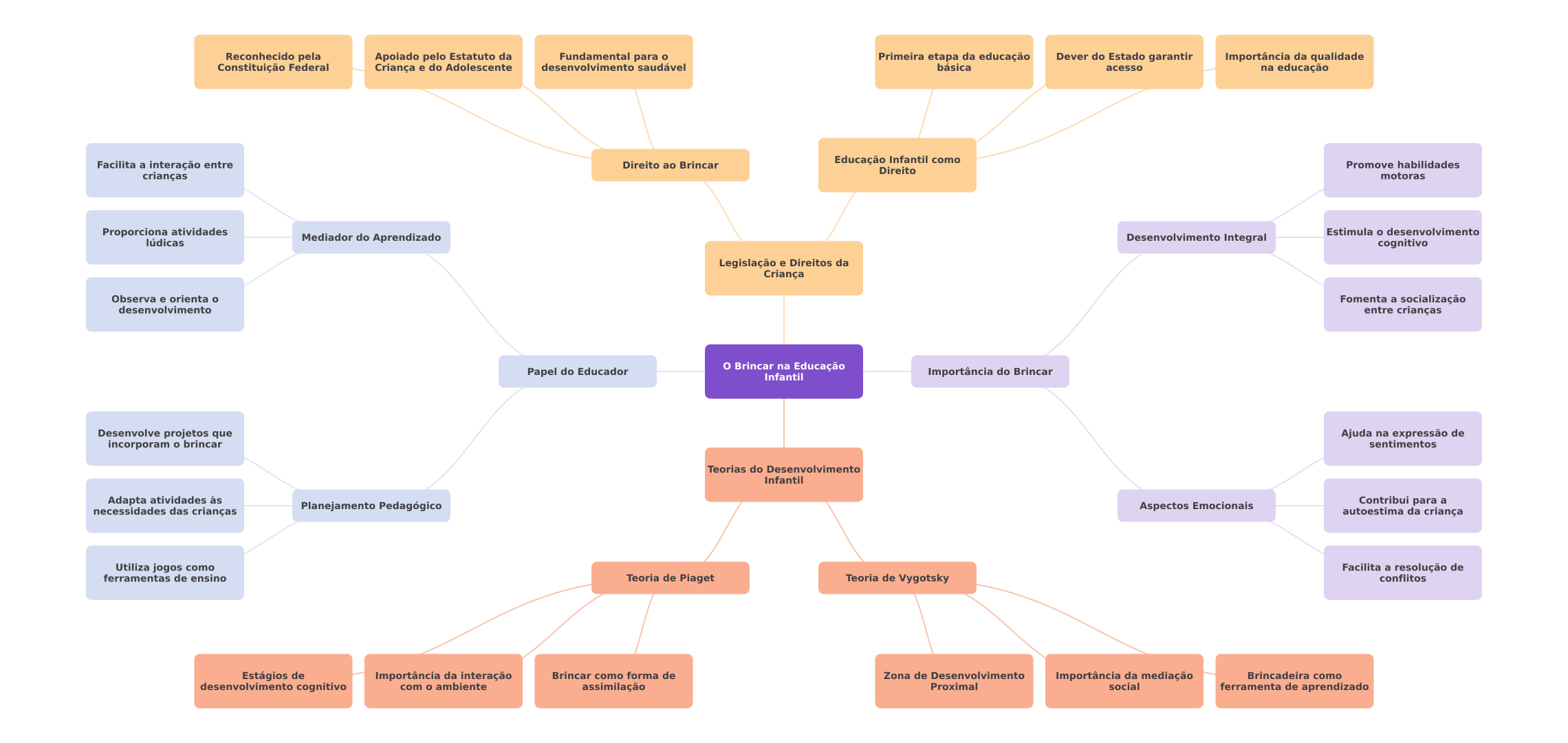 Reconhecido pela Apoiado pelo Estatuto da Fundamental para Primeira etapa da educação Dever do Estado garantir Importância da qualidade Constituição Federal Criança e do Adolescente desenvolvimento saudável básica acesso na educação Facilita a interação entre Direito ao Brincar Educação Infantil como Promove habilidades Direito crianças motoras Proporciona atividades Estimula desenvolvimento lúdicas Mediador do Aprendizado Desenvolvimento Integral cognitivo Legislação e Direitos da Criança Observa e orienta Fomenta a socialização desenvolvimento entre crianças Papel do Educador Brincar na Educação Infantil Importância do Brincar Desenvolve projetos que Ajuda na expressão de incorporam brincar sentimentos Teorias do Infantil Adapta atividades às necessidades das crianças Planejamento Pedagógico Aspectos Emocionais Contribui para a autoestima da criança Utiliza jogos como Facilita a resolução de ferramentas de ensino Teoria de Piaget Teoria de Vygotsky conflitos Estágios de Importância da interação Brincar como forma de Zona de Importância da mediação Brincadeira como cognitivo com ambiente assimilação Proximal social ferramenta de aprendizado