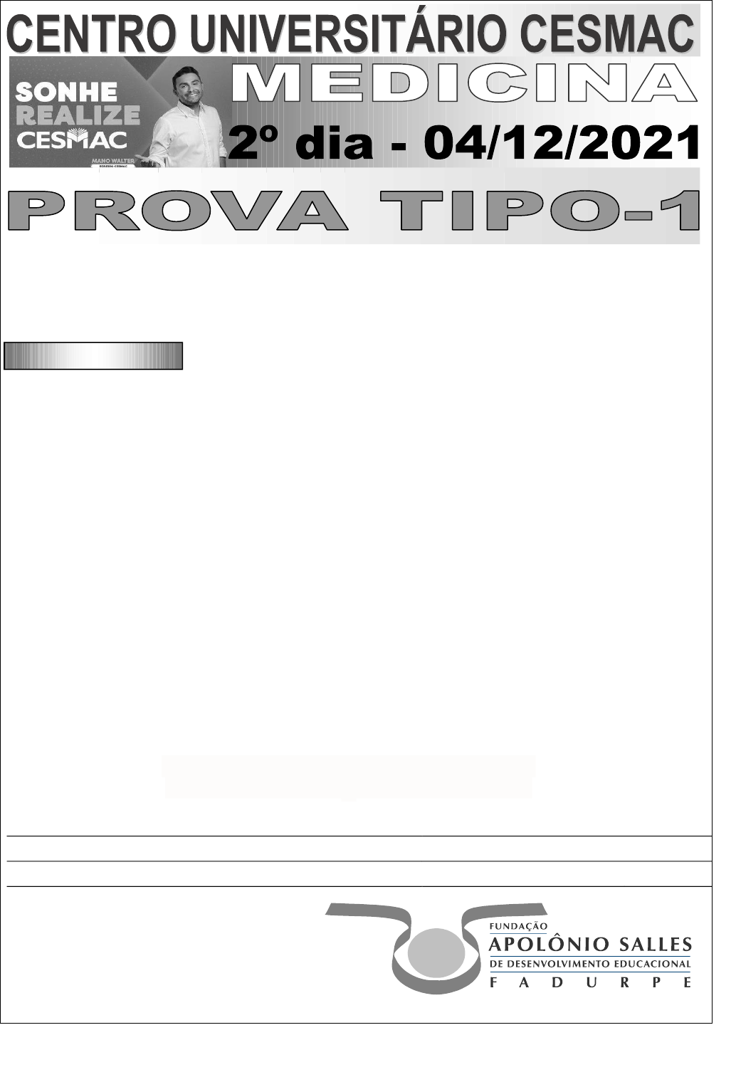 PROVA TIPO 1 Nome: Inscrição: Identidade: Órgão Expedidor: Assinatura: Sala: 01 - Verifique se o CADERNO DE QUESTÕES contém 60 questões. Caso contrário, reclame ao fiscal da sala um outro caderno completo. Não serão aceitas reclamações posteriores. 02 - Observe a numeração do CARTÃO-RESPOSTA, pois o cartão serve para responder a um grupo de até 100 (cem) questões, devendo ser utilizadas as 60 (sessenta) iniciais. 03 - O CARTÃO-RESPOSTA deve apresentar seu número de inscrição impresso e o TIPO DE PROVA. 04 - Confira seu CARTÃO-RESPOSTA e, caso observe alguma divergência, avise ao fiscal. 05 - Assine o CARTÃO- RESPOSTA no lugar indicado. 06 - Em cada questão, escolha a alternativa que responde corretamente ao que se pede. Preencha, então, no CARTÃO-RESPOSTA, a janela que corresponde à alternativa escolhida, com caneta esferográfica azul, após a devida conferência. 07 - Só preencha o CARTÃO-RESPOSTA, após decidir-se, em definitivo, com relação à alternativa. Para o cômputo da prova, são equivalentes as respostas erradas, nulas ou em branco. 08 - Ao término da prova, o candidato devolverá à mesa de fiscalização o CADERNO DE QUESTÕES e o CARTÃO-RESPOSTA devidamente assinados. Se não o fizer, será eliminado do Processo Seletivo. 09 - Após conferência pela mesa do material entregue, o candidato assinará a Lista de Presença. 10 - Transcreva o texto abaixo para o CARTÃO RESPOSTA. “Há dois objetivos na educação médica: curar os doentes e promover a ciência” .” LEIA COM ATENÇÃO BIOLOGIA – QUÍMICA – MATEMÁTICA – FÍSICA PROVA TIPO 1 BIOLOGIA 01. Há cerca de 10 mil anos, o hábito de beber leite pela espécie humana era raro. Os bebês produzem a enzima lactase, que permite a digestão da lactose do leite materno. Porém, após terminada a fase de amamentação, muitas pessoas se tornam intolerantes a este açúcar. No norte da Europa, uma forma mutante do gene da lactase ocorre em alta frequência, a qual permite que esta enzima continue ativa na idade adulta. Essa mutação é bem mais rara em populações da África, da Ásia e em índios americanos. Fonte: Adaptado de https://www.bbc.com/portuguese/vert-cap- 47599056 A partir destas informações e considerando seus conhecimentos sobre a teoria evolutiva, tal como é aceita hoje, é correto afirmar que: A) o consumo contínuo do leite pela população humana tem provocado o aumento de pessoas tolerantes à lactose. B) a mutação que favorece a forma ativa da lactose na vida adulta deve ter ocorrido com o propósito de beneficiar alguns grupos étnicos. C) em algumas populações, a mutação que favorece a forma ativa da lactose na vida adulta deve ter sido favoravelmente selecionada. D) nos grupos étnicos com alta porcentagem de intolerantes à lactose, o aumento das atividades de pecuária leiteira deverá aumentar o número de pessoas tolerantes à lactose. E) a deriva genética, direcionada pela adaptação, levará ao aumento da frequência da forma mutante do gene da lactose em algumas populações da África, da Ásia e em Índios americanos. 02. No Brasil, a Fundação Oswaldo Cruz (Fiocruz) fabrica a vacina com a tecnologia da Oxford-AstraZeneca, utilizada para o combate do Covid-19. Analise o esquema abaixo, que se refere ao seu processo de produção: Figura modificada de https://noticias.r7.com/saude/vacina-de- oxford-traz-tecnologia-nunca-usada-em-larga-escala-11082020 É possível concluir que a vacina da Oxford- AstraZeneca é produzida por: A) terapia gênica. B) transgenia. C) tecnologia do RNA mensageiro. D) clonagem. E) inativação do Sars-Cov-2. 03. A fibrose cística é uma doença genética de herança autossômica recessiva, que afeta principalmente os pulmões, o pâncreas e o sistema digestivo. Pessoas com a doença produzem muco mais espesso que o usual, o qual propicia a proliferação de micro- organismos nas vias respiratórias, podendo causar infecções, como pneumonia e bronquite. Considere o heredograma abaixo de uma família com casos desta doença, nos quais os homens e as mulheres afetados estão representados, respectivamente, pelos quadrados e círculos em cinza: 1 2 3 4 1 2 3 4 1 2 1 I) II) III) IV) Com base na análise do heredograma, é possível concluir que: A) o casal representado na linha III tem 100% de chance de ter filhos com fibrose cística. B) o indivíduo I-3 é homozigoto dominante para o gene da fibrose cística. C) os indivíduos I-1 e III-2 têm o mesmo genótipo para fibrose cística. D) o casal representado pelos indivíduos II-1 e II-2 tem 25% de probabilidade de gerar filhos com fibrose cística. E) o casal representado pelos indivíduos I-3 e I-4 tem 75% de probabilidade de ter filhos sem fibrose cística. 04. A anemia é uma doença que afeta cerca de 30% da população do planeta, sendo ocasionada pela deficiência nos níveis de hemoglobina no sangue. Sobre os glóbulos vermelhos humanos, considere as seguintes afirmativas: 1) sofrem replicação do DNA na fase S da interfase. 2) permitem o transporte de oxigênio para os tecidos. 3) atuam no combate de alergias e infecções. 4) apresentam uma proteína que dá cor ao sangue. Estão corretas: A) 1, 2, 3 e 4. B) 1, 2 e 3, apenas. C) 2 e 3, apenas. D) 2 e 4, apenas. E) 3 e 4, apenas. PROVA TIPO 1 05. Em junho de 2021, pesquisadores publicaram um estudo sobre a descoberta de etanolamina (NH2CH2CH2OH) no espaço. Essa molécula é um dos componentes dos fosfolipídios que constituem a membrana celular. (https://www.pnas.org/content/pnas/118/22/e2101314118.full.pdf) Essa descoberta é uma evidência de que: A) formas simples de vida estão presentes fora do planeta Terra, corroborando com a teoria da panspermia sobre a origem da vida. B) os átomos obtidos no experimento de Stanley Miller e Harold Urey podem ter-se originado por biogênese fora da Terra. C) a vida iniciou a partir de moléculas inorgânicas, que se tornaram cada vez mais complexas, tal como su