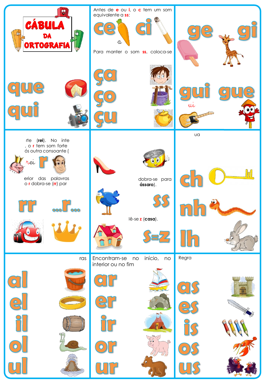 www.brunofernandesfichas.com Encontram-se muitas palavras com os grupos: Encontram-se no início, no interior ou no fim das palavras. Regra geral, os nomes terminados em vogal formam o plural acrescentando –s. Encontram-se, ainda, muitas palavras com os grupos: lagosta castelo espada lápis perus porco barco caverna circo urso caracol balde anel barril vulcão Na língua portuguesa, o h é uma letra que, isoladamente, não representa nenhum fonema. Pode surgir no início de certas palavras, no início ou no fim de algumas interjeições, ou nos dígrafos: chave minhoca coelho O grupo qu, antes de e ou i, representa um único fonema (aqui, aquele). máquina queijo ortografia da CAbula ´ O grafema g, quando antes de e ou i, pronuncia-se como j. Nas palavras com gue ou gui, o grafema já tem valor de g. guitarra girafa gelado foguete Antes de e ou i, o c tem um som equivalente a ss: Para manter o som ss, coloca-se cedilha sob a consoante c quando esta está antes de a, o ou u: cenoura cigarro cabeça poço açucareiro O r inicial numa palavra tem um som forte (rei). No interior da palavra, o r tem som forte quando está após outra consoante (genro). No interior das palavras, entre vogais, o r dobra-se (rr) para manter o som forte. O r, entre vogais, tem som brando. carro som forte coroa som brando rei genro som forte O s inicial de palavra tem sempre o som de ç (sapato). Depois de uma consoante, o s tem valor de ç (conserva). Entre vogais, o s dobra-se para manter o som de ç (pássaro). Entre vogais, o s lê-se z (casa). pássaro casa sapato conserva www.brunofernandesfichas.com São cinco os valores fonéticos de x: exército táxi explosão peixe Máximo Existem bastantes palavras em que podemos encontrar os grupos consonânticos: Existem, ainda, palavras com outros grupos consonânticos como: globo planta atleta flor bicicleta blusa estrela dragão grilo livro fruta cravo cobra prato O ditongo –ão é representado por –am apenas em formas verbais graves. comerão forma verbal aguda comeram forma verbal grave A nasalação é marcada por um til sobre a vogal (irmã)ou por um –n ou –m a seguir à vogal. Empregam-se no interior da palavra, desde que não esteja antes de p e b. Empregam-se no final da palavra e ainda antes de p e b. panda tenda pincel concha mundo tambor pudim bomba atum nuvem Muitas palavras terminam em: cabaz dez nariz noz capuz