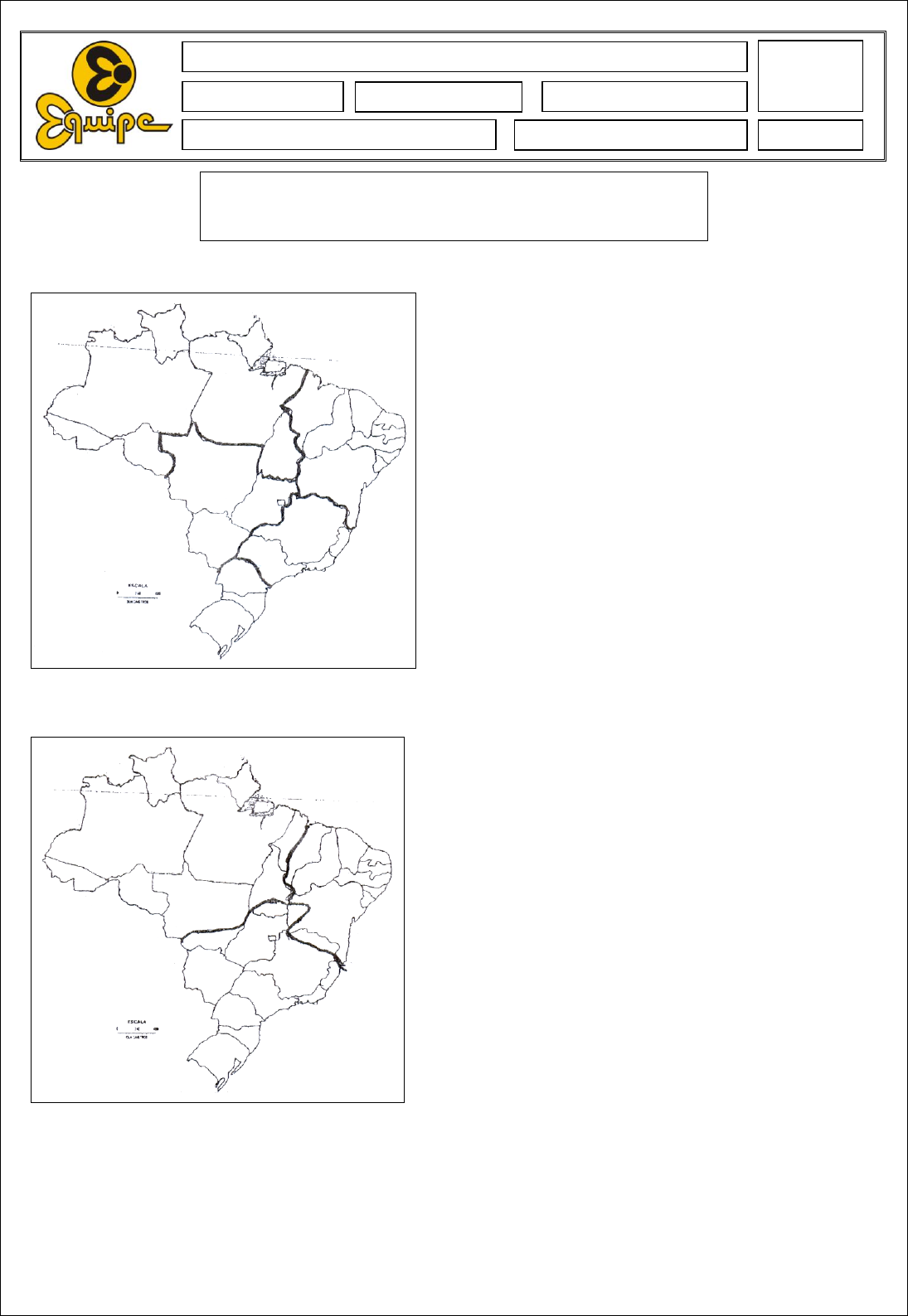 Sua prova deve ser feita à caneta azul ou preta. Não rasure e não use corretivo. Entregue no dia da prova. 1. Escreva os nomes das regiões brasileiras, dentro do mapa. Escreva também em sigla o nome dos estados. 2. Neste mapa, escreva as regiões geoeconômicas, dentro do mapa. Colora a região mais desenvolvida. 3. Quais os critérios utilizados para estudarmos a divisão do Brasil em cinco regiões brasileiras? Nota Professor(a): Regina Data: ___/12/2017 Aluno(a): nº: Turma: Matéria: Geografia Ano: 7º Ano E.F. Série Valor: 30,0 Trabalho Recuperação 4. Quais os critérios utilizados para estudarmos as regiões geoeconômicas?. 5. Escreva quatro características gerais da Região Sudeste. 6. Qual a vegetação e o clima predominantes da Região Sudeste? 7. Escreva em cinco tópicos a ocupação da Região Sudeste até à industrialização. 8. Quais os principais setores da produção industrial? 9. O que é tecnopolo? E qual seu objetivo? 10. Escreva dois motivos que fizeram a população da Região Sudeste crescer tanto? 11. Quais as consequências social e ambiental deste grande crescimento da Região Sudeste? 12. O que é megalópole? Como é a formação da megalópole localizada no Sudeste? 13. Quais as consequências para a Região Sul de estar localizada abaixo do Trópico de Capricórnio? 14. Quais os tipos de vegetação que predominam na Região Sul? 15. Quais as influências trazidas pelos imigrantes europeus para a Região Sul? 16. Por que a imigração européia se identificou tanto na região Sul? 17. Quais os fatores sociais que medem a qualidade de vida de um sulino? 18. O que levou a mudança, nas últimas décadas do século XX, do desenvolvimento econômico da Região Sul? 19. O que causou a mecanização na área agrícola da Região Sul? 20. Como o governo da Região Sul tentou resolver este grande problema social criado pela mecanização agrícola? 21. A região Centro-Oeste apresenta uma posição estratégica no país. Escreva com quais países ela faz fronteira e quais regiões do Brasil ela faz divisa. 22. Escreva três características gerais importantes da Região Centro- Oeste. 23. Quais as grandes diversidades biológicas da Região Centro- Oeste? 24. A construção de Brasília – capital do país – foi uma estratégia política nesta região ou apenas uma coincidência de localização? Justifique sua resposta. 25. No Centro-Oeste, qual a localização do Pantanal? 26. Fora do Brasil, onde e como se chama este complexo vegetativo? 27. Qual a atividade econômica, no século XVIII, que começou a impulsionar a ocupação no Centro-Oeste? 28. A partir do século XX, quais foram os fatores que realmente fizeram crescer a Região Centro-Oeste? 29. Quais os problemas causados pela expansão agropecuária no Centro-Oeste? 30. Quais as rodovias criadas pelo governo de maior importância que liga a Região Centro-Oeste ao resto do país?