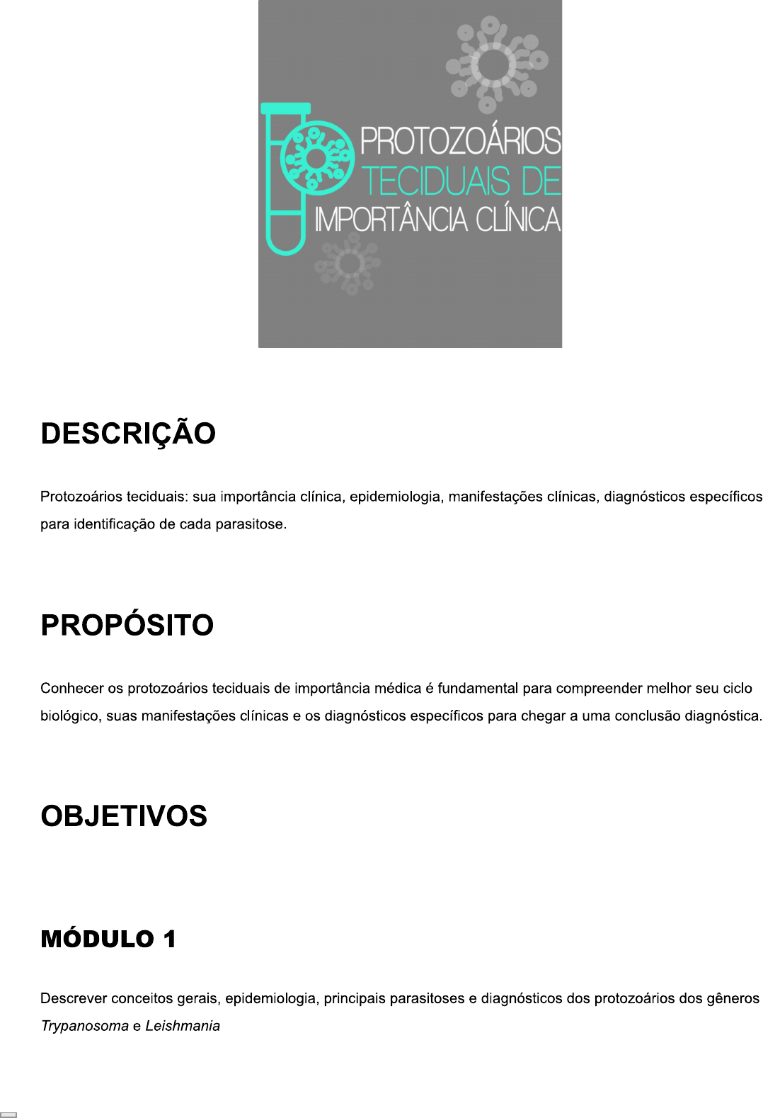 PROTOZOÁRIOS TECIDUAIS DE IMPORTÂNCIA CLÍNICA DESCRIÇÃO Protozoários teciduais: sua importância clínica, epidemiologia, manifestações clínicas, diagnósticos específicos para identificação de cada parasitose. PROPÓSITO Conhecer os protozoários teciduais de importância médica é fundamental para compreender melhor seu ciclo biológico, suas manifestações clínicas e os diagnósticos específicos para chegar a uma conclusão diagnóstica. OBJETIVOS MÓDULO 1 Descrever conceitos gerais, epidemiologia, principais parasitoses e diagnósticos dos protozoários dos gêneros Trypanosoma e LeishmaniaMÓDULO 2 Descrever conceitos gerais, epidemiologia, principais parasitoses e diagnósticos dos protozoários dos gêneros Toxoplasma e Plasmodium INTRODUÇÃO Os protozoários fazem parte do reino protista e somente quatro filos desse reino apresentam espécies importantes e que desenvolvem infecções parasitárias, conforme descritos a seguir: Filo Microspora Filo Sarcomastigophora Filo Apicomplexa Filo Ciliophora Esses seres são eucariontes (presença de núcleo definido), heterótrofos (não produzem seu próprio alimento) e unicelulares (consistem em apenas uma célula). Além dessas características, apresentam organelas que são responsáveis pelas funções de alimentação, nutrição e locomoção. Essas organelas recebem duas classificações: organelas dinâmicas e organelas estáticas. Os protozoários exercem todas as funções, como respiração, excreção e reprodução dentro dessa única célula. Os protozoários podem viver em diferentes condições, como na água, seja ela doce, seja salgada, limpa ou salobra, e até no fundo dos oceanos, podendo viver no solo ou na matéria orgânica em decomposição, sendo definidos como parasitas ou de vida livre. Os de vida livre são os que formam colônias e têm capacidade natatória. Os parasitas são diversos; podem ser endoparasitas, classificação dada aos que parasitam plantas, animais e homem, mas também existem os ectoparasitas, que parasitam apenas ambientes fora de um organismo. Ao longo deste tema, vamos aprender a importância clínica dos endoparasitas que causam lesões em tecidos humanos, focando nas seguintes espécies e doenças: Trypanosoma cruzi e doença de Chagas, Leishmania spp. e leishmaniose, Toxoplasma gondii e toxoplasmose; Plasmodium spp. e malária. Todas essas parasitoses são de grande interesse médico e consideradas negligenciadas pela Organização Mundial da Saúde (OMS). Vamos conhecê-las? FILO MICROSPORAApresenta esporos unicelulares. FILO SARCOMASTIGOPHORA Engloba os protozoários que têm capacidade de se locomover por flagelos e abrange os gêneros Trypanosoma, Leishmania, Giardia, Trichomonas, Entamoeba, Endolimax, lodamoeba, Acanthamoeba, Hartmannella, Naegleria e Vahlkampfia. FILO APICOMPLEXA Apresenta locomoção por deslizamento e é representado por parasitas obrigatórios (que precisam de um hospedeiro para sua sobrevivência). Inclui os gêneros Toxoplasma, Isospora, Sarcocystis, Cryptosporidium, Plasmodium e Babesia. FILO CILIOPHORA Desloca-se pelos batimentos dos cílios e só apresenta o gênero: Balantidium. ORGANELAS DINÂMICAS São responsáveis pela locomoção do parasita e podem receber nome de flagelos, pseudópodes e cílios.ORGANELAS ESTÁTICAS Podem ser divididas em externas membranas tecas, loricas, películas, parede císticas - e internas, conhecidas como axóstilos. MÓDULO 1 Descrever conceitos gerais, epidemiologia, principais parasitoses e diagnósticos dos protozoários dos gêneros Trypanosoma e Leishmania PROTOZOÁRIOS DOS GÊNEROS TRYPANOSOMA E LEISHMANIA Os trypanosomas e as Leishmanias pertencem aos gêneros da família Trypanosomatidae. São heteróxenos, ou seja, seu ciclo de vida apresenta mais de um hospedeiro, na maioria das vezes um para reprodução sexuada e outro para reprodução assexuada. São encontrados em vertebrados e apresentam vetores que se alimentam de sangue, que são chamados de hematófagos. A família dos é encontrada em diferentes formas de desenvolvimento, dependendo da classificação do seu gênero. São elas: Amastigotas Coanomastigotas Promastigotas Opistomastigotas Epimastigotas Tripomastigotas Essa classificação é dada de acordo com a posição das organelas, como o cinetoplasto (organela que tem função de fornecimento de energia) e os flagelos em relação ao núcleo.Direção da natação Posterior Anterior Amastigota Coanomastigota Promastigota Opistomastigota Epimastigota Tripomastigota Cinetoplasto Flagelo Núcleo Fonte: Wikimedia Commons/licença (CC BY 3.0...) Figura 1: Formas de desenvolvimento dos tripanossomatídeos. gênero Trypanosomas pode ser encontrado em diferentes hospedeiros, que são divididos em saliva e Stercoraria, de acordo com o tipo de transmissão e desenvolvimento nesses hospedeiros. A saliva é caracterizada por parasitas que têm parte do seu desenvolvimento no vetor e são transmitidos ao hospedeiro por inoculação no ato da picada. A Stercoraria é caracterizada por parasitas que se desenvolvem na parte anterior do intestino, e a contaminação acontece por meio de suas fezes; esse é o caso do Trypanosoma cruzi. gênero Leishmania consiste em um complexo de doenças com mais de 20 espécies de parasitas, que são intracelulares e apresentam duas formas de desenvolvimento - amastigotas e promastigotas multiplicam-se por divisões binárias e podem ser encontrados nas células do sistema fagocítico do hospedeiro ou no trato digestivo do vetor. Vamos agora conhecer um pouco mais sobre esses parasitas. TRYPANOSOMA CRUZI (T. CRUZI) T. cruzi, agente etiológico da doença de Chagas em humanos, está presente em diferentes hospedeiros vertebrados, como homem, os mamíferos silvestres e o gambá. Além disso, apresenta como hospedeiros invertebrados os triatomíneos, conhecidos popularmente como barbeiros, que são os vetores da doença. O parasito é transmitido pelo contado com a
