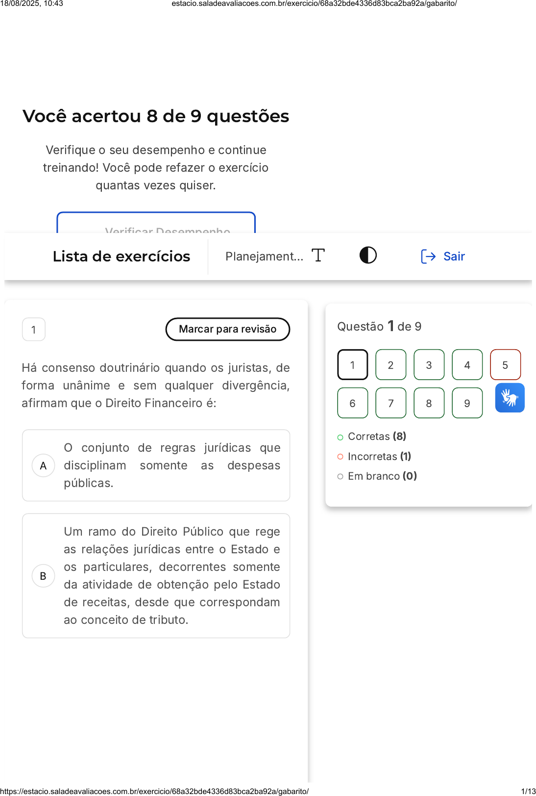 Você acertou 8 de 9 questões Verifique o seu desempenho e continue treinando! Você pode refazer o exercício quantas vezes quiser. Verificar Desempenho A B 1 Marcar para revisão Há consenso doutrinário quando os juristas, de forma unânime e sem qualquer divergência, afirmam que o Direito Financeiro é: O conjunto de regras jurídicas que disciplinam somente as despesas públicas. Um ramo do Direito Público que rege as relações jurídicas entre o Estado e os particulares, decorrentes somente da atividade de obtenção pelo Estado de receitas, desde que correspondam ao conceito de tributo. Questão 1 de 9 Corretas (8) Incorretas (1) Em branco (0) 1 2 3 4 5 6 7 8 9 Lista de exercícios Planejament… Sair 18/08/2025, 10:43 estacio.saladeavaliacoes.com.br/exercicio/68a32bde4336d83bca2ba92a/gabarito/ https://estacio.saladeavaliacoes.com.br/exercicio/68a32bde4336d83bca2ba92a/gabarito/ 1/13 C D E Um ramo do Direito Administrativo, porque, além de ser regulado pelos princípios administrativos, a organização dos serviços públicos, relacionados com a atividade financeira do Estado, é objeto do Direito Administrativo. Um ramo do Direito Econômico e tem por objeto a instituição, a arrecadação e a destinação das receitas não tributárias, mas, no tocante às receitas tributárias, é o Direito Tributário que cuida do aspecto da destinação delas. Um ramo do Direito Público, e seu objeto é o conjunto de princípios e normas jurídicas que se relaciona com a atividade financeira do Estado, ou seja, com as despesas públicas, as receitas públicas, o orçamento público e os créditos públicos. Resposta correta Parabéns, você selecionou a alternativa correta. Confira o gabarito comentado! Gabarito Comentado O Direito Financeiro é um ramo do Direito Público, cujo objeto é o conjunto de princípios e normas jurídicas que se relacionam com a atividade financeira do Estado. Isso inclui as despesas públicas, as receitas públicas, o orçamento público e os créditos públicos. Portanto, a alternativa correta abrange todos esses aspectos. As demais alternativas são parciais ou imprecisas, pois limitam o Direito 18/08/2025, 10:43 estacio.saladeavaliacoes.com.br/exercicio/68a32bde4336d83bca2ba92a/gabarito/ https://estacio.saladeavaliacoes.com.br/exercicio/68a32bde4336d83bca2ba92a/gabarito/ 2/13 A B C D E Financeiro a apenas uma parte de sua abrangência ou o associam a outros ramos do Direito de forma equivocada. 2 Marcar para revisão Sobre os créditos extraordinários, é CORRETO afirmar que: Só podem ser abertos por lei desde que ela tenha vigência temporária. Só se justificam para cobrir despesas urgentes e imprevistas em caso de guerra, comoção intestina ou calamidade pública. Tem cabimento a abertura desses créditos em qualquer situação que justifique a realização da despesa e quando não tenha havido uma dotação orçamentária específica. Podem ter vigência superior ao exercício financeiro em que foram abertos independentemente de qualquer autorização legal, vigendo enquanto durar a causa do crédito. Dependem necessariamente da criação de receita vinculada, como o imposto residual de competência da União e o empréstimo compulsório. Resposta correta 18/08/2025, 10:43 estacio.saladeavaliacoes.com.br/exercicio/68a32bde4336d83bca2ba92a/gabarito/ https://estacio.saladeavaliacoes.com.br/exercicio/68a32bde4336d83bca2ba92a/gabarito/ 3/13 A B C Parabéns, você selecionou a alternativa correta. Confira o gabarito comentado! Gabarito Comentado A resposta correta é: Só se justificam para cobrir despesas urgentes e imprevistas em caso de guerra, comoção intestina ou calamidade pública. Os créditos extraordinários são créditos adicionais abertos por lei, fora do orçamento anual, para atender a despesas imprevistas e urgentes, como as decorrentes de guerra, comoção intestina ou calamidade pública. 3 Marcar para revisão O Artigo 165, §8º, da Constituição Federal de 1988 estabelece que: "A lei orçamentária não conterá dispositivo estranho à previsão da receita e à fixação da despesa, não se incluindo na proibição a autorização para abertura de créditos suplementares e contratação de operações de crédito, ainda que por antecipação de receita, nos termos da lei". O trecho destacado se refere ao princípio: da não afetação de receitas. da equidade regional. da exclusividade orçamentária 18/08/2025, 10:43 estacio.saladeavaliacoes.com.br/exercicio/68a32bde4336d83bca2ba92a/gabarito/ https://estacio.saladeavaliacoes.com.br/exercicio/68a32bde4336d83bca2ba92a/gabarito/ 4/13 D E A B C do orçamento participativo. da seletividade. Resposta correta Parabéns, você selecionou a alternativa correta. Confira o gabarito comentado! Gabarito Comentado O princípio da exclusividade orçamentária determina que a lei orçamentária não pode conter dispositivos estranhos à previsão da receita e à fixação da despesa. 4 Marcar para revisão A competência para julgar, mediante controle externo, as contas prestadas anualmente pelo presidente da República é do: Congresso Nacional. Supremo Tribunal Federal. Tribunal de Contas da União. 18/08/2025, 10:43 estacio.saladeavaliacoes.com.br/exercicio/68a32bde4336d83bca2ba92a/gabarito/ https://estacio.saladeavaliacoes.com.br/exercicio/68a32bde4336d83bca2ba92a/gabarito/ 5/13 D E A B Senado Federal. Conselho Nacional de Justiça. Resposta correta Parabéns, você selecionou a alternativa correta. Confira o gabarito comentado! Gabarito Comentado A competência para julgar as contas prestadas anualmente pelo presidente da República é do Congresso Nacional, conforme o Art. 71 da Constituição Federal. 5 Marcar para revisão Existe a possibilidade de que o orçamento do TRF da 3ª Região não tenha computadas ou tenha insuficientemente dotadas autorizações para determinadas despesas. Nesse caso, a Lei nº 4.320/1964 prevê como solução a abertura de créditos adicionais, que podem