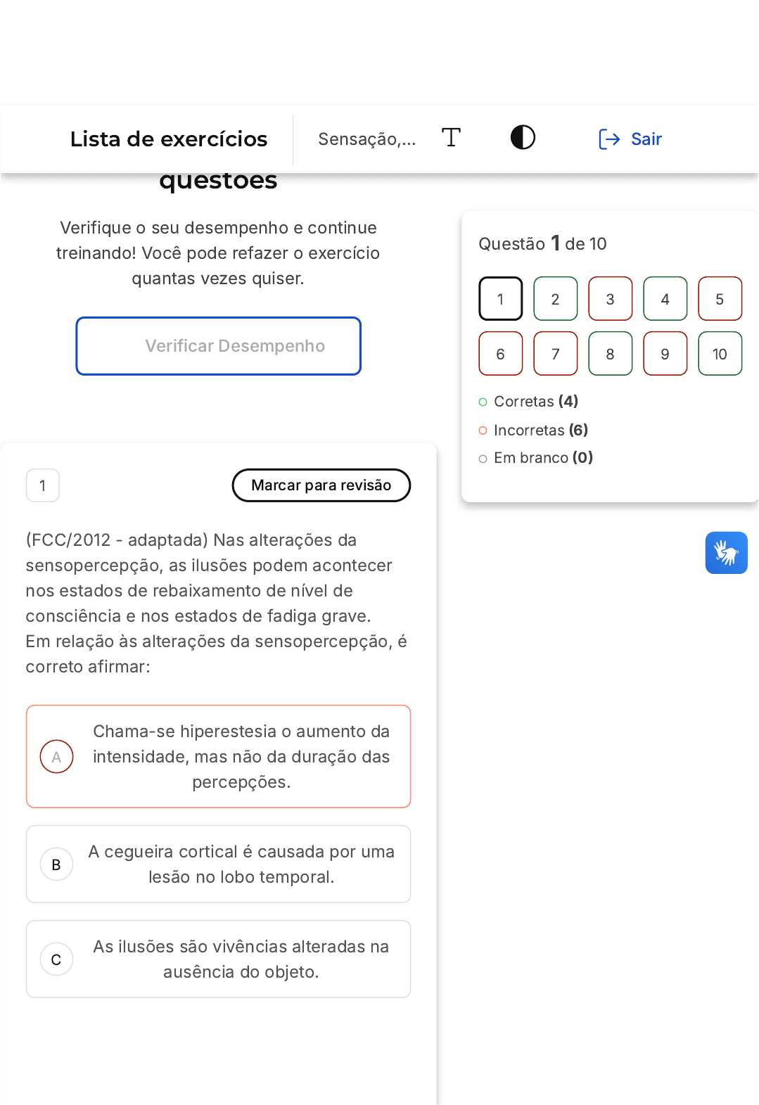 Você acertou 4 de 10 questões Verifique o seu desempenho e continue treinando! Você pode refazer o exercício quantas vezes quiser. Verificar Desempenho A B C 1 Marcar para revisão (FCC/2012 - adaptada) Nas alterações da sensopercepção, as ilusões podem acontecer nos estados de rebaixamento de nível de consciência e nos estados de fadiga grave. Em relação às alterações da sensopercepção, é correto afirmar: Chama-se hiperestesia o aumento da intensidade, mas não da duração das percepções. A cegueira cortical é causada por uma lesão no lobo temporal. As ilusões são vivências alteradas na ausência do objeto. Questão 1 de 10 Corretas (4) Incorretas (6) Em branco (0) 1 2 3 4 5 6 7 8 9 10 Lista de exercícios Sensação,… Sair D E Na alucinose, o paciente não reconhece a experiência perceptiva como estranha, patológica. A agnosia faz parte do grupo de alterações da percepção. Resposta incorreta Opa! A alternativa correta é a letra E. Confira o gabarito comentado! Gabarito Comentado A agnosia é uma alteração da percepção que se caracteriza pela incapacidade de reconhecer ou identificar estímulos sensoriais, apesar de as funções sensoriais estarem intactas. Existem três tipos de agnosia: visual, auditiva e somatossensorial, cada uma causada por lesões em diferentes lobos do cérebro. A agnosia visual é causada por lesão no lobo occipital, a auditiva por lesão no lobo temporal e a somatossensorial ou assomatognosia por lesão no lobo parietal. Portanto, a alternativa correta é a E, que afirma que a agnosia faz parte do grupo de alterações da percepção. 2 Marcar para revisão (CESPE / CEBRASPE/2009 - Adaptada) Durante o processo de triagem para atendimento em grupo de abordagem cognitivo comportamental, é muito relevante para o idoso uma entrevista individual para avaliar seu nível de capacidade auditiva para comunicação, A B C D E compreensão verbal e escrita ou capacidade de retenção mnemônica. Sobre a memória explícita e implícita, analise as afirmativas abaixo. I - A memória explícita é a capacidade de armazenamento e recordação consciente de experiências prévias. II - A memória implícita acumula informação tanto do tipo espacial quanto temporal. III - A memória implícita é a capacidade de armazenamento e recordação não consciente de experiências prévias. Marque a alternativa que apresenta a(s) afirmativa(s) correta(s). Apenas a afirmativa I está correta Apenas a afirmativa II está correta Apenas as afirmativas I e III estão corretas. Apenas as afirmativas I e II estão corretas. As afirmativas I, II e III estão corretas. Resposta correta Parabéns, você selecionou a alternativa correta. Confira o gabarito comentado! Gabarito Comentado As afirmativas I e III estão corretas. A afirmativa I define corretamente a memória explícita como a capacidade de armazenamento e recordação consciente de experiências prévias. A afirmativa III também está correta ao definir a memória implícita como a capacidade de armazenamento e recordação não consciente de experiências prévias. No entanto, a afirmativa II está incorreta. A memória implícita não acumula informação do tipo espacial e temporal, essa é uma característica da memória explícita. Portanto, apenas as afirmativas I e III estão corretas. 3 Marcar para revisão (COMPERVE/2017 - Adaptada) A resposta motora humana é elaborada através da integração sensório-motora entre as estruturas do sistema nervoso periférico e o sistema nervoso central, o qual interpreta os impulsos sensoriais aferentes e elabora um sinal motor adequado para a atividade motora desejada. A quantidade de força e a precisão de uma contração muscular estão baseadas numa ordem de recrutamento das fibras musculares, que obedece a critérios de ativação. Sobre a integração sensório-motora, marque a alternativa correta. A B C D E Tem um número próprio de motoneurônios, sendo cada fibra inervada por vários nervos, independente da função que o músculo desempenha. É a habilidade de integrar, em padrões deficientes de movimento, sistemas motores separados com modalidades sensoriais variadas. Liga-se aos componentes de aptidão motora de força e resistência, porém não está intimamente alinhada ao equilíbrio, velocidade e agilidade. É a habilidade de um indivíduo manter a postura de seu corpo inalterada, quando esse é colocado em várias posições. Tem seu início ainda na barriga da mãe, devido às interações do indivíduo com o meio que o cerca, por meio de respostas adaptativas ou não, que o levam ao aprendizado. Resposta incorreta Opa! A alternativa correta é a letra E. Confira o gabarito comentado! Gabarito Comentado A alternativa correta é a letra E. A integração sensório-motora começa ainda na vida intrauterina. Isso ocorre devido às interações do indivíduo com o ambiente ao seu redor, através de respostas que podem A B C ser adaptativas ou não. Essas respostas são fundamentais para o aprendizado do indivíduo. Portanto, a integração sensório- motora não é apenas uma habilidade de manter a postura ou de integrar sistemas motores separados, mas é um processo contínuo que começa desde a vida intrauterina e se desenvolve através das interações do indivíduo com o ambiente. 4 Marcar para revisão (FGV/2018 - adaptada) As alterações na área da senso-percepção estão presentes como sintomas de muitos transtornos mentais, sendo critérios importantes na avaliação clínica, diagnóstico e orientação dos tratamentos. Sobre as alterações na senso-percepção, assinale a afirmativa correta. Os delírios auditivos na esquizofrenia paranoide são de cunho predominantemente persecutório. O paciente com Transtorno de Déficit de Atenção tem a percepção hipovigil e hipertenaz. As esquizoidias táteis são comuns em pacientes com síndrome de abstinência do álcool. D E Uma lesão no lobo occipital pode causar 