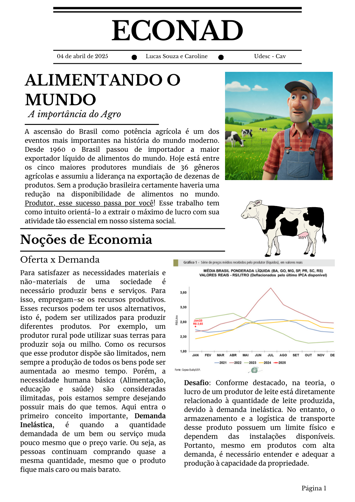 Noções de Economia ECONAD 04 de abril de 2025 Lucas Souza e Caroline Udesc - Cav Página 1 ALIMENTANDO O MUNDO A importância do Agro A ascensão do Brasil como potência agrícola é um dos eventos mais importantes na história do mundo moderno. Desde 1960 o Brasil passou de importador a maior exportador líquido de alimentos do mundo. Hoje está entre os cinco maiores produtores mundiais de 36 gêneros agrícolas e assumiu a liderança na exportação de dezenas de produtos. Sem a produção brasileira certamente haveria uma redução na disponibilidade de alimentos no mundo. Produtor, esse sucesso passa por você! Esse trabalho tem como intuito orientá-lo a extrair o máximo de lucro com sua atividade tão essencial em nosso sistema social. Para satisfazer as necessidades materiais e não-materiais de uma sociedade é necessário produzir bens e serviços. Para isso, empregam-se os recursos produtivos. Esses recursos podem ter usos alternativos, isto é, podem ser utilizados para produzir diferentes produtos. Por exemplo, um produtor rural pode utilizar suas terras para produzir soja ou milho. Como os recursos que esse produtor dispõe são limitados, nem sempre a produção de todos os bens pode ser aumentada ao mesmo tempo. Porém, a necessidade humana básica (Alimentação, educação e saúde) são consideradas ilimitadas, pois estamos sempre desejando possuir mais do que temos. Aqui entra o primeiro conceito importante, Demanda Inelástica, é quando a quantidade demandada de um bem ou serviço muda pouco mesmo que o preço varie. Ou seja, as pessoas continuam comprando quase a mesma quantidade, mesmo que o produto fique mais caro ou mais barato. Desafio: Conforme destacado, na teoria, o lucro de um produtor de leite está diretamente relacionado à quantidade de leite produzida, devido à demanda inelástica. No entanto, o armazenamento e a logística de transporte desse produto possuem um limite físico e dependem das instalações disponíveis. Portanto, mesmo em produtos com alta demanda, é necessário entender e adequar a produção à capacidade da propriedade. Oferta x Demanda Máquinas e Ferramentas Fatores de produção - São os recursos usados para produzir bens e serviços. Eles são fundamentais para qualquer atividade econômica e, por isso, são extremamente relevantes na nossa propriedade. Eles podem ser Recursos Naturais - Terra, Recursos Humanos – Força de Trabalho e Recursos Econômicos - Capital. Eles não são ilimitados e portanto, são o que definem os limites da produção Conforme aprimoramos nosso entendimento sobre a fisiologia e nutrição dos animais que criamos, desenvolvemos sistemas cada vez mais eficientes, ou seja, maior produção com menor desperdício de insumos. Os números atuais do Brasil são impressionantes e basta comparar os diferentes sistemas de criação para entender como a tecnologia no campo trás resultados reais para o bolso do produtor. ECONAD 04 de abril de 2025 Lucas Souza e Caroline Udesc - Cav A agricultura, com certeza, foi fundamental no desenvolvimento do modelo social em que vivemos atualmente, em grande parte graças a maior disponibilidade de alimentos que pudemos nos concentrar na criação de máquinas e tecnologia, uma vez que nossas necessidades básicas estavam supridas, agora podemos usar dessa tecnologia mais disponível para aprimorar nossa capacidade de cultivar alimentos. Como afeta minha propriedade? Página 2 Fatores de Produção Instalações bem planejadas facilitam o manejo diário dos animais e influenciam sobremaneira o conforto e saúde das vacas, refletindo sobre a produção de leite. Veja o levantamento do número de propriedades leiteiras que utilizam o sistema Compost Barn entre as maiores fazendas leiteiras do Brasil segundo o Top 100 2022, entre 2016 e 2021. Fonte: Milkpoint SISTEMAS ECONÔMICOS ECONAD 04 de abril de 2025 Lucas Souza e Caroline Udesc - Cav Página 3 O que é um sistema econômico? As unidades produtoras utilizam os recursos produtivos. Remuneram esses recursos através de salários, aluguéis, juros e lucros. A remuneração obtida possibilita a aquisição de bens e serviços produzidos. Essa interação entre o público (as pessoas) e as unidades produtoras (empresas) resulta, de acordo com Luiz e Silva (2001), em dois fluxos em um sistema econômico: um fluxo de bens e serviços e, de outro lado, um fluxo monetário. Um sistema econômico é a maneira como a sociedade se organiza visando solucionar a forma como utilizará seus recursos produtivos (capital, recursos naturais, etc) para produzir bens e serviços para atender suas necessidades. As empresas gastam seus recursos para produzir bens e serviços. Essas empresas são conhecidas como unidades produtoras. São exemplos de unidades produtoras: um laticínio, uma fabrica de ração, um frigorifico, etc. Conforme Souza (2007), os bens produzidos nessas unidades podem ser classificados em: Bens e serviços de consumo, intermediários e Bens de capital. As empresas são classificadas em setores, Primário, Secundário e Terciário. Propriedades rurais normalmente são produtoras de Bens e serviços de consumo não duráveis e se situam no setor primário de produção. Como nosso sistema funciona? Resumindo: O sistema é formado pelos agentes econômicos, como empresas, indivíduos e Governo. A interação entre eles é o que viabiliza o funcionamento do sistema como um todo. O fluxo real representa a oferta, ou seja, os bens e serviços que serão disponibilizados. Já o fluxo monetário, relacionado à demanda, envolve os pagamentos e remunerações destinados a trabalhadores, proprietários e outros envolvidos na produção. Formando um Fluxo Circular. A teoria econômica pode ser dividida em dois ramos básicos: a microeconomia e a macroeconomia (SILVA; LUIZ, 2001). A microeconomia estuda os agentes econômicos (como empresa e consumidor) individualmente, isto é, estuda a maneira como o consumidor gasta sua r