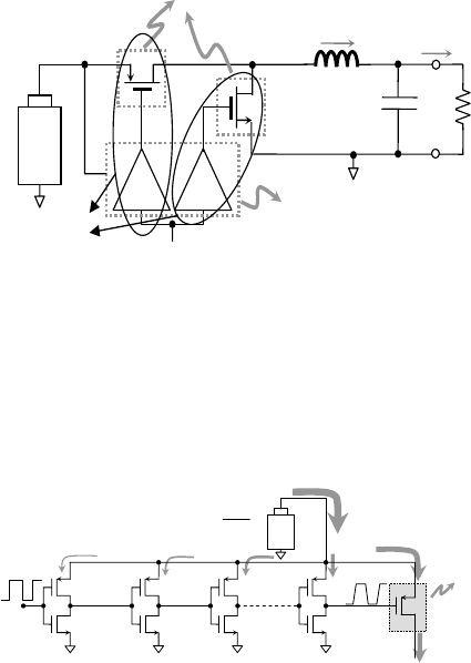 ENERGY OPTIMIZATION OF TAPERED BUFFERS FOR CMOS ON-CHIP SWITCHING POWER CONVERTERS G.Villar, E. Alarcón, J. Madrenas, F. Guinjoan, A. Poveda Department of Electronic Engineering Universitat Politècnica Catalunya 08034 Barcelona, Spain. e-mail: gvillar@eel.upc.edu ABSTRACT This work presents a model to determine the power consumption of tapered buffers, validating its results with transistor-level simulations. Focusing on their application as gate drivers for high-frequency on-chip switching power converters, the need for a fall-rise time evaluation at the output of the tapered buffer will be discussed. Consequently, output fall-rise time is modeled and validated by means of simulations. Given the linear relation between the fall-rise time and the switching losses of the power MOSFET, it is proposed an optimized design procedure to concurrently minimize the switching losses of the tapered buffer together with the power MOSFET switching losses. The work concludes with a design example for a 15000µm-width PMOS transistor, presenting an optimum tapering factor of 21, for a specific 0.35µm standard CMOS technology. 1. INTRODUCTION The current trend towards an increase of computing capability in portable devices such as mobile phones, PDAs and personal music players contrasts with the continuous reduction of their volume and weight, as well as the demand for a longer operating life. Similarly, in a lower level of abstraction, there is a rather direct relation between the computing capability of these devices and their power consumption, while the energy management systems (battery and power supply circuits) are key for efficiency and become a significant portion of the overall volume and weight. Therefore, efficient energy management circuits with reduced volume and weight are required. The most efficient energy conversion from a DC source (such as a battery) is achieved by means of switching power converters, but their main drawback is that they are bulky. Thus, the development of fully integrated switching power converters is of key interest. On the other hand, an expected high frequency operation is derived from the reduction of their reactive components, which is detrimental to high efficiency due to increased switching losses that might preclude their practical application. In figure 1 the basic scheme of a switching buck converter is presented. The main conduction losses are due to parasitic series resistances of the power transistors, the inductor and the capacitor. The switching losses basically appear in the power transistors (MOSFET in the case of standard CMOS technologies), in the inductor (due to the magnetic hysteresis cycle of the ferromagnetic core, if any), and notably in the power gate drivers that activate the power transistor gates. Due to high frequency operation, switching losses can not be neglected. Since switching losses in the inductor depend on the material that builds up the ferromagnetic core, which is not available in a standard CMOS process, the presented work does not take them into account and is focused towards the minimization of switching losses in power transistors and their associated drivers, by means of their concurrent design. L C iL vout + - iout D R IV ER D R IV ER d(t) BA TT ER Y switching losses conduction + switching losses joined design Fig.1.- Gate driver and power transistor switching losses in a buck converter In standard CMOS processes, the power of the switching signal is commonly amplified by a chain of digital inverters having their transistors an increasing channel width. This is known as tapered buffer structure (figure 2), being the tapering factor (f) the value that scales the transistors channel width in two consecutive inverters. Eout Ein in out E EefficiencyOverall =_ 1 f f n-1 f n vin Power MOSFET f 2 Fig. 2.- Overall energy consumption in a tapered buffer and the corresponding power MOSFET Tapered buffers have been historically developed and analyzed in the literature mainly in the field of drivers for digital IC pads. In 1975 Lin and Linholm [1] proposed a delay model based on the propagation delay between two minimum inverters and Jaeger [2] found the optimum tapering factor that minimized the total propagation delay. Afterwards, Nemes [3] added the concept of parasitic delay of an inverter without load. Subsequently, Li et al. [4] used the split-capacitor model to determine the total propagation delay of a tapered buffer. In 1991, Sutherland [5] introduced the delay estimation by means of the logical effort concept. Although all these works deeply analyzed the propagation delay of tapered buffers, energy consumption is of paramount interest in high frequency switching power converters application. Fewer works have studied the power consumption of these circuits. Choi and Lee [6] proposed a capacitive 44530-7803-8834-8/05/$20.00 ©2005 IEEE. approach based on the split-capacitor model. Cherkauer and Friedman [7] added to the capacitive approach the short-circuit current estimation based on the Sakurai short-channel α-power model of transistor operation [8]. More recently, contributions about tapered buffer design focused on their application to switching power converters have been reported (Stratakos [9], Kursun [10]) proposing tapering factor values that aim to reduce the corresponding switching losses. This work proposes an energy model, analogous to the Nemes delay model [3], to determine the energy consumption of a tapered buffer (section 2). In addition to this, in section 3 a fall-rise time model of a tapered buffer is proposed, showing that it is related to the switching losses of the power MOSFET. A design procedure for the tapered buffer that concurrently minimizes both driver losses and switching losses of power MOSFET is discussed in section 4. Finally, a design example for a given power MOSFET in a 0.35µm CMOS standard technology is exposed in section 5. 2. PROPOSED SWITCHING ENERGY LOSS MODEL The proposed energ