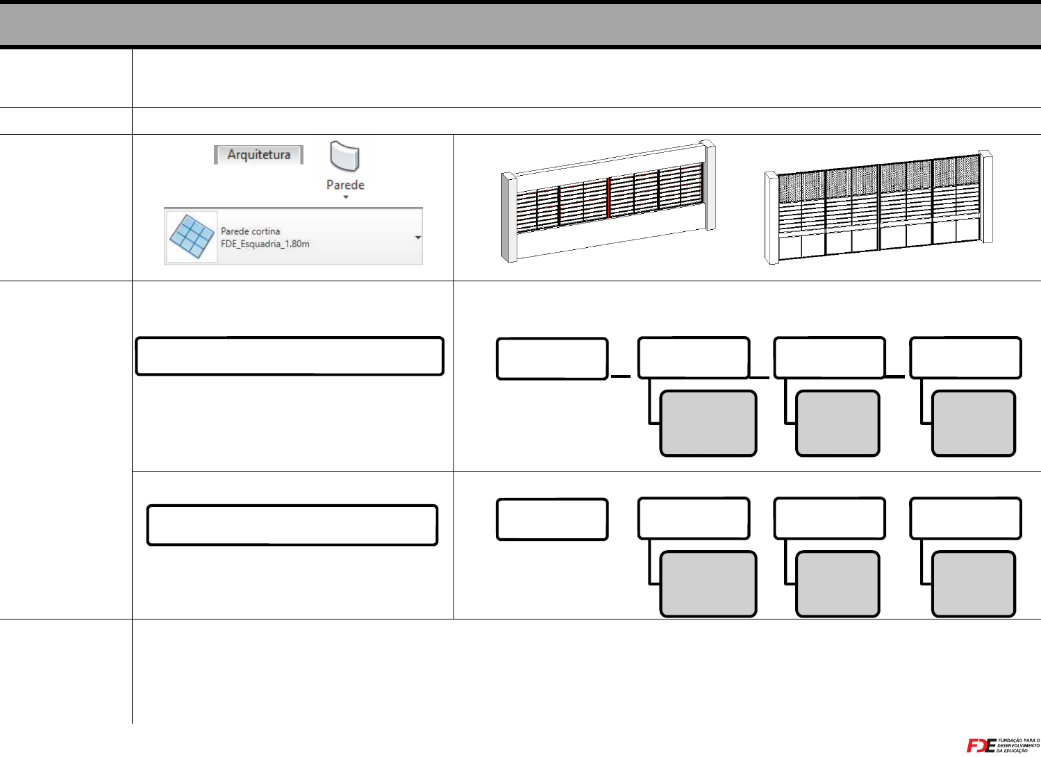 Todos os direitos reservados. FDE – Novembro 2016 – Revisão 0 ESQUADRIAS Esta ficha se aplica aos seguintes componentes Esquadrias. Ver Catálogo de Componentes FDE. Categoria Janela / Window Ferramentas no Autodesk Revit para utilização dos componentes no projeto Lógica de Nomenclatura da Família e do Tipo Nomenclatura da Família: Estrutura: Nomenclatura do Tipo: igual à nomenclatura da famíla Estrutura: Principais ações • Criar uma parede cortina através da ferramenta Parede, e escolher uma Parede cortina (Curtain wall). • Foram criadas 2 tipos de Parede cortina configuradas para as modulações horizontais de 0,90m e 1,80m para auxiliar a criação de panos com a modulação FDE, porém também pode ser utilizada uma família de Parede cortina sem modulação inicial. • Após a definição dos eixos verticais e horizontais, substitua os painéis iniciais por famílias de esquadrias, adicione os montantes verticais e horizontais (ME-02 e ME-03) e os peitoris (PE-02) utilizando os eixos da parede cortina. • Verifique se a esquadria escolhida está de acordo com as dimensões do componente, utilizando como referência os parâmetros “Verificação altura do componente ” e “Verificação largura do componente ”. FDE XXXX código do componente (EA13, EF04, etc) Nome nome do componente (XXxXXcm) dimensões do componente (LarguraxAltura) FDE XXXX código do componente (EA13, EF04, etc) Nome nome do componente (XXxXXcm) dimensões do componente (LarguraxAltura) FDE_EF04_EsquadriadeFerro(180x60cm) a' FDE_EF04_EsquadriadeFerro(180x60cm) ' Todos os direitos reservados. FDE – Novembro 2016 – Revisão 0 PARÂMETROS Para todas as esquadrias deverão ser alterados apenas os parâmetros que definem os materiais do vidro e da pintura da esquadria: • Material (Vidro): aplica o material ao vidros da esquadria e deverá ser escolhido apenas os materiais referentes às fichas de Serviço de Vidros (S13). • Pintura (Esquadria): aplica o material de pintura nas partes metálicas da esquadria, utilizar o material referente às fichas de Serviços de Pinturas para esquadrias (S14), e para escolha da cor deverá ser duplicado seu material e o Asset que controla as características de aparência do mesmo. Para todas as esquadrias deverão ser verificadas se as dimensões do componente estão de acordo com as tolerâncias previstas nas fichas do catálogo, a principio a esquadrias respeitará a modulação da Parede cortina, a menos que a mesma esteja em desacordo, neste caso a esquadria não obedecerá a modulação dos eixos e, além disso, os parâmetros “Verificação altura do componente ” e “Verificação largura do componente ” apresentarão mensagens de alerta: Todos os direitos reservados. FDE – Novembro 2016 – Revisão 0 DOCUMENTAÇÃO Para identificar uma família de esquadria, utilize a nota-chave do elemento. Este parâmetro refere-se ao código da ficha do Catálogo de Componentes da FDE. Este parâmetro poderá ser extraído em tabela, através do campo Nota-Chave junto ao código de serviço do componente, através do campo Código de Montagem: CHECKLIST DO PROCESSO DE UTILIZAÇÃO DO COMPONENTE E M PROJETO