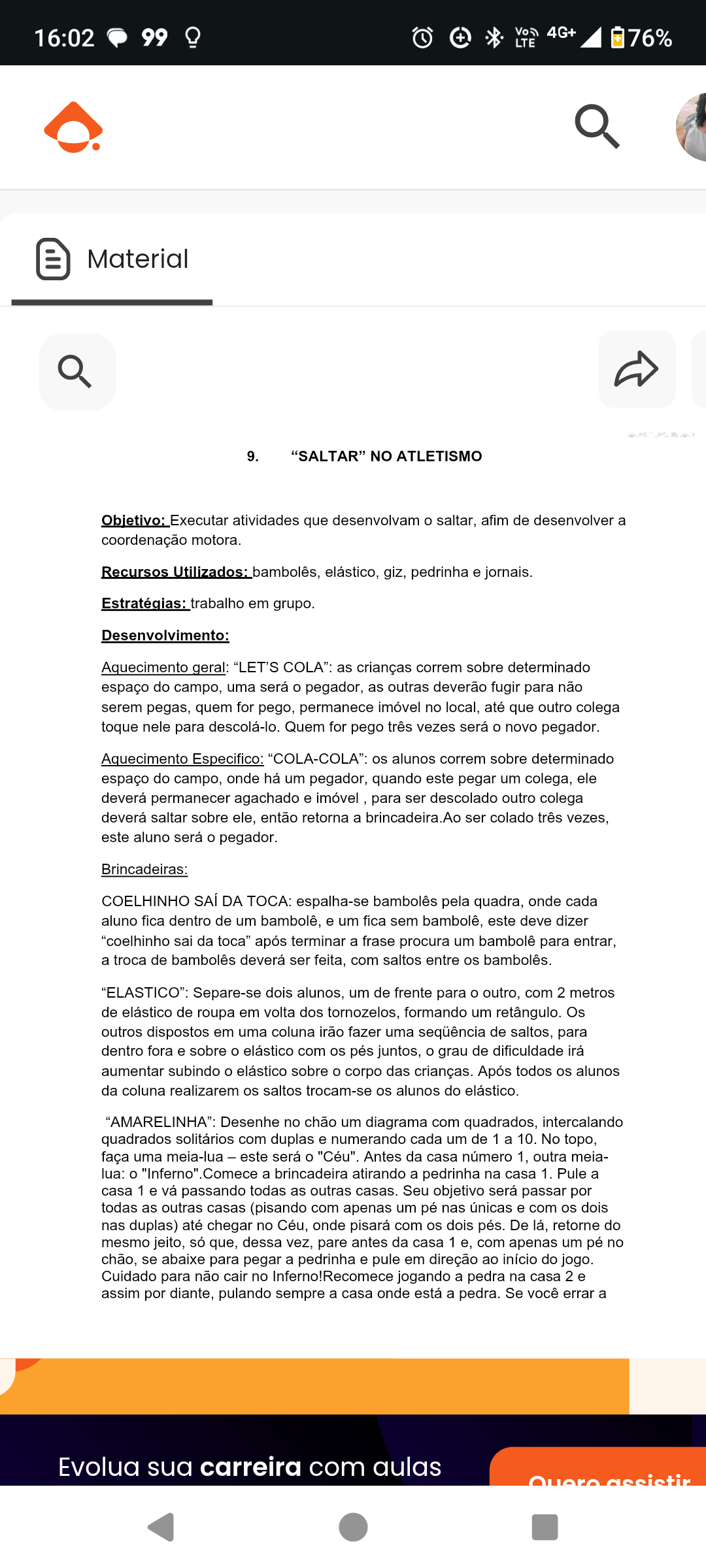 16:02 99 4G+ LTE 76% Material 9. "SALTAR" NO ATLETISMO Objetivo: Executar atividades que desenvolvam saltar, afim de desenvolver a coordenação motora. Recursos Utilizados: bambolês, elástico, giz, pedrinha e jornais. Estratégias: trabalho em grupo. Desenvolvimento: Aquecimento geral: "LET'S as crianças correm sobre determinado espaço do campo, uma será pegador, as outras deverão fugir para não serem pegas, quem for pego, permanece imóvel no local, até que outro colega toque nele para descolá-lo. Quem for pego três vezes será novo pegador. Aquecimento Especifico: "COLA-COLA": os alunos correm sobre determinado espaço do campo, onde há um pegador, quando este pegar um colega, ele deverá permanecer agachado e imóvel para ser descolado outro colega deverá saltar sobre ele, então retorna a ser colado três vezes, este aluno será pegador. Brincadeiras: COELHINHO SAÍ DA TOCA: espalha-se bambolês pela quadra, onde cada aluno fica dentro de um bambolê, e um fica sem bambolê, este deve dizer "coelhinho sai da toca" após terminar a frase procura um bambolê para entrar, a troca de bambolês deverá ser feita, com saltos entre os bambolês. "ELASTICO": Separe-se dois alunos, um de frente para outro, com 2 metros de elástico de roupa em volta dos tornozelos, formando um retângulo. Os outros dispostos em uma coluna irão fazer uma seqüência de saltos, para dentro fora e sobre elástico com pés juntos, grau de dificuldade irá aumentar subindo elástico sobre corpo das crianças. Após todos os alunos da coluna realizarem os saltos trocam-se os alunos do elástico. "AMARELINHA": Desenhe no chão um diagrama com quadrados, intercalando quadrados solitários com duplas e numerando cada um de 1 a 10. No topo, faça uma meia-lua este será "Céu". Antes da casa número 1, outra meia- lua: Comece a brincadeira atirando a pedrinha na casa 1. Pule a casa 1 e vá passando todas as outras casas. Seu objetivo será passar por todas as outras casas (pisando com apenas um pé nas únicas e com os dois nas duplas) até chegar no Céu, onde pisará com os dois pés. De lá, retorne do mesmo jeito, só que, dessa vez, pare antes da casa 1 e, com apenas um pé no chão, se abaixe para pegar a pedrinha e pule em direção ao início do jogo. Cuidado para não cair no Inferno!Recomece jogando a pedra na casa 2 e assim por diante, pulando sempre a casa onde está a pedra. Se você errar a Evolua sua carreira com aulas
