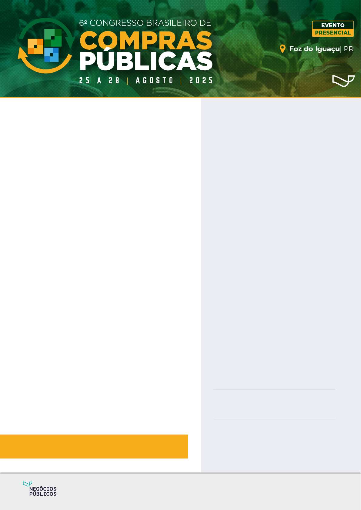 1 APRESENTAÇÃO PÚBLICO-ALVO Este ano será marcado como um grande ponto de virada na linha do tempo das Compras Públicas! 2025 é o ano no qual as licitações e as contratações mais evoluirão no país, sendo grande parte destas conquistas resultado do importante movimento de regulamentação da Nova Lei de Licitações e Contratos (NLLC) e do grande avanço do uso da tecnologia para melhoria dos sistemas, portais e processos de aquisição eletrônicos. A implementação da NLLC 14.133/2021 já é uma realidade palpável, concretizando a observância ampla e obrigatória da nova norma. Todos os órgãos e instituições abandonaram antigas e engessadas regras licitatórias para entrarem totalmente no novo mundo das Compras Públicas. Este é o momento de fortalecer o que já está dando certo e as boas práticas percebidas, bem como aprofundar ainda mais o estudo sobre o que precisa ser esclarecido, aperfeiçoado e, então, solucionado. A 6ª edição do Congresso Brasileiro de Compras Públicas trará ao palco todo o novo e atual contexto das Compras Públicas no Brasil, com uma abordagem integral e sistêmica sobre seus avanços, conquistas, desafios, expectativas, temas de destaque e projeções para o próximo ano! Para a condução desse grande momento de estudos e debates convidamos os melhores palestrantes e professores do país! Serão 4 dias de intenso conteúdo no qual todos terão a oportunidade de ampliar o conhecimento, compartilhar boas práticas e experiências valiosas em suas Licitações e Contratos, criando um ambiente único de aprendizado, informação, atualização, e sucesso para as suas contratações; tudo com a assinatura de excelência em eventos do Grupo Negócios Públicos. INSCREVA-SE JÁ! • Agentes Públicos de Contratação e membros das Comissões de Contratação da Administração Direta e Indireta da União, DF, Estados e Municípios; • Pregoeiros e membros de Equipes de Apoio; • Presidentes e membros de Comissões de Licitação; • Fiscais e Gestores de Contratos Administrativos; • Autoridades de planejamento estratégico e estatal; • Autoridades superiores; • Profissionais da Assessoria Jurídica das instituições; • Agentes de Controle Interno; • Agentes responsáveis pelos processos de Contratação Direta; • Entidades do Sistema S; • Demais profissionais atuantes com as compras e contratações públicas e interessados nas temáticas do evento. • Livro impresso “Legislação: Licitações - Pregão Presencial e Eletrônico - Leis Complementares”; • Apostila impressa com conteúdo exclusivo do evento; • Certificado Geral com carga horária de 26 horas será disponibilizado através da plataforma: npevents.com.brCARGA HORÁRIA: 26 HORAS MATERIAL DE APOIO 2 Credibilidade Transformação Nossa Paixão Evento Inovador Imersão Networking Autoridades Certificação Evento com a qualidade, expertise e assinatura do Grupo Negócios Públicos. 26 horas de capacitação focada no crescimento profissional. Temos orgulho de realizar os maiores eventos do Brasil. Material de Apoio e conteúdo exclusivo para participantes do evento. 4 dias de aprendizado intenso, focando na sua capacitação! Interatividade via App NP Events – informação na palma da mão. Time de Palestrantes e Professores renomados em todo o país. Participação reconhecida através de certificado. MOTIVOS PARA PARTICIPAR MODALIDADE PRESENCIAL Evento ministrado na modalidade presencial em Foz do Iguaçu/PR. Serão 4 dias de encontro, realizado entre os dias 25 à 28 de agosto de 2025, totalizando 26 horas de capacitação. LOCAL DO EVENTO Mabu Thermas Grand Resort Av. das Cataratas, 3175 | Vila Yolanda CEP: 85.853–000 | Foz do Iguaçu/PR Reservas: 4002–6040 APARTAMENTO SINGLE DUPLO TRIPLO QUÁDRUPLO VALOR DIÁRIA R$638,25 R$735,74 R$913,72 R$1.091,48 TAXA ISS 5% 5% 5% 5% TAXA DE TURISMO/POR APTO R$3,90 R$3,90 R$3,90 R$3,90 TABELA HOSPEDAGEM | PARTICIPANTES (RUN OF THE HOUSE) 3 PROGRAMAÇÃO SEG | 25.Ago 16h às 19h30 Recepção e credenciamento | Negócios Públicos 19h30 às 20h Abertura do salão 20h A importância das compras públicas | Rudimar Reis TER | 26.Ago 8h00 às 10h00 A importância do ETP e seus reflexos nas compras públicas Professor: Min. Benjamin Zymler 10h00 às 10h30 Coffee break 10h30 às 12h30 Credenciamento e pré-qualificação nas compras públicas Professor: Christianne Stroppa 12h30 às 14h00 Almoço 14h00 às 16h00 Habilitação nas compras públicas: quando, como e o que exigir? Professora: Felipe Boselli 16h00 às 16h30 Coffee break 16h30 às 18h00 A ME/EPP e o comércio local nas compras públicas: possibilidades e limites Professor: Victor Amorim 18h00 Encerramento das atividades do dia QUA | 27.Ago OFICINAS MANHÃ 8h às 12h30 Como implementar os principais instrumentos de governança de compras públicas Professor: Paulo Alves Sistema de Registro de Preços: mecanismo de eficiência para as compras públicas Professor: Felipe Boselli Uso de inteligência artificial na elaboração do ETP e do TR na prática Professor: Abimael Torcate 10h às 10h30 Coffee break 10h30 às 12h30 Continuação das oficinas da manhã 12h30 às 14h00 Almoço 4 OFICINAS TARDE 14h às 18h Contratação direta como instrumento de eficiência nas compras públicas Professor: Anderson Pedra Como elaborar um edital para compras públicas: cautelas necessárias Professor: Leonardo Mota Elaboração da pesquisa de preços para compras públicas, na prática. Professor: Abimael Torcate 16h às 16h30 Coffee break 16h30 às 18h Continuação das oficinas da tarde 18h Encerramento das atividades do dia QUI | 28.Ago 8h às 10h00 Compras públicas sustentáveis 10h00 às 10h30 Coffee break 10h30 às 12h30 Recebimento do objeto: cautelas indispensáveis nas compras públicas Professor: Anderson Pedra 12h30 às 14h Almoço 14h às 15h Elaboração e gestão de contratos de fornecimento contínuo, como instrumento de eficiência das compras pública