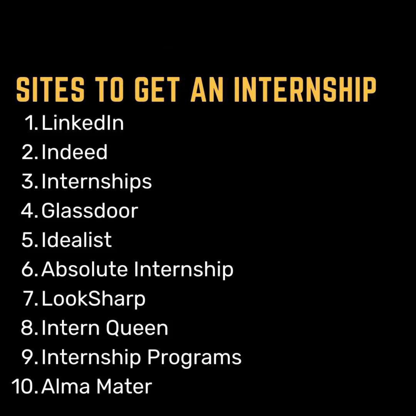 SITES TO GET AN INTERNSHIP 1. 2.Indeed 3. .Internships 4.Glassdoor 6.Absolute Internship 7.LookSharp 8.Intern Queen 9.Internship Programs 10.Alma MaterTOP 10 SITES FOR YOUR JOB SEARCH 1.Indeed 2. Linkedln 3. Dice 4.Glassdoor 6. Career Builder 7.LinkUp 8.Google For Jobs 9. 10.US JobsSITES TO BUILD YOUR RESUME 1. Canva 2.KickResume 3. Visual CV 4.Zety 5. Free Resume Templates 6.NovoResume 7.MyPerfectResume 8. Resume Genius 9. Pongo 10. CreddleTOP SITES TO LEARN TECH SKILLS 1.Treehouse 2.Khan Academy 3.Code School 4. EDX 5.Coursera 6.CodeWars 7.FreeCodeCamp 8.Github 9.The Odin Project 10.MIT OpenCourseWareSITES FOR FREE ONLINE EDUCATION 1. Udacity 2. Code Avengers 3. David Walsh Blog 4. Tuts+ 5. SitePoint 6. HTML5 Rocks 7.Hack.Pledge() 8.Agupieware 9.Crunchzilla 10. Dash General Assembly 12. Infinite Skills 13. Lynda