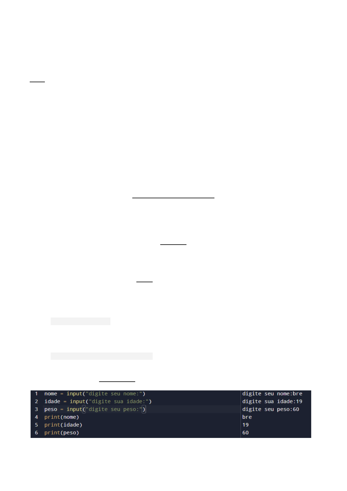 Ex: nome = int( input(“digite sua idade:”))