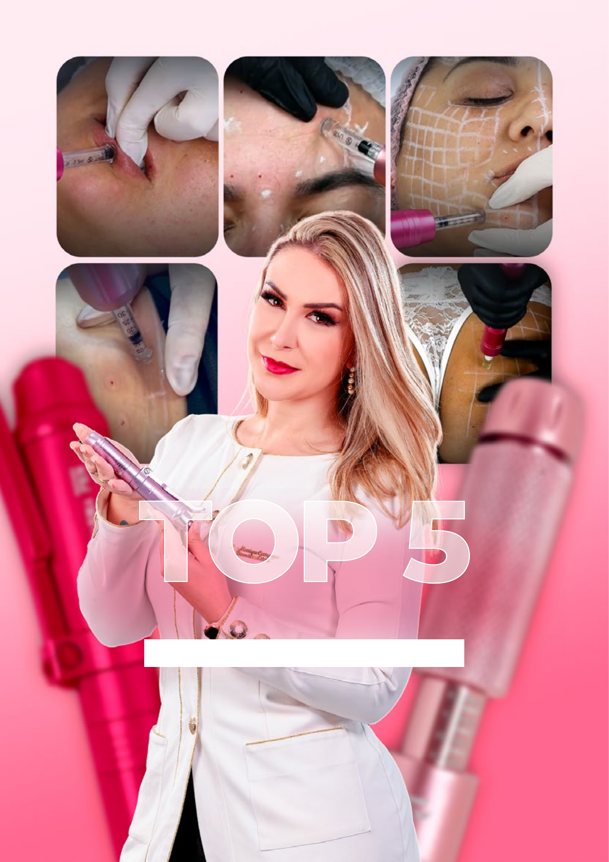 HARMONIZAÇÃO SEM AGULHAS G U I A P R Á T I C O TOP 5 D R A . M O N I Q U E C A M A R G O S Se você está familiarizado com os injetáveis sem agulhas, parabéns! Espero que esse E-book alavanque ainda mais a sua carreira na estética. E se você é novo neste mundo, deixa eu te apresentar a técnica que vai revolucionar a sua visão sobre a estética. Quando falamos de injetáveis sem agulhas, nos referimos às injeções de medicamentos nas camadas internas da pele com o método sob pressão. Esta tecnologia que hoje foi adaptada a área da estética, começou a ser desenvolvida na década de 1930 para a vacinação massiva. Após anos de evolução, em 2018 é criada na Rússia a Hyaluron Pen, a primeira caneta pressurizada para entrega de ácido hialurônico sem agulhas, e em 2019 eu, Monique Camargos, viajei para me formar com a criadora da técnica, Alina Karataeva. E foi assim que começou uma revolução na área da estética brasileira, abrindo as portas a uma variedade de protocolos, ampliando a visibilida- de do método e as oportunidades de faturamento e crescimento profissio- nal dos injetores sob pressão! Este e-book contém todas as informações sobre os 5 procedimentos campeões dos injetáveis sem agulhas: Preenchimento labial, Skinbooster, Harmonização glútea, Toxina botulínica e lipo química. Eles são os responsáveis por inúmeros 15 mil reais em 30 dias de profissionais da estética e você também alcançará esse faturamento dominando as técnicas aqui explicadas! I N T R O D U Ç Ã O @prof.moniquecamargos O preenchimento labial é um dos procedimentos possíveis de se fazer com a técnica de Hyaluron Pen. A técnica consiste na aplicação de ácido hialurônico reticulado na região dos lábios, que é uma substância naturalmente presente no nosso organismo, porém, com o tempo sua concentração diminui, e a sua principal função é preencher os espaços entre as células. Quando realizamos a aplicação do ácido hialurônico, este promove uma maior proporção de volume na região e, além disso, conseguimos hidratar, projetar e deixar o contorno da boca mais delineado. Para realizarmos o preenchimento labial precisamos entender as proporções ideais de cada lábio, o porquê dessa proporção e o que o seu paciente deseja. Aqui no Brasil usamos a seguinte proporção: O lábio superior com menos volume que o lábio inferior, geralmente a divisão é 30% por 70 % ou 40% por 60%. Durante a avaliação é muito importante analisar o lábio e como está essa proporção. No lábio temos a divisão do vermelhão em seco e molhado (mucosa). A aplicação deve ser realizada apenas no vermelhão seco com caneta pressurizada, e não deve ser realizada aplicação na parte externa do lábio. CAPÍTULO I PREENCHIMENTO LABIAL 60% - 70% 30% - 40% 13 - Vermelhão do lábio superior 14 - Vermelhão do lábio inferior 17 - mucosa labial https://blog.dentalspeed.com/preenchimento-labial-efetividade-resultado/ @prof.moniquecamargos Quando realizamos a aplicação no vermelhão molhado, ocorre a transfixação de uma artéria ou vaso. Caso tenha muito sangramento nesta região, vamos ter um alto recrutamento de macrófagos e um processo acelerado de fagocitose, consequentemente vamos ter uma redução drástica no preenchedor. O que não é desejado. O preenchimento à base de ácido hialurônico tem comunicações celulares, se elas forem injetadas livre logo elas vão ser degradadas porque dentro do nosso organismo temos a enzima hialuronidase, ela tem a capacidade de degradar o ácido hialurônico. Quando vamos aplicar um preenchedor e queremos aumentar sua durabilidade, precisamos escolher um preenchedor com a tecnologia de crosslink, que é o cruzamento de moléculas e cria uma junção delas para dar estabilidade e vai criar também uma rede estável e vai dificultar o degradamento. Antes de iniciar o procedimento, vamos realizar a marcação delimitando a área de atuação, quando realizamos a aplicação fora dessa área, vamos ter um aspecto de "boca de pato", o material vai ficar superficializado e irá promover um resultado inestético. Após a marcação da área de delimitação, vamos realizar a marcação no arco do cupido. A aplicação é realizada na pontinha do arco do cupido para manter o contorno do lábio, caso o paciente não tenha, vamos gerar esse contorno. Marcação arco do cupido + marcação para gerar volume. Quando o paciente deseja mais volume, realizamos uma segunda linha de marcação. @prof.moniquecamargos O tipo de aplicação e marcação vai depender do que a paciente deseja. Aplicação na comissura: Esse tipo de aplicação é recomendado para a eversão labial. Para lábios Miami Lips®: o lábio será dividido no centro, gerando uma marcação do meio respeitando o tubérculo central do lábio superior. Quando a aplicação é realizada no tubérculo central do lábio superior o paciente perde o contorno do lábio. Portanto, não recomendamos realizar muita massagem/moldagem na área pois não queremos tirar esse efeito mais cheinho. Para maior conforto do paciente durante a aplicação, podemos realizar o bloqueio anestésico antes de iniciar o procedimento! Eversão labial é quando o lábio é muito para dentro, ao realizar a aplicação a mucosa seca (vermelhão do lábio) vai aparecer mais. Imagem: https://blog.dentalcremer.com.br/3-tecnicas-de-eversao-la- bial-na-hof/ @prof.moniquecamargos Materiais utilizados • Lápis branco ou caneta para marcação; • Clorexidina ou álcool 70% para higienização; • Gaze para realizar a assepsia; • Anestésico tópico para aplicação antes do procedimento; • Ácido hialurônico; Dispositivo usado: caneta pressurizada de alavanca. Passo a passo: 1. Realizar a assepsia dos lábios com clorexidina ou álcool 70%; 2. Fazer a marcação com um lápis branco ou com uma caneta para delimi- tar a área de atuação; 3. Com a delimitação da área, vamos realizar a distribui