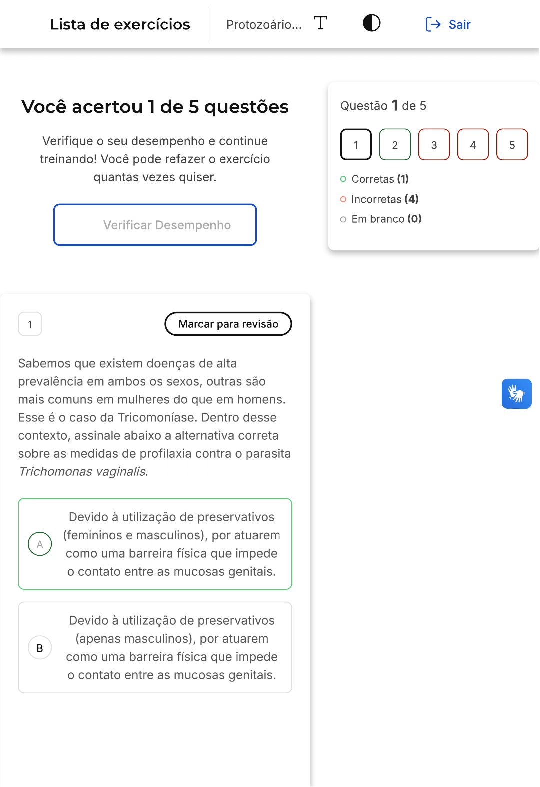 Lista de exercícios Protozoário... T Sair Você acertou 1 de 5 questões Questão 1 de 5 Verifique seu desempenho e continue 1 2 3 4 5 treinando! Você pode refazer exercício quantas vezes quiser. Corretas (1) Incorretas (4) Em branco (0) Verificar Desempenho 1 Marcar para revisão Sabemos que existem doenças de alta prevalência em ambos os sexos, outras são mais comuns em mulheres do que em homens. Esse é caso da Tricomoníase. Dentro desse contexto, assinale abaixo a alternativa correta sobre as medidas de profilaxia contra o parasita Trichomonas vaginalis. Devido à utilização de preservativos (femininos e masculinos), por atuarem A como uma barreira física que impede contato entre as mucosas genitais. Devido à utilização de preservativos (apenas masculinos), por atuarem como uma barreira física que impede contato entre as mucosas genitais.Utilização de preservativos (anticoncepcionais), por atuarem c como uma barreira hormonal que impede contato entre as mucosas genitais. Utilização de preservativos (DIU dispositivo intrauterino), por atuarem D como uma barreira física que impede contato entre as mucosas genitais. Saneamento básico adequado e a E higiene pessoal eficaz. X Resposta incorreta A alternativa correta é a letra Confira gabarito comentado! Gabarito Comentado A alternativa correta é a "A", que menciona a utilização de preservativos, tanto femininos quanto masculinos. Esses preservativos atuam como uma barreira física, impedindo contato direto entre as mucosas genitais, que é essencial para a prevenção da Tricomoníase. A Tricomoníase é uma doença sexualmente transmissível causada pelo parasita Trichomonas vaginalis, e a sua transmissão ocorre principalmente através do contato sexual sem proteção. Portanto, uso de preservativos é uma medida eficaz de profilaxia contra essa doença.2 Marcar para revisão Sabemos que a criptosporiose está associada à transmissão por via oral-fecal e a áreas de saneamento básico inadequado. Assinale abaixo outras medidas profiláticas para controle de transmissão da doença além do investimento em tratamento de efluentes. Investimento governamental em pesquisa, educação em saúde, A incentivo em acesso à informação e distribuição de preservativos. Distribuição de tratamentos, educação em saúde, incentivo em acesso à informação. c Nenhuma das outras alternativas Investimento governamental em D pesquisa, educação em saúde e vacinação. Investimento governamental em E pesquisa, educação em saúde, incentivo em acesso à informação. Resposta correta Parabéns, você selecionou a alternativa correta. Confira gabarito comentado! Gabarito Comentado A alternativa correta é a E, que menciona investimento governamental em pesquisa,educação em saúde e incentivo em acesso à informação. Essas são medidas profiláticas importantes para controle da transmissão da criptosporiose. A pesquisa pode levar a novas formas de prevenção e tratamento, a educação em saúde pode informar a população sobre como evitar a doença e incentivo ao acesso à informação pode garantir que as pessoas estejam cientes dos riscos e das formas de prevenção. 3 Marcar para revisão Segundo boletim epidemiológico ano 5 n° 6, de 28 de dezembro de 2005, da Secretaria de Vigilância em Saúde do Ministério da Saúde, no Brasil, no período de 1999 a 2004, foram identificados 3.737 surtos de doenças transmitidas por alimentos, incluindo a ingestão de água. Sobre tema, marque a opção correta. As doenças de transmissão hídrica são provenientes somente do A consumo e/ou contato com água não tratada, contato com efluentes de esgotos domésticos ou industriais. Os coliformes fecais indicam indiretamente a presença de contaminantes intestinais na água. Esses são excelentes bioindicadores, já que não sofrem variações na sua população do ambiente natural.E.nana e Giardia lamblia são microrganismos comuns em mananciais que recebem esgoto sem c tratamento. Contudo, a G. lamblia se apresenta com maior risco à saúde pública, já que sua dose infecciosa é menor que a da E.nana. Um parasito que representa pouco risco à saúde pública é Cryptosporidium sp., por ser D facilmente detectável por métodos de campo e a sua criptosporidiose, geralmente, tem cura espontânea após um mês. O tratamento mais comum de efluentes domésticos é de lodos ativados. Esse processo utiliza digestão aeróbica ou anaeróbica para E a remoção de sólidos dissolvidos. Adicionalmente, esse método é capaz de eliminar ovos de protozoários entéricos, que permite seu uso na agricultura de hortaliças. X Resposta incorreta Opa! A alternativa correta é a letra B. Confira gabarito comentado! Gabarito Comentado A alternativa correta é a que afirma que os coliformes fecais indicam indiretamente a presença de contaminantes intestinais na água. Os coliformes fecais são um tipo de bactéria que normalmente vive no intestino dos seres humanos e de outros animais de sangue quente. A presença dessas bactérias na água é um indicativo decontaminação fecal, que pode levar à presença de outros patógenos transmitidos pela água. Esses microrganismos são considerados excelentes bioindicadores, pois sua presença ou ausência pode indicar a qualidade da água e risco de doenças transmitidas por água contaminada. 4 Marcar para revisão A criptosporidiose é uma das causas mais comuns de diarreia não viral em humanos, de ocorrência mundial. A transmissão ocorre, principalmente, através da ingestão de água e/ou alimentos contaminados com oocistos de Cryptosporidiumspp. Assinale a alternativa correta sobre esse patógeno. oocisto não esporulado é a forma infecciosa e pode ser ingerido através A da água de consumo e de alimentos como os vegetais. Cryptosporidium parvumé uma bactéria causadora da criptosporidiose, uma infecção intestinal comum, que costuma ocorrer na forma crônica em pacientes imunoco