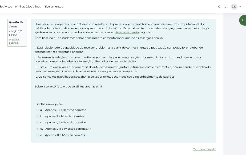 Avisos Minhas Disciplinas Nivelamentos DD Questão 15 Uma série de competências é obtida como resultado do processo de do pensamento computacional. As Correto habilidades refletem diretamente no aprendizado do indivíduo. Especialmente no caso das crianças, O uso dessa metodologia Atingiu 0,67 ajuda em seu crescimento, melhorando aspectos como desenvolvimento cognitivo. de 0,67 Com base no que estudamos sobre pensamento computacional, analise as asserções abaixo. P Marcar I. Está relacionado à capacidade de resolver problemas a partir de conhecimentos e práticas da computação, englobando sistematizar, representar e analisar. II. Refere-se às relações humanas mediadas por tecnologias e comunicações por meio digital, aproximando-se de outros conceitos como sociedade da informação, cibercultura e revolução digital. III. Este é um dos pilares fundamentais do intelecto humano, junto a leitura, a escrita e a aritmética, porque também é aplicado para descrever, explicar e modelar O universo e seus processos complexos. IV. Os conceitos trabalhados são: abstração, algoritmos, decomposição e reconhecimento de padrões. Sobre isso, é correto O que se afirma apenas em? Escolha uma opção: a. Apenas I, II e III estão corretas. b. Apenas II e IV estão corretas. C. Apenas I, II e IV estão corretas. d. Apenas I, III e IV estão corretas. e. Apenas III e IV estão corretas. Terminar revisão