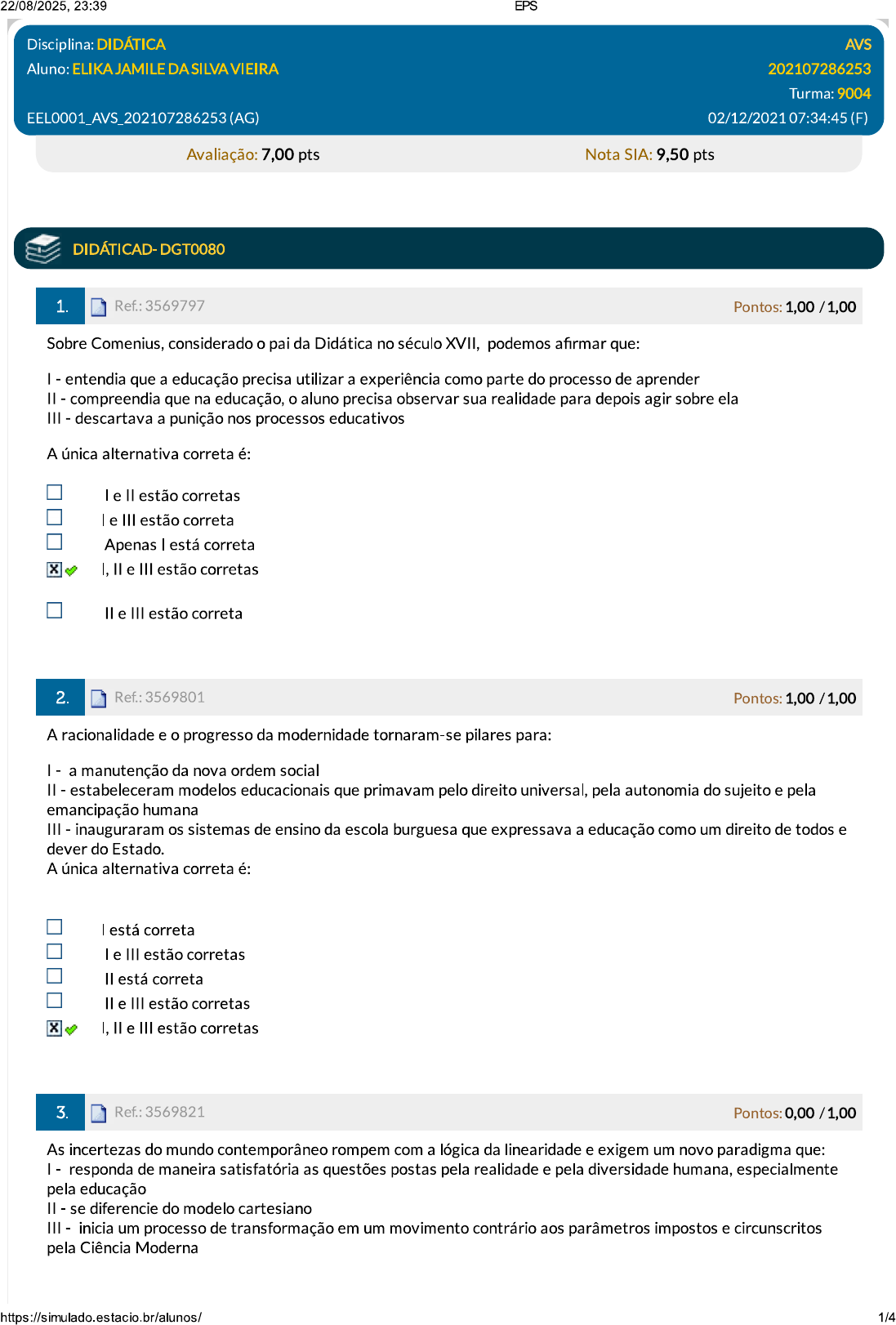 22/08/2025, 23:39 EPS Disciplina: DIDÁTICA AVS Aluno: ELIKA JAMILE DA SILVA VIEIRA 202107286253 Turma: 9004 EEL0001_AVS_202107286253 (AG) 02/12/2021 07:34:45 (F) Avaliação: 7,00 pts Nota SIA: 9,50 pts DIDÁTICAD- DGT0080 1. Ref.: 3569797 Pontos: Sobre Comenius, considerado o pai da Didática no século XVII, podemos afirmar que: I entendia que a educação precisa utilizar a experiência como parte do processo de aprender compreendia que na educação, o aluno precisa observar sua realidade para depois agir sobre ela III descartava a punição nos processos educativos A única alternativa correta é: le estão corretas e III estão correta Apenas I está correta I, II e III estão corretas e III estão correta 2. Ref.: 3569801 Pontos: 1,00 / 1,00 A racionalidade e o progresso da modernidade tornaram-se pilares para: a manutenção da nova ordem social estabeleceram modelos educacionais que primavam pelo direito universal, pela autonomia do sujeito e pela emancipação humana III inauguraram os sistemas de ensino da escola burguesa que expressava a educação como um direito de todos e dever do Estado. A única alternativa correta é: está correta le III estão corretas II está correta e III estão corretas I, e III estão corretas 3. Ref.: 3569821 Pontos: As incertezas do mundo contemporâneo rompem com a lógica da linearidade e exigem um novo paradigma que: responda de maneira satisfatória as questões postas pela realidade e pela diversidade humana, especialmente pela educação se diferencie do modelo cartesiano III - inicia um processo de transformação em um movimento contrário aos parâmetros impostos e circunscritos pela Ciência Moderna 1/422/08/2025, 23:39 EPS A única alternativa correta é: III está correta I, e III estão corretas le III estão corretas e III estão corretas está correta 4. Ref.: 3569837 Pontos: 1,00 / 1,00 Prefeitura do Ceará 2019) A transversalidade e a interdisciplinaridade são modos de se trabalhar o conhecimento que buscam uma reintegração de aspectos que ficaram isolados uns dos outros pelo tratamento disciplinar. Com isso, busca-se conseguir uma visão mais ampla e adequada da realidade, que tantas vezes aparece fragmentada pelos meios de que dispomos para conhecê-la e não porque seja em si mesma. Nesse sentido, analise as afirmativas a seguir. I. Com a interdisciplinaridade questiona-se essa segmentação dos diferentes campos de conhecimento. Buscam-se, por isso, os possíveis pontos de convergência entre as várias áreas e a sua abordagem conjunta, propiciando uma relação epistemológica entre as disciplinas. II. Interdisciplinaridade e transversalidade alimentam-se mutuamente, porém para trabalhar os temas transversais adequadamente deve-se ter uma perspectiva disciplinar única. III. Através da interdisciplinaridade torna-se possível a aproximação com mais propriedade dos fenômenos naturais e sociais, que são normalmente complexos e irredutíveis ao conhecimento obtido quando são estudados por meio de uma única disciplina. As interconexões que acontecem nas disciplinas são causa e efeito da interdisciplinaridade. A única alternativa que contém respostas corretas é: le estão corretas e III estão corretas e III estão corretas III está correta I, e III estão correta 5. Ref.: 3569838 Pontos: jogo simbólico, a imitação e a brincadeira de faz-de-conta realizam importantes funções no processo de aprendizado. Que funções são essas? interação simbolismo do mundo real para a criança III informatização dos processos A única alternativa correta é: está correta e III estão correta I, e III estão corretas e estão corretas III está correta 6. Ref.: 3569841 Pontos: 2/422/08/2025, 23:39 EPS Nos estudos da Didática temos várias teorias que sustentam a prática pedagógica dos professores. Sobre a Teoria Tradicional é correto afirmar que: o sujeito é considerado como terminado, ou seja, uma pessoa "pronta" o ensino está centralizado no docente III o estudante apenas cumpre prescrições que lhe são solicitadas pelos professores A única alternativa correta é: III está correta I, e III estão corretas está correta le III estão corretas le estão corretas 7. Ref.: 3569825 Pontos: Todo professor precisa realizar seu plano de aula. É uma parte muito importante do planejamento didático e deve anteceder à sua entrada em sala de aula. Sobre plano de aula, podemos afirmar que: I precisa articular as competências do planejamento curricular e do PPP corresponde ao nível de maior detalhamento e objetividade do processo de planejamento didático III tem como finalidade a previsão dos conteúdos e atividades de cada aula A única alternativa correta é III está correta e III estão corretas le estão corretas I, e III estão corretas está correta 8. Ref.: 3569845 Pontos: Atualmente se houve muito falar em disrupção. Mas o que é disrupção? I está relacionado com a interrupção da maneira normal de se fazer alguma coisa diz respeito à inovação de processos e metodologias III utilização processos digitais em sua prática A única alternativa correta é: le III estão corretas está correta I, e III estão corretas III está correta e estão corretas 9. Ref.: 3569853 Pontos: As metodologias ativas atualmente são muito discutidas por educadores e pesquisadores.Aponte abaixo alguns benefícios do uso das metodologias ativas: o foco é sobre o aluno e nas suas habilidades de comunicacionais traz uma variedade de estratégias de aprendizagem III promove a retenção de informações mais rapidamente, porque o aluno lida diretamente com o objeto de 3/422/08/2025, 23:39 EPS estudo A única alternativa correta é: está correta III está correta le III estão corretas I, e III estão corretas le estão corretas 10. Ref.: 3569809 Pontos: Sobre as metodologias ativas, podemos afirmar que: - ao planejar uma aula é necessário sempre pensar em uma sujeito ativo é necessário planejar atividades que pro