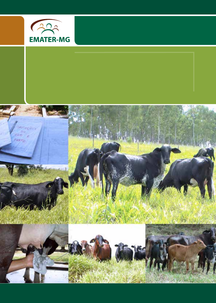 MANUAL DE BOVINOCULTURA PARA A AÇÃO EXTENSIONISTA MANUAL DE BOVINOCULTURA PARA A AÇÃO EXTENSIONISTA BELO HORIZONTE EMATER–MG ABRIL 2016 FICHA TÉCNICA OLIVEIRA, Feliciano Nogueira de. Manual de Bovinocul- tura para a Ação Extensionista. Belo Horizonte: EMATER- -MG, 2015. 62 p. il. 1. Bovinocultura – Manual . II. Gado de leite. III. Título. CDU 636.2.034(021) Série Ciências Agrárias Tema Agropecuária Área Bovinocultura Elaboração Médico Veterinário Feliciano Nogueira de Oliveira Departamento Técnico da Emater–MG Colaboradores Médico veterinário Elmer Ferreira Luiz de Almeida Engenheiros agrônomos: José Alberto de Ávila Pires Departamento Técnico da Emater–MG Márcio Stoduto de Mello Departamento Técnico da Emater–MG Marcelo Bomfim Unidade Regional de Guanhães Rogério Jacinto Gomes Unidade Regional de Viçosa Walfrido Machado Albernaz Unidade Regional de Sete Lagoas Zootecnista Marcelo Rodrigues Martins Unidade Regional de Alfenas Fotos Arquivo da Emater–MG Revisão Lizete Dias Ruth Navarro Projeto Gráfico e Diagramação Cezar Hemétrio Ficha Catalográfica Maria Madalena Paranhos Leite – CRB 1113 Emater–MG Av. Raja Gabaglia, 1626. Gutierrez - Belo Horizonte, MG. www.emater.mg.gov.br Todos os anos, várias ações são praticadas, de forma rotineira e recor- rente, dentro de uma propriedade rural onde se dedica à bovinocultura e, em especial, à produção de leite. Mas, natu- ralmente, as condições climáticas a cada mês propiciam contextos diferentes a serem trabalhados pelo produtor e por quem o assessora na condução técnica e gerencial do sistema de produção. O presente manual tem como propósitos orientar e subsidiar tecnica- mente os extensionistas da Emater–MG em suas ações rotineiras de assistência técnica aos sistemas de produção de leite, particularmente aqueles de base familiar, considerando um calendário com atividades oportunas a cada perí- odo do ano. APRESENTAÇÃO De forma sucinta, neste documen- to pretende-se, tão somente, chamar a atenção do técnico para pontos de atu- ação a serem considerados segmentos chave da atividade de produção de leite, com alguns obedecendo a característi- cas naturais inerentes a determinados meses, outros, a uma rotina no decorrer de todo o ano. O propósito do manual é o de con- tribuir com o extensionista em seu tra- balho constante de assistência técnica, provocando-o para a busca do detalha- mento da informação, do domínio de seu conteúdo e para a intervenção a ser feita, de forma oportuna e adequada, na realidade do produtor, proporcionando- -lhe eficiência produtiva, competitivida- de e retorno financeiro. SUMÁRIO JANEIRO ............................................................................................................5 FEVEREIRO .......................................................................................................10 MARÇO ...........................................................................................................16 ABRIL ..............................................................................................................16 MAIO ..............................................................................................................23 JUNHO ............................................................................................................26 JULHO ............................................................................................................30 AGOSTO .........................................................................................................34 SETEMBRO ......................................................................................................38 OUTUBRO ......................................................................................................41 NOVEMBRO ....................................................................................................45 DEZEMBRO .....................................................................................................49 RECOMENDAÇÕES GERAIS DE MANEJO PARA TODOS OS MESES DO ANO ..52 Manejo ambiental da propriedade ..............................................................52 Manejo Alimentar do Rebanho ..................................................................53 Manejo Sanitário do Rebanho ....................................................................57 Manejo Reprodutivo do Rebanho ..............................................................58 Manejo da Ordenha e Qualidade do Leite .................................................60 Gestão da Atividade ...................................................................................64 BIBLIOGRAFIA .................................................................................................68 JANEIRO 5Manual de Bovinocultura para a Ação Extensionista Chuvas intensas Temperaturas elevadas CONDIÇÕES CLIMÁTICAS MANEJO ALIMENTAR cabo de vassoura, etc., com marcações de 5 em 5cm, será um instrumento de apoio inicial ao produtor na avaliação da Pastagem É a ocasião de manejar o pasto. Devem ser observados a condição vegetativa da forragem e o monito- ramento periódico da fertilidade da área de pastagem, por meio de análi- se do solo; considerar a espécie culti- vada, o grau de tecnologia adotada e a intensidade e frequência de chuvas. O manejo das pastagens deve ser conduzido, preferencialmente em siste- ma de pastejo intermitente/rotacionado, em piquetes, tendo a altura do capim como referência à entrada e à saída dos animais. Uma vara de bambu ou um altura do capim. A aplicação desse ma- nejo na época de chuvas, com os animais mantidos no pasto (piquetes), contribui para a redução do acúmulo de dejetos no curral e reduz, também, as perdas de seus nutrientes, com a “adubação” sendo feita direto e naturalmente pelos animais na pastagem, com o aproveita- mento dos nutrientes pela planta. O uso 