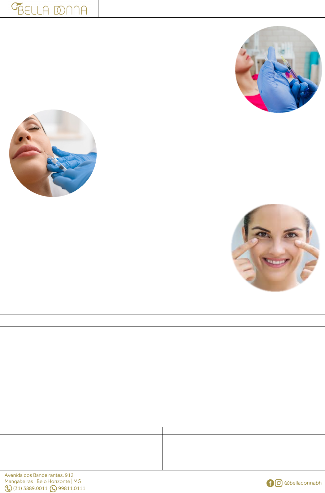 PREENCHIMENTO Preenchimento cutâneo é uma técnica empregada para correção de sulcos, rugas e cicatrizes, por meio da injeção de substâncias sob a área da pele a ser tratada, elevando-a e, assim, diminuindo a profundidade. Um dos principais objetivos dos preenchedores é repor o volume da face e melhorar seus contornos. A maioria dos preenchedores atualmente são géis bioestéreis a base de Ácido Hialurônico, de ação temporária, isto é, com o tempo serão absorvidos pelo organismo. Após a aplicação do produto, a área pode ficar levemente avermelhada e inchada podendo aparecer hematoma que sumirão espontaneamente. Alergias, gestação, amamentação, doenças prévias e uso de medicação rotineira devem ser informados ao médico. O risco de alergia é raro. Geralmente de uso facial, sua função é amenizar rugas finas, cicatrizes superficiais, sulcos como o nasogeniano (popularmente chamado de bigode chinês), clareamento das olheiras, aumento ou desenho dos lábios ou correção da perda de coxins gordurosos e ósseos. São armazenados em seringas de 1,0 ml e aplicados através de infiltrações na área a ser corrigida. O volume utilizado ficará a critério médico, podendo ser necessário menos de 1ml ou volume maior. É um procedimento relativamente simples, realizado com segurança em consultório, com anestesia tópica, anestesia infiltrativa local ou até mesmo intra-oral. O resultado do preenchimento já pode ser observado imediatamente após o procedimento Dependendo da área a ser tratada e do tipo de pele, é esperado que os resultados sejam mantidos entre 6 e 12 meses, mas a duração do efeito pode ser menor ou maior. Novas infiltrações podem ser realizadas quando necessárias, e os tratamentos subsequentes ajudam a manter o grau de correção desejado. Os preenchedores podem ser realizados em combinação com outros procedimentos para melhorar o resultado final, como o uso de toxina botulínica, lasers e peelings. ORIENTAÇÕES APÓS O PROCEDIMENTO: § Seguir rigorosamente a prescrição e orientações médicas. Não usar ácidos sem prescrição médica. § Evitar exercícios e atividades vigorosas no dia da aplicação. § Se houver hematoma a aplicação de gelo local é indicada. Evitar exposição ao sol. § A utilização de maquiagem após 6 horas da aplicação, que poderá ajudar a esconder pequenos hematomas que possam surgir. § Usar filtro solar rotineiramente. As fotos realizadas são exclusivamente para acompanhamento médico e não serão utilizadas sem a sua autorização escrita. Em relação ao estado global do paciente, todo procedimento cirúrgico, infiltrativo e/ou químico, envolve algum tipo de risco à saúde. Esse risco varia conforme o tipo de procedimento, as condições clínicas do paciente, o tempo de duração do procedimento e o tipo de anestesia, se realizada. A decisão voluntária de submeter-se a tais procedimentos é feita considerando a possibilidade, ainda que remota, de ocorrerem complicações leves, moderadas ou graves, podendo até mesmo causar prejuízo transitório ou permanente à saúde do paciente. Em caso de alterações do quadro clínico ou dúvidas, comunique imediatamente a Clínica Bella Donna e/ou ao profissional responsável! TERMO DE CONSENTIMENTO LIVRE E ESCLARECIDO Eu, _________________________________________________________________________________________________________________________, declaro que fui suficientemente esclarecido(a) sobre o tratamento e estou ciente e concordo com o mesmo. Fui informado(a) sobre os benefícios, os riscos, as indicações, contraindicações, possíveis efeitos colaterais e advertências gerais. Confirmo que entendi todas as explicações que me foram fornecidas de forma clara e simples, inclusive respondendo minhas perguntas, quando necessário, não ficando dúvidas sobre o procedimento ao qual serei submetido(a). Estou ciente de que cada pessoa possui especificidades e metabolismo próprio, e o resultado do procedimento não pode ser previsto ou garantido pelo profissional. Tudo depende do meu empenho para seguir as orientações que me foram dadas. Por estar ciente de que a medicina não é uma ciência exata e que é impossível prever os resultados de quaisquer práticas médicas, aceito o fato de que não podem ser dadas garantias de resultados dos procedimentos, seja quanto ao percentual de melhora, seja em termos de idade aparente ou permanência dos resultados que forem atingidos. A Equipe Bella Donna alerta de que algumas atitudes são recomendadas para todas as pessoas, seja qual for o tratamento escolhido, a fim de alcançar os resultados desejados: controlar o peso, beber 2.000 ml de água por dia, praticar atividades físicas pelo menos 3X por semana, alimentar-se de 3 em 3 horas, evitar frituras, cigarros, excessos de doce e bebidas alcoólicas e preservar um sono tranquilo e restaurador. Por este termo o cliente declara que não possui nenhumas das enfermidades/condições questionadas pelo profissional, que poderiam ser consideradas impeditivas para a execução do procedimento, nem estar grávida, em período de lactação ou ter qualquer infecção, inflamação localizada ou alergias conhecidas. O cliente declara ainda não ter ocultado nenhuma informação a respeito de sua saúde, uso de medicamentos e hábitos de vida. ASSINATURA DO CLIENTE PROFISSIONAL RESPONSÁVEL