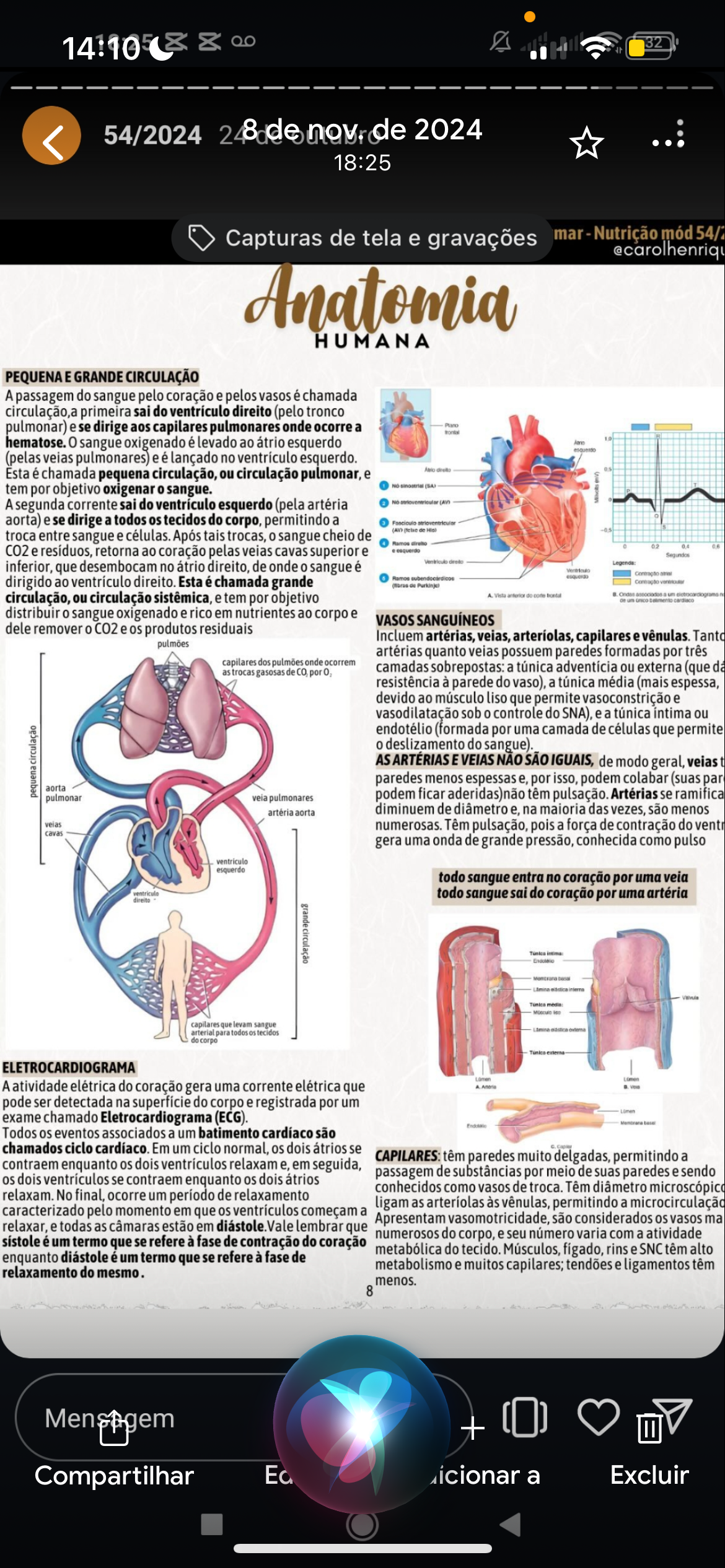 32 54/2024 2024 18:25 . Capturas de tela e gravações mar Nutrição mód 54/2 @carolhenriqu Anatomia HUMANA PEQUENA E GRANDE CIRCULAÇÃO A passagem do sangue pelo coração e pelos vasos é chamada circulação,a primeira sai do ventrículo direito (pelo tronco pulmonar) e se dirige aos capilares pulmonares onde ocorre a hematose. 0 sangue oxigenado é levado ao átrio esquerdo esquerdo (pelas veias pulmonares) e é lançado no ventrículo esquerdo. Esta é chamada pequena circulação, ou circulação pulmonar, e tem por objetivo oxigenar 0 sangue. (SA) A segunda corrente sai do ventrículo esquerdo (pela artéria (AV) aorta) e se dirige a todos os tecidos do corpo, permitindo a Fasciculo troca entre sangue e células. Após tais trocas, 0 sangue cheio de Ramos CO2 e resíduos, retorna ao coração pelas veias cavas superior e Segundos inferior, que desembocam no átrio direito, de onde 0 sangue é Ramos dirigido ao ventrículo direito. Esta é chamada grande circulação, ou circulação sistêmica, e tem por objetivo Vista de distribuir 0 sangue oxigenado e rico em nutrientes ao corpo e VASOS SANGUÍNEOS dele remover 0 CO2 e os produtos residuais Incluem artérias, veias, capilares e vênulas. Tanto pulmões artérias quanto veias possuem paredes formadas por três capilares dos pulmões onde ocorrem as trocas gasosas de CO por camadas sobrepostas: a túnica adventícia ou externa (que dá resistência à parede do vaso), a túnica média (mais espessa, devido ao músculo liso que permite vasoconstrição e vasodilatação sob 0 controle do SNA), e a túnica íntima ou endotélio (formada por uma camada de células que permite pequena circulação 0 deslizamento do sangue). AS ARTÉRIAS E VEIAS NÃO SÃO IGUAIS, de modo geral, veias t paredes menos espessas e, por isso, podem colabar (suas par aorta pulmonar veia pulmonares podem ficar aderidas)não têm pulsação. Artérias se ramifica artéria aorta diminuem de diâmetro e, na maioria das vezes, são menos veias numerosas. Têm pulsação, pois a força de contração do ventr cavas gera uma onda de grande pressão, conhecida como pulso ventriculo esquerdo todo sangue entra coração por uma veia ventriculo todo sangue sai do coração por uma artéria direito capilares que levam sangue arterial para todos tecidos ELETROCARDIOGRAMA A atividade elétrica do coração gera uma corrente elétrica que A pode ser detectada na superfície do corpo e registrada por um exame chamado Eletrocardiograma (ECG). Todos os eventos associados a um batimento cardíaco são chamados ciclo cardíaco. Em um ciclo normal, os dois átrios se contraem enquanto os dois ventrículos relaxam e, em seguida, CAPILARES: têm paredes muito delgadas, permitindo a os dois ventrículos se contraem enquanto os dois átrios passagem de substâncias por meio de suas paredes e sendo relaxam. No final, ocorre um período de relaxamento conhecidos como vasos de troca. Têm diâmetro microscópico ligam as arteríolas às vênulas, permitindo a microcirculação caracterizado pelo momento em que os ventrículos começam a relaxar, e todas as câmaras estão em diástole Vale lembrar que Apresentam vasomotricidade, são considerados os vasos ma sístole é um termo que se refere à fase de contração do coração numerosos do corpo, e seu número varia com a atividade enquanto diástole é um termo que se refere à fase de metabólica do tecido. Músculos, fígado, rins e SNC têm alto relaxamento do mesmo. metabolismo e muitos capilares; tendões e ligamentos têm menos. 8 Mensagem + Compartilhar icionar Excluir