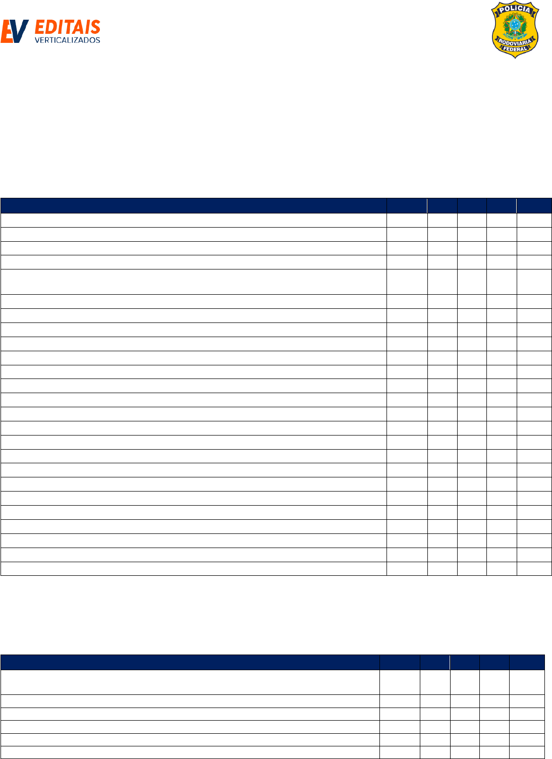 EDITAL VERTICALIZADO POLÍCIA RODOVIÁRIA FEDERAL - PRF www.editaisverticalizados.com.br EDITAL VERTICALIZADO POLÍCIA RODOVIÁRIA FEDERAL EDITAL 2021 LÍNGUA PORTUGUESA Estudo Rev.1 Rev.2 Rev.3 Exerc. 1 Compreensão e interpretação de textos de gêneros variados. 2 Reconhecimento de tipos e gêneros textuais. 3 Domínio da ortografia oficial. 4 Domínio dos mecanismos de coesão textual. 4.1 Emprego de elementos de referenciação, substituição e repetição, de conectores e de outros elementos de sequenciação textual. 4.2 Emprego de tempos e modos verbais. 5 Domínio da estrutura morfossintática do período. 5.1 Emprego das classes de palavras. 5.2 Relações de coordenação entre orações e entre termos da oração. 5.3 Relações de subordinação entre orações e entre termos da oração. 5.4 Emprego dos sinais de pontuação. 5.5 Concordância verbal e nominal. 5.6 Regência verbal e nominal. 5.7 Emprego do sinal indicativo de crase. 5.8 Colocação dos pronomes átonos. 6 Reescrita de frases e parágrafos do texto. 6.1 Significação das palavras. 6.2 Substituição de palavras ou de trechos de texto. 6.3 Reorganização da estrutura de orações e de períodos do texto. 6.4 Reescrita de textos de diferentes gêneros e níveis de formalidade. 7 Correspondência oficial (conforme Manual de Redação da Presidência da República). 7.1 Aspectos gerais da redação oficial. 7.2 Finalidade dos expedientes oficiais. 7.3 Adequação da linguagem ao tipo de documento. 7.4 Adequação do formato do texto ao gênero. RACIOCÍNIO LÓGICO-MATEMÁTICO Estudo Rev.1 Rev.2 Rev.3 Exerc. 1 Modelagem de situações-problema por meio de equações do 1º e 2º graus e sistemas lineares. 2 Noção de função. 2.1 Análise gráfica. 2.2 Funções afim, quadrática, exponencial e logarítmica. 2.3 Aplicações. 3 Taxas de variação de grandezas. EDITAL VERTICALIZADO POLÍCIA RODOVIÁRIA FEDERAL - PRF www.editaisverticalizados.com.br Estudo Rev.1 Rev.2 Rev.3 Exerc. 3.1 Razão e proporção com aplicações. 3.2 Regra de três simples e composta. 4 Porcentagem. 5 Regularidades e padrões em sequências. 5.1 Sequências numéricas. 5.2 Progressão aritmética e progressão geométrica. 6 Noções básicas de contagem, probabilidade e estatística. 7 Descrição e análise de dados. 7.1 Leitura e interpretação de tabelas e gráficos apresentados em diferentes linguagens e representações. 7.2 Cálculo de médias e análise de desvios de conjuntos de dados. 8 Noções básicas de teoria dos conjuntos. 9 Análise e interpretação de diferentes representações de figuras planas, como desenhos, mapas e plantas. 9.1 Utilização de escalas. 9.2 Visualização de figuras espaciais em diferentes posições. 9.3 Representações bidimensionais de projeções, planificações e cortes. 10 Métrica. 10.1 Áreas e volumes. 10.2 Estimativas. 10.3 Aplicações INFORMÁTICA Estudo Rev.1 Rev.2 Rev.3 Exerc. 1 Conceito de internet e intranet. 2. Conceitos e modos de utilização de tecnologias, ferramentas, aplicativos e procedimentos associados a internet/intranet. 2.1 Ferramentas e aplicativos comerciais de navegação, de correio eletrônico, de grupos de discussão, de busca, de pesquisa, de redes sociais e ferramentas colaborativas. 2.2 Noções de sistema operacional (ambiente Windows). 2.3 Acesso a distância a computadores, transferência de informação e arquivos, aplicativos de áudio, vídeo e multimídia. 3 Transformação digital. 3.1 Internet das coisas (IoT). 3.2 Big data. 3.3 Inteligência artificial. 4 Conceitos de proteção e segurança. 4.1 Noções de vírus, worms, phishing e pragas virtuais. 4.2 Aplicativos para segurança (antivírus, firewall, anti-spyware, VPN, etc.). 5 Computação na nuvem (cloud computing). FÍSICA Estudo Rev.1 Rev.2 Rev.3 Exerc. 1 Cinemática escalar, cinemática vetorial. 2 Movimento circular. 3 Leis de Newton e suas aplicações. 4 Trabalho. EDITAL VERTICALIZADO POLÍCIA RODOVIÁRIA FEDERAL - PRF www.editaisverticalizados.com.br Estudo Rev.1 Rev.2 Rev.3 Exerc. 5 Potência. 6 Energia cinética, energia potencial, atrito. 7 Conservação de energia e suas transformações. 8 Quantidade de movimento e conservação da quantidade de movimento, impulso. 9 Colisões. ÉTICA E CIDADANIA Estudo Rev.1 Rev.2 Rev.3 Exerc. 1 Ética e moral. 2 Ética, princípios e valores. 3 Ética e função pública: integridade. 4. Ética no setor público. 4.1 Princípios da Administração Pública: moralidade (art. 37 da CF). 4.2. Deveres dos servidores públicos: moralidade administrativa (Lei nº 8.112/1990, art. 116, IX). 4.3 Política de governança da administração pública federal (Decreto nº 9.203/2017). 4.4. Promoção da ética e de regras de conduta para servidores. 4.4.1. Código de Ética Profissional do Servidor Público Civil do Poder Executivo Federal (Decreto nº 1.171/1994). 4.4.2 Sistema de Gestão da Ética do Poder Executivo Federal e Comissões de Ética (Decreto nº 6.029/2007). 4.4.3 Código de Conduta da Alta Administração Federal (Exposição de Motivos nº 37/2000). 5 Ética e democracia: exercício da cidadania. 5.1 Promoção da transparência ativa e do acesso à informação (Lei nº 12.527/2011 e Decreto nº 7.724/2012). 5.2. Tratamento de conflitos de interesses e nepotismo (Lei nº 12.813/2013 e Decreto nº 7.203/2010). GEOPOLÍTICA Estud o Rev.1 Rev.2 Rev.3 Exerc. 1 O Brasil político: nação e território. 2 Organização do Estado Brasileiro. 3 A divisão interregional do trabalho e da produção no Brasil. 4 A estrutura urbana brasileira e as grandes metrópoles. 5 Distribuição espacial da população no Brasil e movimentos migratórios internos. 6 Integração entre indústria e estrutura urbana e setor agrícola no Brasil. 7 Rede de transporte no Brasil: modais e principais infraestruturas 8 A integração do Brasil ao processo de internacionalização da economia. 9 Geografia e gestão ambiental. 10 Macrodivisão natural do espaço 