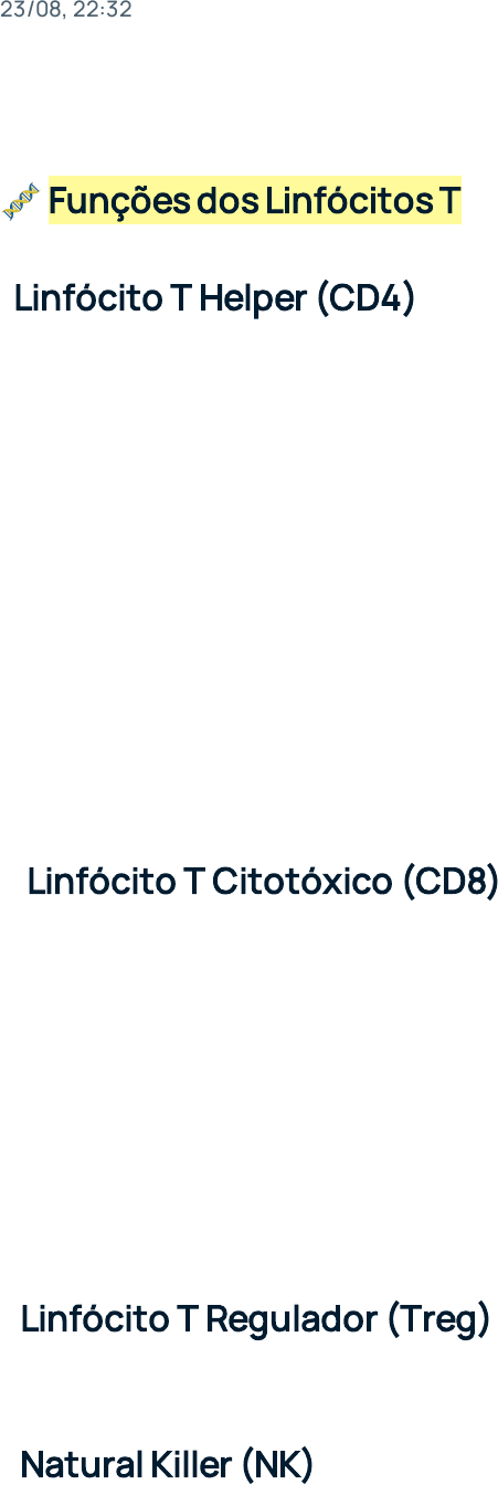 23/08, 22:32 Imunologia - componentes do sist. imune - aula 3 🧬 Funções dos Linfócitos T Linfócito T Helper (CD4) Atua secretando citocinas que mediam a comunicação entre células do sistema imunológico. Reconhece antígenos apresentados por células apresentadoras (como macrófagos e células dendríticas). Decide qual célula ativar: macrófagos para fagocitose, linfócitos B para produção de anticorpos, ou linfócitos T citotóxicos para imunidade celular. * Pode ativar linfócitos B para diferenciação em plasmócitos, que secretam anticorpos, e formar células de memória para respostas futuras. * Também pode ativar linfócitos T citotóxicos (TCD8) e atrair macrófagos para o local da infecção. Linfócito T Citotóxico (CD8) * Atua na imunidade celular, eliminando células infectadas por vírus ou bactérias intracelulares. * Reconhece células infectadas pela exposição de antígenos via moléculas MHC de classe 1 na superfície da célula. * Mata a célula infectada liberando proteínas perforina (que cria poros na membrana) e granzima (que induz apoptose - morte celular). * Não produz anticorpos nem tem meio termo: sua função é destruir a célula infectada. Linfócito T Regulador (Treg) Atua suprimindo a resposta imune para evitar reações exageradas e manter a autotolerância, prevenindo doenças autoimunes. Natural Killer (NK) Faz parte da imunidade inata, com ação semelhante ao TCD8, destruindo células infectadas sem reconhecimento específico. * Atua nas primeiras horas após a entrada do antígeno. * Não gera memória imunológica e não é uma resposta especializada. 🧩 Complexo Principal de Histocompatibilidade (MHC) * Conjunto de genes que codificam moléculas responsáveis pela apresentação de antígenos às células do sistema imunológico. MHC de Classe 1 * Expressa em praticamente todas as células nucleadas do organismo. * Apresenta antígenos de células infectadas para linfócitos TCD8 ( Citotóxico) e células Natural Killer. * Permite o reconhecimento de células infectadas ou anormais para destruição. MHC de Classe 2 * Expressa em células apresentadoras de antígenos, como macrófagos, células dendríticas e linfócitos T helper. * Apresenta antígenos para linfócitos T helper, ativando a resposta imune adaptativa. * Importância na histocompatibilidade para transplantes: compatibilidade de MHC evita rejeição do enxerto. 🧫 Processo de Reconhecimento e Ativação Imunológica * Células infectadas expõem fragmentos antigênicos via MHC classe 1 para serem reconhecidas pelo TCD8 ( Linfócito- T Citotóxico). * Células apresentadoras fagocitam antígenos e apresentam via MHC classe 2 para linfócitos T helper ( TCD4). * Linfócito T helper, ao reconhecer o antígeno, secreta citocinas para ativar outras células imunológicas. * Linfócitos TCD8, ativados, localizam e destroem células infectadas por meio da liberação de perforina e granzima. * Linfócitos B, ativados pelo T helper, diferenciam-se em plasmócitos e produzem anticorpos para imunidade humoral. 🧪 Citocinas e Fatores de Crescimento * Citocinas são proteínas que mediam a comunicação e coordenação entre células do sistema imunológico. * São essenciais não só para ativar células, mas também para a diferenciação e maturação de células hematopoiéticas. * Exemplos incluem interleucinas (IL-3, IL-6, IL-7, IL-10), fator estimulador de colônia de monócitos (MCSF), fator de célula-tronco (SCF), entre outros. * Citocinas influenciam a hematopoiese, direcionando células-tronco para diferentes linhagens celulares. 🏥 Órgãos Linfóides e Maturação dos Linfócitos * Medula óssea é o local de origem das células sanguíneas e maturação dos linfócitos B. * Timo é o órgão onde ocorre a maturação dos linfócitos T e o desenvolvimento da tolerância autoimune, com participação dos linfócitos T reguladores. * O timo regrede com a idade, permanecendo apenas resquícios na vida adulta. * Linfócitos maduros residem em órgãos linfóides secundários como linfonodos, baço e tecidos linfóides associados. * Linfócitos imaturos ou virgens circulam entre medula, linfonodos e sangue, sendo ativados após reconhecimento do antígeno e sinalização por citocinas. 🐭 Modelo Experimental: Camundongo Nude para Sistema Imunológico * Camundongos geneticamente modificados que não produzem linfócitos T e B são usados para pesquisas. * Esses camundongos possuem sistema imunológico deficiente, mas mantêm células Natural Killer. * São utilizados para testar segurança de células, crescimento tumoral e para estudos de imunologia e terapias. * Necessitam de ambiente estéril para sobrevivência devido à imunodeficiência. 🩺 Sistema Linfático e Resposta Imune * Sistema linfático é uma rede de vasos que auxilia na drenagem de líquidos e na resposta imune adaptativa. * Linfonodos são locais de armazenamento e ativação de linfócitos. * Linfonodomegalia (aumento dos linfonodos) pode indicar infecção ou neoplasia, como linfoma. * Linfoma é uma neoplasia maligna dos linfócitos, agressiva e de difícil tratamento, podendo afetar múltiplos linfonodos e órgãos como o baço. * Baço atua na filtragem de células sanguíneas, armazenamento de ferro e resposta imune, podendo ser removido com compensações pelo fígado. 🧠 Resumo das Funções das Principais Células Imunológicas * Linfócito T CD4 ( T- Helper): coordena resposta imune via secreção de citocinas, ativa linfócitos B, TCD8 e macrófagos. * Linfócito T CD8 ( T- Citotóxicos): destrói células infectadas e tumorais. * Linfócito T regulador: suprime respostas imunes exageradas e mantém autotolerância. * Linfócito B: produz anticorpos após ativação e diferenciação em plasmócitos. * Natural Killer: destrói células infectadas na imunidade inata, sem memória. * Monócitos/macrófagos: fagocitam e apresentam antígenos. * Neutrófilos: primeira linha de defe