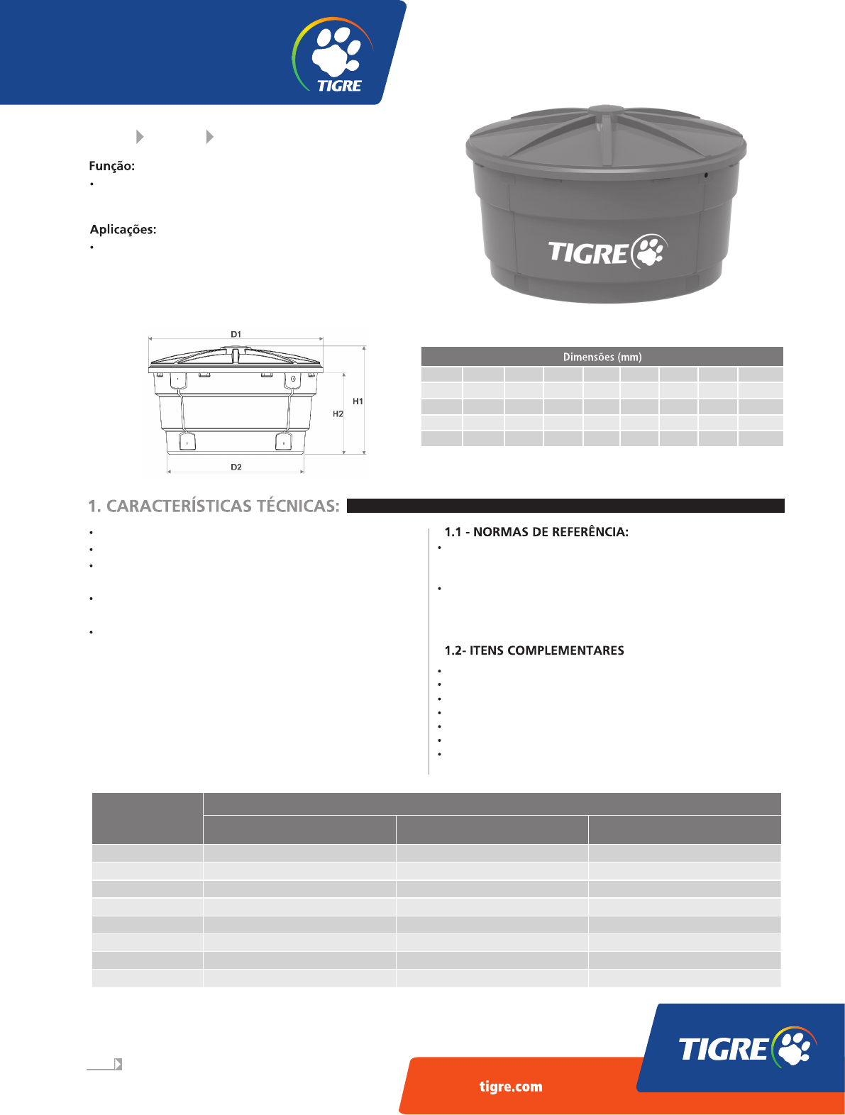 JU N H O /2 01 6 As Novas Caixas d' Água Tigre são tanques destinados a arma- zenar água potável (rede pública) para consumo humano. As Novas Caixas d' Água Tigre podem ser aplicadas em obras residenciais e comerciais, podendo ser utilizadas também na agricultura, psicultura, ou qualquer outra atividade que necessite de reservação de água potável à temperatura ambiente. Matéria Prima: PEMD - Polietileno de Média Densidade; Processo de Fabricação: Rotomoldagem; Sistema de fechamento total e seguro: A tampa possui uma aba que se encaixa perfeitamente ao corpo. Marcação para furos no corpo da caixa: Garantia de furação sem erro. Manual de Instrução: Adesivo colado no corpo do produto; Adaptador para Caixa d’Água com Registro; Adaptador com Anel para Caixa d’Água; Torneira Boia Click Torneira Boia para Caixa d’Água; Linha Soldável; Fita Veda Rosca; Kit para instalação de caixa d’água (já vem com todos os produtos necessários para a instalação da caixa). São fabricadas de acordo com a norma NBR 14799 - Reservatório poliolefínico para água potável de volume nominal de até 2000 litros - Requisitos. E para reservatórios acima de 2000 litros, de acordo com a norma NBR 15682 - Tanque estacionário rotomoldado em polietileno (PE) para acondicionamento de águas - Requisitos. Localização no website Tigre: Predial Água Fria CAIXAS D´ÁGUA *Valores Aproximados Dados TécnicosNovas Caixas d`Água Tigre 01/04 Cotas D1 D2 H1 H2 310 500 750 100 1500 2000 3000 5000 310 500 750 100 1500 2000 3000 5000 328,2 510,5 741,5 953,3 1418,4 1859,2 3061,1 5100,7 7,51 10,02 13,84 17,30 24,55 34,89 54,73 113,40 310 1039,0 812,9 644,0 523,4 500 1212,0 978,3 719,0 573,1 750 1308,0 1053,9 861,7 702,7 1000 1440,0 1148,3 941,0 765,0 1500 1702,2 1419,4 980,0 768,4 2000 1821,5 1520,3 1106,0 877,8 3000 2155,0 1721,7 1380,0 1124,1 5000 2530,0 1849,0 1810,0 1505,0 Modelo Volume Nominal (L) Pesos e Volumes Volume Efetivo (L) Peso com Tampa (Kg) Facilidade de instalação: Rebaixos planos na lateral; Marcação para tubulação de entrada e de saída; Manual de instruções no corpo do produto; Mais leve; Recomenda-se que a base para instalação da caixa seja lisa, nivelada, isenta de sujeira ou materiais pontiagudos, podendo ser: Caso seja de madeira, as tábuas deverão ser de mesma espessura e resistência, sem espaçamento entre elas. IMPORTANTE: A base deve ter resistência compatível com o peso da caixa cheia (ex.: 1000 litros = 1000 Kg) e deve ser maior do que a largura do fundo da caixa. Facilidade de limpeza: superfície interna lisa que evita incrustações; Não contaminam a água, pois a matéria prima é totalmente atóxica; Durabilidade: resiste a intempéries. De entrada (para alimentação da caixa); De saída (para distribuição da água para a edificação); Extravasor (para permitir escoamento de eventual excesso de água, evitando transbordamento); De limpeza (para escoamento da água após a limpeza da caixa d’água). ADAPTADOR COM REGISTRO APOIO ADAPTADOR COM REGISTRO ADAPTADOR COM REGISTRO ADAPTADOR P/ CAIXA D’AGUA O furo para colocação da tubulação de saída deverá ser feito sempre no rebaixo plano inferior existente na lateral da caixa, através de serra-copo. Ao furar, utilize a marcação correspondente a bitola do adaptador. 50 50 50 50 40 40 40 40 32 32 32 32 25/22 25/22 25/22 25/22 Base de Concreto (Fig. 1) Base de Madeira (Fig. 2) Para a fixação do conjunto a base de assentamento, utilize tirantes que se fixem ao piso. O furo para colocação da tubulação de entrada deverá ser feito no relevo plano superior. Ao furar, utilize a marcação existente considerando-a como o centro do furo. 02/04 1000 1153 1360 310 500 1000 645 645 645 556 686 866 490 620 800 9,12 12,37 19,20 Modelo Peso com Tampa (Kg) Dimensões e Peso - Caixas Fechadas D1 D2 (Boca) H1 H2 PREVENTIVA: Limpeza da caixa d’água; Passo 1: Feche o registro da entrada de água da casa ou amarre a boia da caixa. Uma melhor solução é a instalação do exclusivo Adaptador para Caixa d'Água com Registro TIGRE, que permite a interrupção do fornecimento de água sem o improviso de se amarrar a haste da torneira boia. A caixa possui formato cônico que permite o encaixe de uma sobre a outra, economizando espaço na estocagem. Devem ser empilhadas em superfície plana, conforme quantidade espe- cificada na tabela abaixo. ADAPTADOR COM REGISTRO ADAPTADOR COM REGISTRO ADAPTADOR COM REGISTRO Passo 3: Tampe a saída com um tampão ou pano, ou no caso do uso do Adaptador com Registro TIGRE, feche o registro de saída, para evitar que a água com sujeira que ficou no fundo não desça pela tubulação de distribuição da casa. Passo 4: Utilize a água de fundo para lavar as paredes e o fundo da caixa com um pano limpo. Evite o uso de escova de aço e vassoura. Nunca use sabão, detergente ou outro produto. Retire a água da lavagem e a sujeira com uma pá de plástico, baldes e panos. Utilize panos limpos para secar o fundo. Evite passá-los nas paredes da caixa. Passo 5: Ainda com as saídas da caixa fechadas, deixe entrar um palmo de altura de água e adicione água sanitária na proporção de 100mL de água sanitária para cada 100L de água na caixa d'água e deixe por 2 horas. Com uma luva, broxa, balde ou caneca plástica, molhe as paredes internas com esta solução desinfetante. A cada 30 minutos verifique se as paredes internas da caixa secara, caso isso ocorra, fazer nova aplicação dessa mistura até completar as 2 horas. Obs.: Não use de forma nenhuma essa água durante 2 horas. Passo 6: Passada as 2 horas, ainda com o registro de entrada fechado ou a boia amarrada, esvazie a caixa abrindo a saída, todas as torneiras da casa e acionando as descargas, de modo a deixar toda a água de lavagem sair. Assim estamos desinfetando toda a tubulação. Para evitar o desperdício, use essa água para lavar pisos e calçadas. Passo 7: Lave a tampa com água corrente e tampe ad