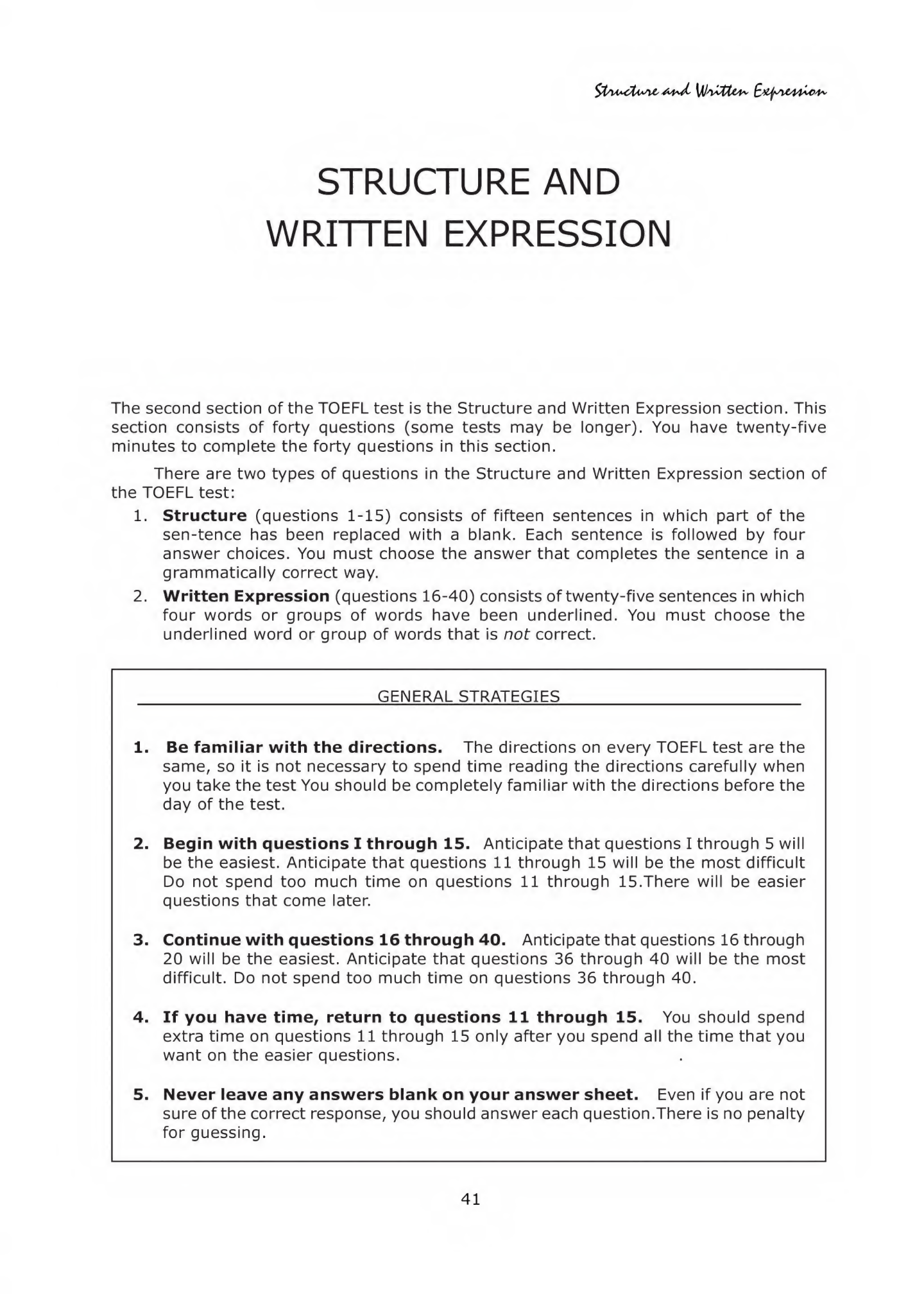 1£)tjsit44^C'b' STRUCTURE AND WRITTEN EXPRESSION The second section of the TOEFL test is the Structure and Written Expression section. This section consists of forty questions (some tests may be longer). You have twenty-five minutes to complete the forty questions in this section. There are two types of questions in the Structure and Written Expression section of the TOEFL test: 1. Structure (questions 1-15) consists of fifteen sentences in which part of the sen-tence has been replaced with a blank. Each sentence is followed by four answer choices. You must choose the answer that completes the sentence in a grammatically correct way. 2. Written Expression (questions 16-40) consists of twenty-five sentences in which four words or groups of words have been underlined. You must choose the underlined word or group of words that is not correct. GENERAL STRATEGIES 1. Be familiar with the directions. The directions on every TOEFL test are the same, so it is not necessary to spend time reading the directions carefully when you take the test You should be completely familiar with the directions before the day of the test. 2. Begin with questions I through 15. Anticipate that questions I through 5 will be the easiest. Anticipate that questions 11 through 15 will be the most difficult Do not spend too much time on questions 11 through 15.There will be easier questions that come later. 3. Continue with questions 16 through 40. Anticipate that questions 16 through 20 will be the easiest. Anticipate that questions 36 through 40 will be the most difficult. Do not spend too much time on questions 36 through 40. 4. If you have time, return to questions 11 through 15. You should spend extra time on questions 11 through 15 only after you spend all the time that you want on the easier questions. 5. Never leave any answers blank on your answer sheet. Even if you are not sure of the correct response, you should answer each question.There is no penalty for guessing. 41 THE STRUCTURE QUESTIONS In the TOEFL test, questions 1 through 15 of the Structure and Written Expression section test your knowledge of the correct structure of English sentences. The questions in this section are multiple-choice questions in which you must choose the letter of the answer that best completes the sentence. Example is taking a trip to New York. (A) They (B) When (C) The woman (D) Her In this example, you should notice immediately that the sentence has a verb (is taking), and that the verb needs a subject. Answers (B) and (D) are incorrect because when and her are not subjects. In answer (A), they is a subject, but they is plural and the verb is taking is singular. The correct answer is answer (C); the woman is a singular subject. You should therefore choose answer (C). STRATEGIES FORTHE STRUCTURE QUESTIONS 1. First study the sentence. Your purpose is to determine what is needed to complete the sentence correctly. 2. Then study each answer based on how well it completes the sentence. Eliminate answers that do not complete the sentence correctly. 3. Do not try to eliminate incorrect answers by looking only at the answers. The incorrect answers are generally correct by themselves.The incorrect answers are generally incorrect only when used to complete the sentence. 4. Never leave any answers blank. Be sure to answer each question even if you are unsure of the correct response. 5. Do not spend too much time on the Structure questions. Be sure to leave adequate time for the Written Expression questions. The following skills will help you to implement these strategies in the Structure section of the TOEFL test. 42 SENTENCES WITH ONE CLAUSE fy/u*cU*fie Sxfsi&wlc'h' Some sentences in English have just one subject and verb, and it is very important for you to find the subject and verb in these sentences. In some sentences it is easy to find the subject and verb. However, certain structures, such as objects of prepositions, appositives, and participles, can cause confusion in locating the subject and verb because each of these structures can look like a subject or verb. The object of the preposition can be mistaken for a subject. Therefore, you should be able to do the following in sentences with one subject and verb: (1) be sure the sentence has a subject and a verb, (2) be careful of objects of prepositions and appositives when you are looking for the subject, and (3) be careful of present participles and past participles when you are looking for the verb. Skill 1: BE SURE THE SENTENCE HAS A SUBJECT AND A VERB You know that a sentence in English should have a subject and a verb. The most common types of problems that you will encounter in the Structure section of the TOEFL test have to do with subjects and verbs: perhaps the sentence is missing either the subject or the verb or both, or perhaps the sentence has an extra subject or verb. Example I _was backed up for miles on the freeway. (A) Yesterday (B) In the morning (C) Traffic (D) Cars In this example you should notice immediately that there is a verb (was), but there is no subject. Answer (C) is the best answer because it is a singular subject that agrees with the singular verb was. Answer (A), yesterday, and answer (B), in the morning, are not subjects, so they are not correct. Although answer (D), cars, could be a subject, it is not correct because cars is plural and it does not agree with the singular verb was. Example II Engineers_for work on the new space program. (A) necessary (B) are needed (C) hopefully (D) next month In this example you should notice immediately that the sentence has a subject (engineers), and that there is no verb. Because answer (B), are needed, is a verb, it is the best answer. Answers (A), (C), and (D) are not verbs, so they are not correct. 43 Example III The boy_going to the movies with a friend. (A) he is (B) he always was (C) is relaxing (D) will be This sentence has a subject (boy) and has part of a verb (going)-, to be correct, some form of the v