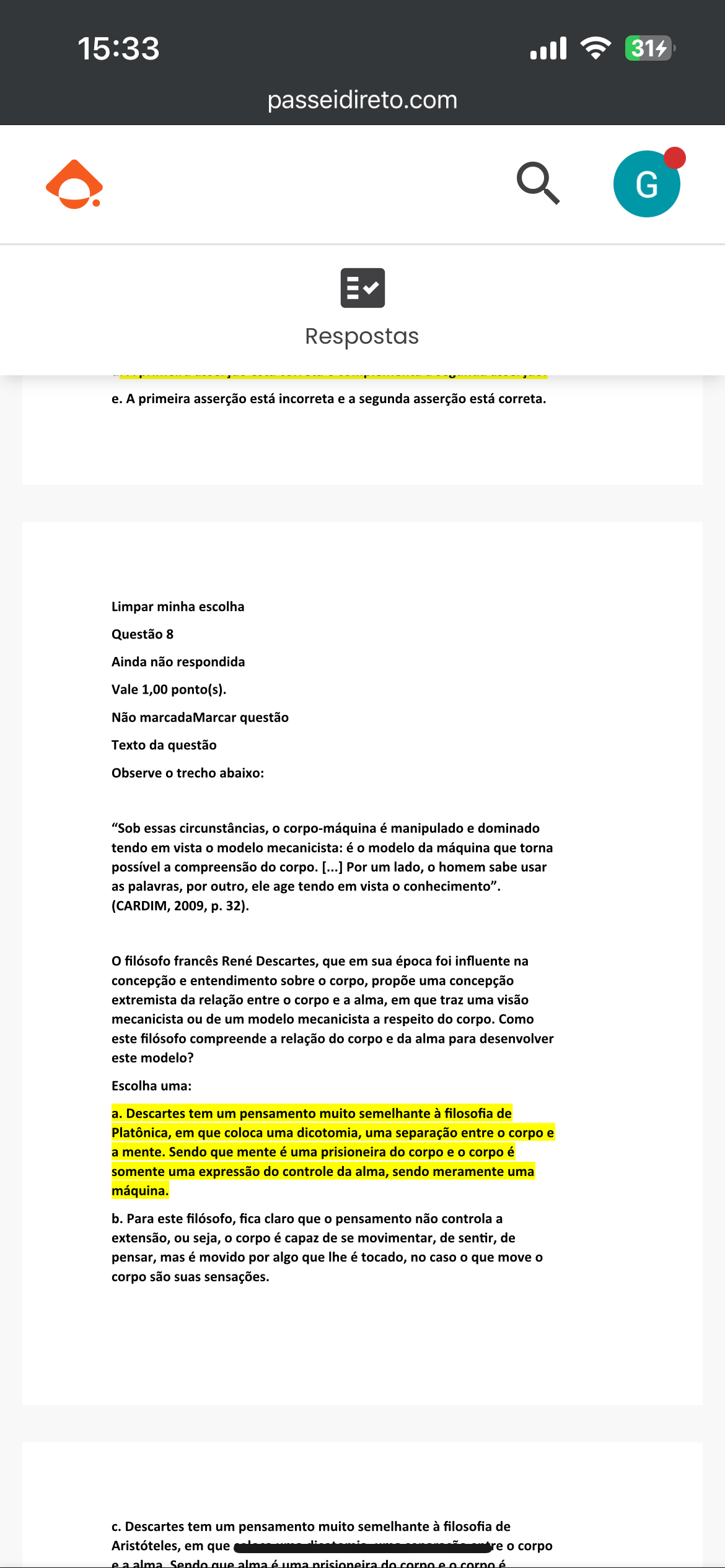 15:33 314 passeidireto.com G Respostas e. A primeira asserção está incorreta e a segunda asserção está correta. Limpar minha escolha Questão 8 Ainda não respondida Vale 1,00 ponto(s). Não marcadaMarcar questão Texto da questão Observe trecho abaixo: "Sob essas circunstâncias, o corpo-máquina é manipulado e dominado tendo em vista modelo mecanicista: é o modelo da máquina que torna possível a compreensão do corpo. [...] Por um lado, homem sabe usar as palavras, por outro, ele age tendo em vista conhecimento". (CARDIM, 2009, 32). o filósofo francês René Descartes, que em sua época foi influente na concepção e entendimento sobre corpo, propõe uma concepção extremista da relação entre corpo e a alma, em que traz uma visão mecanicista ou de um modelo mecanicista a respeito do corpo. Como este filósofo compreende a relação do corpo e da alma para desenvolver este modelo? Escolha uma: a. Descartes tem um pensamento muito semelhante à filosofia de Platônica, em que coloca uma dicotomia, uma separação entre corpo e a mente. Sendo que mente é uma prisioneira do corpo e corpo é somente uma expressão do controle da alma, sendo meramente uma máquina. b. Para este filósofo, fica claro que o pensamento não controla a extensão, ou seja, o corpo é capaz de se movimentar, de sentir, de pensar, mas é movido por algo que lhe é tocado, no caso o que move corpo são suas sensações. Descartes tem um pensamento muito semelhante à filosofia de Aristóteles, em que corpo ea alma é uma prisioneira do corno