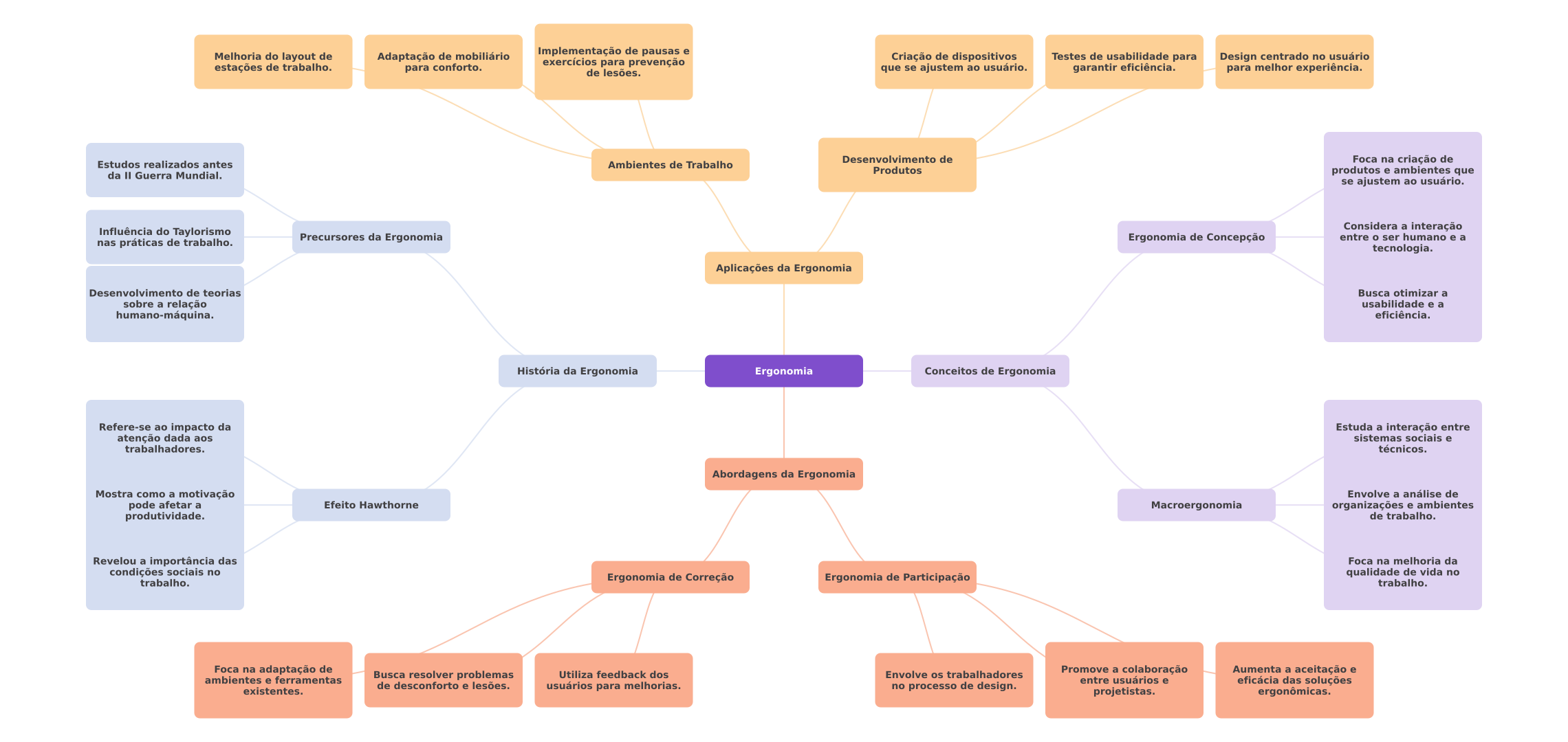 Melhoria do layout de Adaptação de mobiliário Implementação de pausas e Criação de dispositivos Testes de usabilidade para Design centrado no usuário estações de trabalho. para conforto. exercícios para prevenção de lesões. que se ajustem ao usuário. garantir eficiência. para melhor experiência. Desenvolvimento de Estudos realizados antes Foca na criação de Ambientes de Trabalho Produtos da Guerra Mundial. produtos e ambientes que se ajustem ao usuário. Considera a interação Influência do Taylorismo nas práticas de trabalho. Precursores da Ergonomia Ergonomia de Concepção entre ser humano e a tecnologia. Aplicações da Ergonomia Desenvolvimento de teorias Busca otimizar a sobre a relação usabilidade e a humano-máquina. eficiência. História da Ergonomia Ergonomia Conceitos de Ergonomia Refere-se ao impacto da Estuda a interação entre atenção dada aos sistemas sociais e trabalhadores. técnicos. Abordagens da Ergonomia Mostra como a motivação Envolve a análise de pode afetar a Efeito Hawthorne Macroergonomia organizações e ambientes produtividade. de trabalho. Revelou a importância das Foca na melhoria da condições sociais no Ergonomia de Correção Ergonomia de Participação qualidade de vida no trabalho. trabalho. Foca na adaptação de Busca resolver problemas Utiliza feedback dos Envolve os trabalhadores Promove a colaboração Aumenta a aceitação e ambientes e ferramentas entre usuários e de desconforto e lesões. existentes. usuários para melhorias. no processo de design. eficácia das soluções projetistas. ergonômicas.