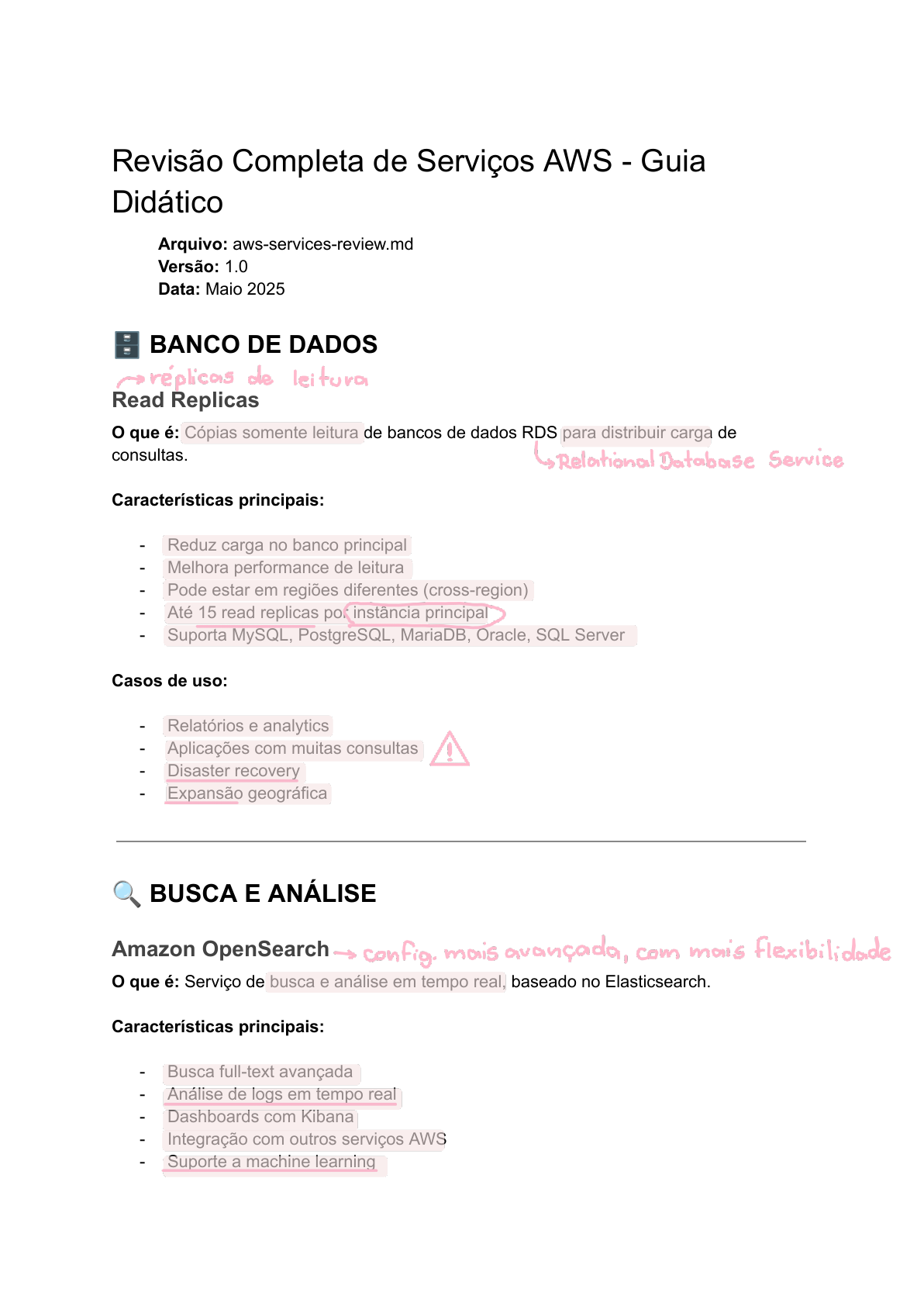 Revisão Completa de Serviços AWS - Guia Didático Arquivo: aws-services-review.md Versão: 1.0 Data: Maio 2025 🗄 BANCO DE DADOS Read Replicas O que é: Cópias somente leitura de bancos de dados RDS para distribuir carga de consultas. Características principais: - Reduz carga no banco principal - Melhora performance de leitura - Pode estar em regiões diferentes (cross-region) - Até 15 read replicas por instância principal - Suporta MySQL, PostgreSQL, MariaDB, Oracle, SQL Server Casos de uso: - Relatórios e analytics - Aplicações com muitas consultas - Disaster recovery - Expansão geográfica 🔍 BUSCA E ANÁLISE Amazon OpenSearch O que é: Serviço de busca e análise em tempo real, baseado no Elasticsearch. Características principais: - Busca full-text avançada - Análise de logs em tempo real - Dashboards com Kibana - Integração com outros serviços AWS - Suporte a machine learning Casos de uso: - Análise de logs de aplicações - Busca em e-commerce - Monitoramento de segurança - Business intelligence Amazon CloudSearch O que é: Serviço de busca gerenciado mais simples que o OpenSearch. Características principais: - Configuração simplificada - Busca em documentos e dados - Menor complexidade de gerenciamento - Ideal para casos de uso básicos Casos de uso: - Busca em sites simples - Catálogos de produtos básicos - Documentação interna 💾 ARMAZENAMENTO Amazon EFS (Elastic File System) O que é: Sistema de arquivos NFS totalmente gerenciado e escalável. Características principais: - Acesso simultâneo de múltiplas instâncias EC2 - Escalabilidade automática (petabytes) - Performance configurável (General Purpose vs Max I/O) - Throughput modes (Provisioned vs Bursting) - Integração com outros serviços AWS Casos de uso: - Aplicações que precisam compartilhar arquivos - Content management systems - Web serving - Data analytics - Machine learning training 📊 ANALYTICS E BUSINESS INTELLIGENCE Amazon QuickSight O que é: Serviço de business intelligence para criar dashboards e visualizações. Características principais: - Interface drag-and-drop - Machine learning integrado (QuickSight Q) - Compartilhamento de dashboards - Conectores para diversas fontes de dados - Pricing por usuário/sessão Casos de uso: - Dashboards executivos - Relatórios de vendas - Análise de KPIs - Self-service analytics Amazon Athena O que é: Serviço de consulta SQL serverless para dados no S3. Características principais: - Sem servidor para gerenciar - Paga apenas pelas consultas executadas - Suporte a vários formatos (CSV, JSON, Parquet, ORC) - Integração com QuickSight e outros serviços - Baseado no Presto Casos de uso: - Análise de logs do S3 - Data lake queries - Análise ad-hoc de dados - ETL simples 🏗 INFRAESTRUTURA COMO CÓDIGO AWS CloudFormation O que é: Serviço para provisionar recursos AWS usando templates JSON/YAML. Características principais: - Infrastructure as Code (IaC) - Versionamento de infraestrutura - Rollback automático em caso de falha - Stacks organizados - Templates reutilizáveis Casos de uso: - Automação de deployment - Ambientes consistentes (dev/test/prod) - Disaster recovery - Compliance e governance 🏛 ARQUITETURA E BOAS PRÁTICAS AWS Well-Architected Framework O que é: Framework com 6 pilares para construir arquiteturas seguras e eficientes. Os 6 Pilares: 1. Operational Excellence: Automação e monitoramento 2. Security: Proteção de dados e sistemas 3. Reliability: Capacidade de recuperação de falhas 4. Performance Efficiency: Uso eficiente de recursos 5. Cost Optimization: Controle de custos 6. Sustainability: Minimizar impacto ambiental Ferramentas: - Well-Architected Tool (avaliação gratuita) - Lenses especializadas - Whitepapers e guias 🔐 SEGURANÇA E MONITORAMENTO AWS CloudTrail O que é: Serviço de auditoria que registra todas as ações da API AWS. Características principais: - Log de todas as chamadas de API - Rastreamento de mudanças - Integração com CloudWatch - Compliance e governança - Detecção de atividades suspeitas Casos de uso: - Auditoria de segurança - Troubleshooting - Compliance regulatório - Análise forense AWS X-Ray O que é: Serviço de rastreamento distribuído para análise e debug de aplicações. Características principais: - Trace de requests end-to-end - Mapa visual de serviços - Análise de performance - Detecção de bottlenecks - Integração com Lambda, ECS, EC2 Casos de uso: - Debug de aplicações microservices - Análise de performance - Otimização de aplicações - Monitoramento de SLA AWS Certificate Manager (ACM) O que é: Serviço para provisionar e gerenciar certificados SSL/TLS. Características principais: - Certificados gratuitos para uso interno AWS - Renovação automática - Integração com ELB, CloudFront, API Gateway - Certificados privados (ACM Private CA) Casos de uso: - HTTPS em websites - Certificados para load balancers - API Gateway seguro - Aplicações internas 🔄 INTEGRAÇÃO E EVENTOS Amazon EventBridge O que é: Serviço serverless de event bus para integração de aplicações. Características principais: - Event-driven architecture - Integração com 100+ serviços AWS - SaaS integrations (Salesforce, Shopify, etc.) - Event patterns e filtering - Replay de eventos Casos de uso: - Arquiteturas orientadas a eventos - Integração com SaaS - Processamento de eventos em real-time - Orquestração de microservices 🌐 EDGE COMPUTING AWS Wavelength O que é: Serviço que leva computação AWS para dentro das redes 5G. Características principais: - Ultra-baixa latência (single-digit milliseconds) - Integração com redes 5G - Same APIs da AWS - Processamento na borda da rede Casos de uso: - Aplicações IoT em tempo real - Realidade aumentada/virtual - Gaming mobile - Autonomous vehicles - Industrial automation 💰 FERRAMENTAS FINANCEIRAS AWS Pricing Calculator O que é: Ferramenta gratuita para estimar custos de serviços AWS. Carac