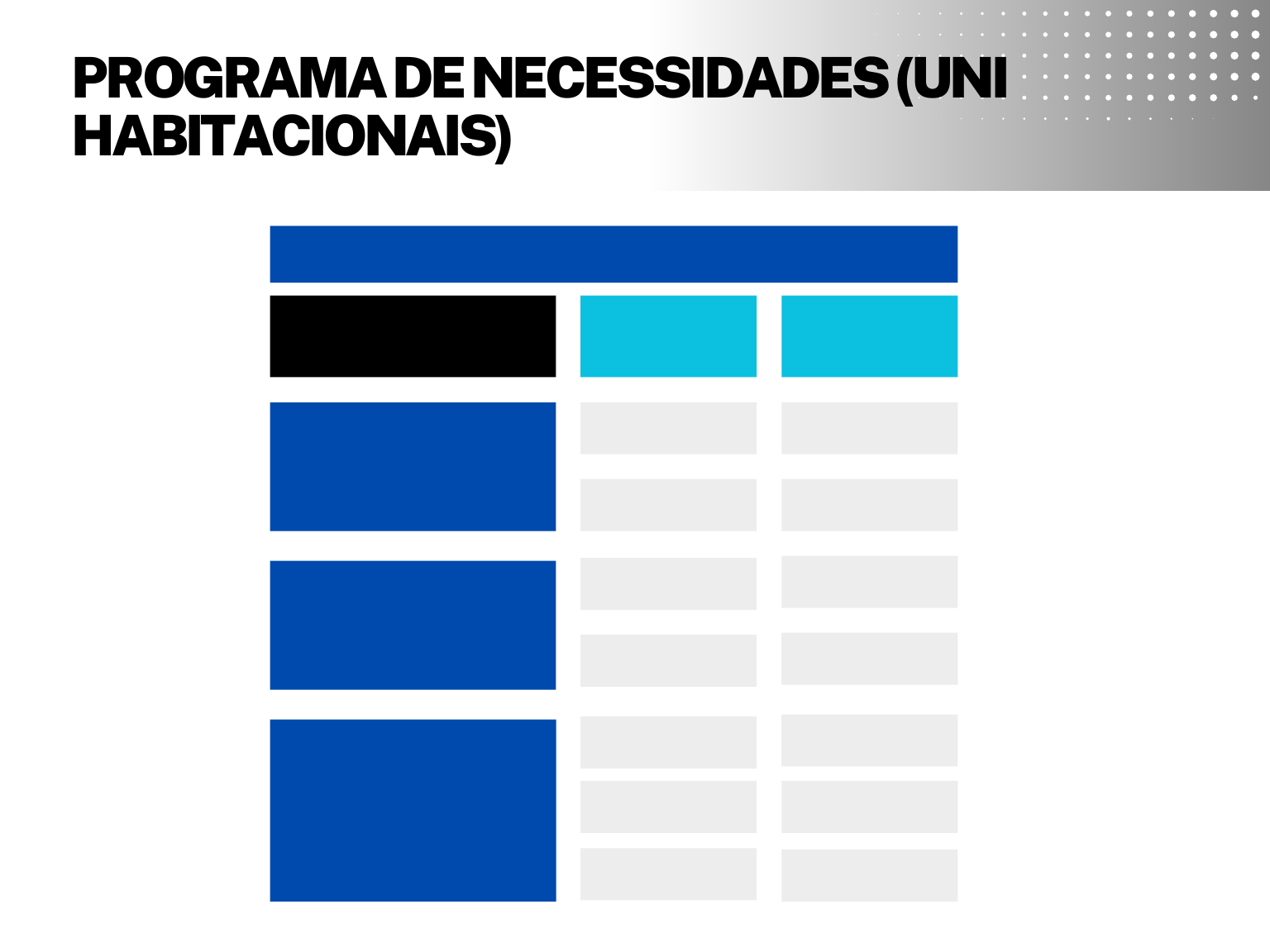 PROGRAMA DE NECESSIDADES (UNI HABITACIONAIS) SETORES SERVIÇO AMBIENTES ÁREA M² TIPOLOGIA FAMILIAR 1 COZINHA A.S 5,02M² 2,45M² SOCIAL VARANDA SALA DE ESTAR/JANTAR 1,21M² 22,80M² INTIMO QUARTO CASAL QUARTO SOLTEIRO BANHEIRO 9 M² 9 M² 2,22 M² PROGRAMA DE NECESSIDADES (UNI HABITACIONAIS) SETORES SERVIÇO AMBIENTES ÁREA M² TIPOLOGIA FAMILIAR 2 COZINHA A.S 5,98 M² 3,99 M² SOCIAL VARANDA SALA DE ESTAR/JANTAR 2,17 M² 8,12 M² INTIMO QUARTO CASAL QUARTO SOLTEIRO 1 BANHEIRO 10,03 M² 8,97 M² 2,34 M² QUARTO SOLTEIRO 2 6,87 M² PROGRAMA DE NECESSIDADES (UNI HABITACIONAIS) SETORES SERVIÇO AMBIENTES ÁREA M² TIPOLOGIA 1 DORM COZINHA 6,59 M² SOCIAL SALA DE ESTAR/JANTAR 6,57 M² INTIMO QUARTO CASAL 8,98 M² BANHEIRO 2,22 M² PROGRAMA DE NECESSIDADES (UNI HABITACIONAIS) SETORES SERVIÇO AMBIENTES ÁREA M² TIPOLOGIA PNE COZINHA 6,33 M² SOCIAL VARANDA SALA DE ESTAR/JANTAR 2,68 M² 10,09 M² INTIMO QUARTO CASAL QUARTO PNE BANHEIRO 9,15 M² 9,91 M² 6,30 M²