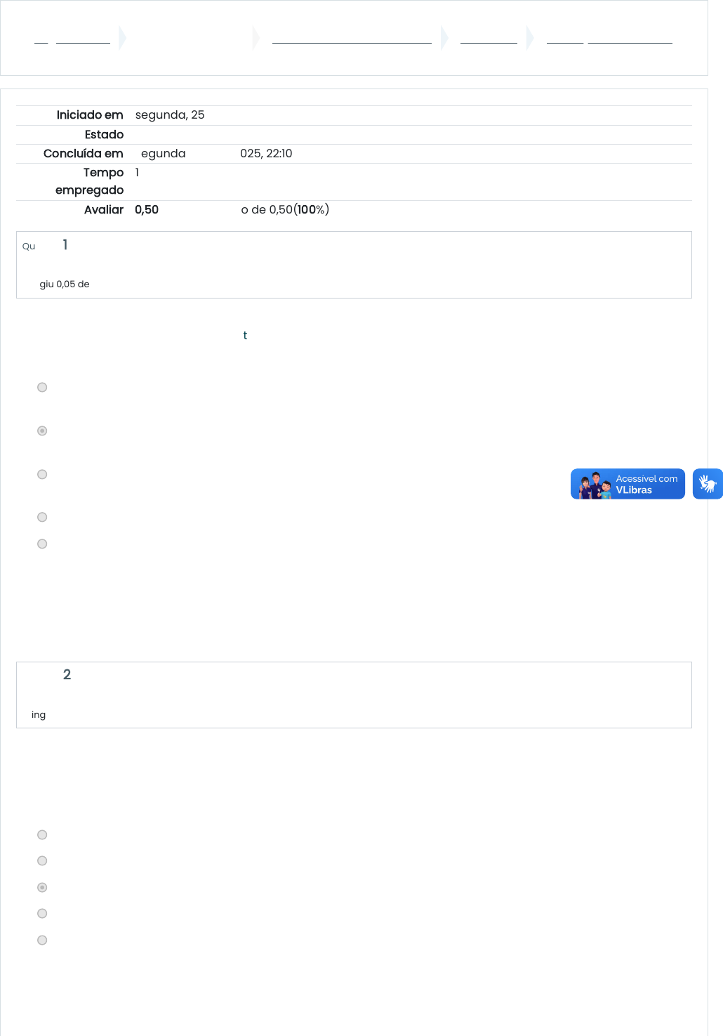 Página inicial Minhas disciplinas 2025/3 - Informática Básica UNIDADE II Avaliação - Unidade II Iniciado em segunda, 25 ago 2025, 20:44 Estado Finalizada Concluída em segunda, 25 ago 2025, 22:10 Tempo empregado 1 hora 26 minutos Avaliar 0,50 de um máximo de 0,50(100%) Questão 1 Correto Atingiu 0,05 de 0,05 Questão 2 Correto Atingiu 0,05 de 0,05 A memória RAM é um dos componentes mais importantes de um computador, porque é nela que o processador armazena os dados com os quais está trabalhando. Assinale a alternativa correta sobre a memória RAM: a. Oferece um processo de gravação de dados extremamente demorado e perde os dados quando não há mais energia elétrica. b. Oferece um processo de gravação de dados extremamente rápido e perde os dados quando não há mais energia elétrica. c. Apresenta-se em dois tipos básicos: memória dinâmica de acesso aleatório e memória estática de acesso aleatório. d. É uma memória não volátil, de baixo consumo, lenta e que esquenta pouco. e. É uma memória não volátil, lenta e que perde os dados quando não há mais energia elétrica. A resposta correta é: Oferece um processo de gravação de dados extremamente rápido e perde os dados quando não há mais energia elétrica. Elemento identificado em sua forma bruta que por si só não conduz a uma compreensão de um fato ou uma situação. Sinais brutos e sem significado individual que os computadores manipulam para produzir informações. São os: a. números. b. bits. c. dados. d. softwares. e. bytes. A resposta correta é: dados. 25/08/2025, 22:10 Avaliação - Unidade II: Revisão da tentativa https://ambienteonline.uninga.br/mod/quiz/review.php?attempt=3966657&cmid=997275 1/5 https://ambienteonline.uninga.br/ https://ambienteonline.uninga.br/course/view.php?id=35105 https://ambienteonline.uninga.br/course/view.php?id=35105§ion=3 https://ambienteonline.uninga.br/mod/quiz/view.php?id=997275 Questão 3 Correto Atingiu 0,05 de 0,05 Questão 4 Correto Atingiu 0,05 de 0,05 Questão 5 Correto Atingiu 0,05 de 0,05 São Hardwares de um computador: a. Dispositivos de entrada /saída, dispositivos de armazenamento e memória. b. Processador, sistema operacional, dispositivos de entrada /saída e armazenamento. c. Processador, memória, dispositivos de entrada /saída e o site do fabricante. d. Sistema operacional, processador, memória e dispositivos de entrada /saída. e. Processador, memória, dispositivos de entrada /saída e aplicativos. A resposta correta é: Dispositivos de entrada /saída, dispositivos de armazenamento e memória. São exemplos de peoplewares: a. Manuais de uso de sistema, sistemas operacionais, digitadores e programadores. b. Digitadores, Operadores, analistas de sistemas e programadores. c. Programas (todos os tipos) e o analista de sistemas. d. Planilhas eletrônicas, programador e o analista de sistemas. e. Digitadores, manuais de sistema, analistas de sistemas e programadores. A resposta correta é: Digitadores, Operadores, analistas de sistemas e programadores. O software é o ingrediente que estabelece qual tarefa que o computador vai executar. É um conjunto de instruções eletrônicas que executados informam aos componentes físicos da máquina o que devem fazer. Os softwares podem ser divididos em duas principais categorias: a. Software básico e software aplicativo. b. Software aplicativo e Editores de Texto. c. Software pirata e software básico. d. Software Básico e Softwares Complicados. e. Software Simples e Software Complexo. A resposta correta é: Software básico e software aplicativo. 25/08/2025, 22:10 Avaliação - Unidade II: Revisão da tentativa https://ambienteonline.uninga.br/mod/quiz/review.php?attempt=3966657&cmid=997275 2/5 Questão 6 Correto Atingiu 0,05 de 0,05 Questão 7 Correto Atingiu 0,05 de 0,05 Questão 8 Correto Atingiu 0,05 de 0,05 Os computadores atuais usam dispositivos de armazenamento de dados baseados em diversas tecnologias. Os CDs e de DVDs são exemplos de dispositivos de armazenamento por meio: a. magnético. b. mecânico. c. térmico. d. óptico. e. chip. A resposta correta é: óptico. Os Softwares classificados como básicos são também conhecido como software de sistemas, que é o conjunto de programas que coordena as atividades e as funções do hardware e outros programas do sistema computacional. É software básico: a. Planilha Eletrônica. b. Editor gráfico. c. Antivírus. d. Editor de texto. e. Sistema operacional. A resposta correta é: Sistema operacional. Os softwares são: a. Os periféricos que tem função de dar entrada dos dados vindos do usuário ou de outra fonte. b. As unidades mais comuns para medir a capacidade de um computador. c. Os locais onde são guardados os dados com os quais o computador está trabalhando em um dado momento. d. Instruções eletrônicas que informam ao computador como realizar certa tarefa. e. Os componentes físicos de um computador. A resposta correta é: Instruções eletrônicas que informam ao computador como realizar certa tarefa. 25/08/2025, 22:10 Avaliação - Unidade II: Revisão da tentativa https://ambienteonline.uninga.br/mod/quiz/review.php?attempt=3966657&cmid=997275 3/5 Questão 9 Correto Atingiu 0,05 de 0,05 Questão 10 Correto Atingiu 0,05 de 0,05 São dispositivos de entrada de dados: a. mouse, teclado, impressora, webcam e joystick. b. mouse, microfone, teclado, scanner, e joystick. c. mouse, leitora de código de barras, teclado, impressora e scanner. d. mouse, impressora, teclado, pendrive e microfone. e. mouse, webcam, caixas de som, scanner e impressora. A resposta correta é: mouse, microfone, teclado, scanner, e joystick. Todo computador possui um sistema para converter dados em informações, ele possui um sistema de coleta de dados, esses dados são manipulados e em seguida seus resultados apresentados. De modo geral, se realiza na seguinte ordem: a. A entrada (input) – O armazenamento - A saída (output). b. A entrada (input) 