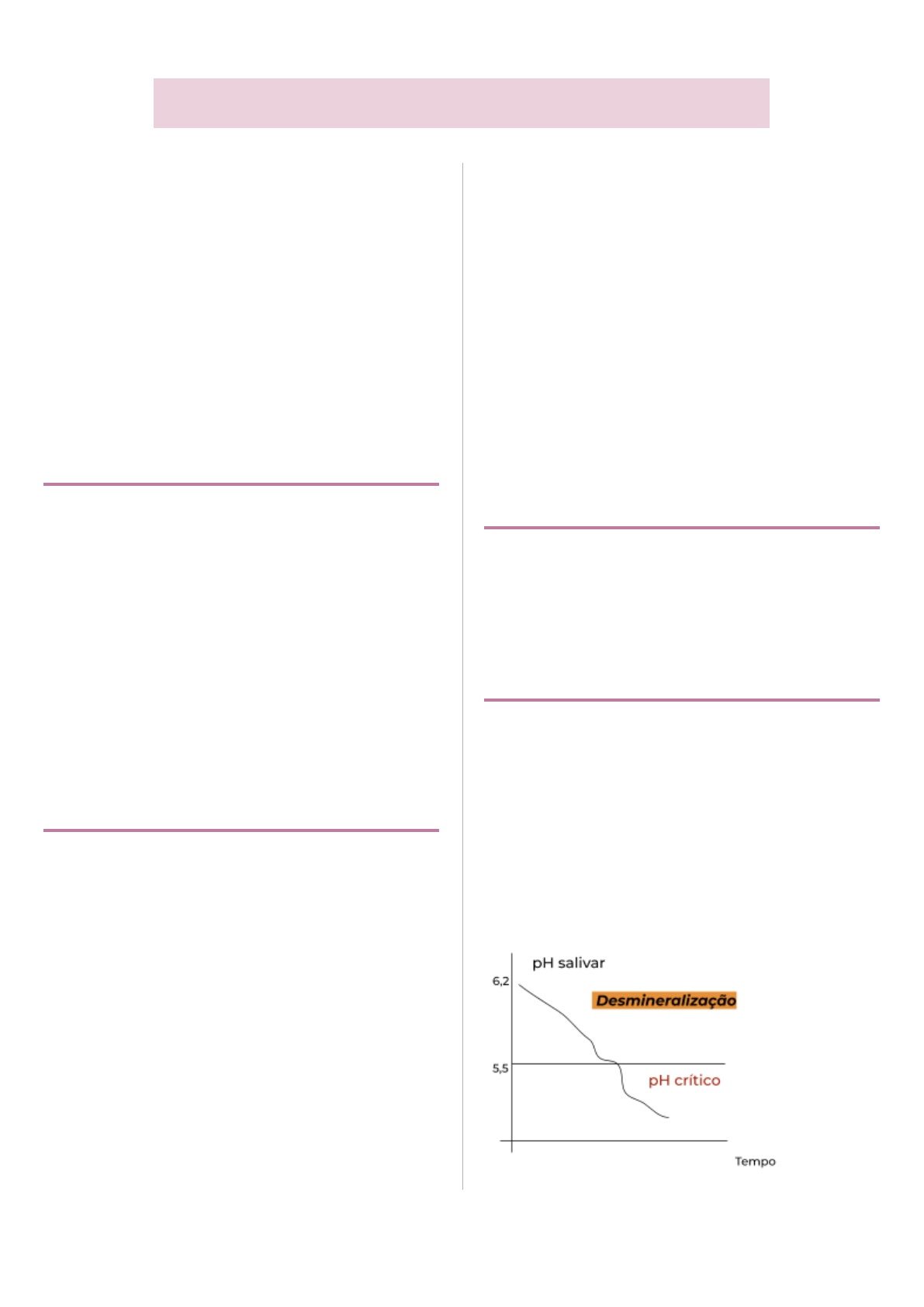 Doença cárie: evolução e tratamento A cárie dentária é uma doença dinâmica, biofilme-dependente, modulada pela dieta, de caráter não transmissível, resultante da perda mineral dos tecidos duros dentais. A lesão cariosa, por sua vez, é o sinal clínico da cárie. Pode ser caracterizados de acordo com: ● Localização: superfície da coroa ou raiz; ● Gravidade: cavitada ou não-cavitada; ● Profundidade: esmalte, dentina, polpa ● Status de atividade: ativo ou inativo. Parâmetros envolvidos no processo da doença: ● Fatores etiológicos primários: Microrganismos: Streptococcus mutans e Lactobacillus spp. Hospedeiro: dente (anatomia + posição), saliva (fluxo, cap. tampão). Dieta: carboidratos, sacarose + frequência. ● Fatores etiológicos modeladores: Tempo, saúde geral, idade, grau de instrução, nível socioeconômico e comportamental. RISCO A CÁRIE: O dente recém-rompido pode estar em infra-oclusão e apresentar uma superfície oclusal bastante irregular, tornando-se mais suscetível à retenção de placa bacteriana. ● Fator social e comportamental ○ Tipo de atividade e nível de estresse → diminuição do fluxo salivar ● Uso do flúor: ○ Acesso à água fluoretada e enxaguantes; ○ Dentifrício fluoretado. ● Características clínicas: ○ Presença de placa bacteriana; ○ Condições da mucosa; ○ Experiências anteriores de cárie. ● Dieta: consumo de açúcar, tipo de alimento, consistência, frequência de ingestão. ● Características da saliva: ○ Constituída em sua maioria por água, componentes inorgânicos (Ca+, fosfato (PO₄³⁻), F-) e orgânicos; ○ Presença de anticorpos Ig que age sobre bactérias. EVOLUÇÃO: ● Estrutura do esmalte: orgânica (2%), água (3%), mineral (95%). ● Estrutura da dentina: orgânica (20%), mineral (75%), água (5%). CARIOLOGIA: ● Processo DES-RE: → Desmineralização: É a remoção de minerais como Ca, Mg e PO₄³⁻ dos dentes. Os ácidos produzidos por bactérias removem os minerais do esmalte, enfraquecendo os dentes e levando à cárie. A primeira manifestação clínica da cárie é uma área esbranquiçada não cavitada, conhecida como mancha branca. Resumo por Jhennifer Gonçalves Viana | Graduanda de Odontologia pela Universidade Estadual do Sudoeste da Bahia (UESB) 2025 | Jequié — Ba → Remineralização: processo de repor minerais perdidos nos dentes, fortalecendo o esmalte e prevenindo cáries. Estágios progressivos de perda mineral: PROGRESSÃO DA CÁRIE: Superfícies lisas: ocorre no sentido da dentina, formando um triângulo com a base voltada para a superfície do esmalte e o ápice direcionado para a dentina. ● Progressão lenta → superfície é mais acessível à escovação e ao flúor. Cicatrículas e fissuras: o ápice está na superfície do esmalte, e a base se expande na dentina. ● Áreas de difícil acesso para a escovação → acumulando placa. ● Progressão rápida → bactérias penetram nas fissuras antes mesmo de sinais visíveis na superfície. ● Avanço silencioso para a dentina antes da detecção clínica da lesão. PROGRESSÃO DA CÁRIE EM DENTINA: 1. Zona da cavidade ● Coloração contrasta com as estruturas normais; ● Bordas irregulares; ● Intensa atividade bacteriana; ● Material. 2. Dentina cariada superficial ● Desmineralizada e sem estrutura de colágeno; ● Presença de bactérias; ● Comprometimento irreversível da dentina. 3. Dentina cariada profunda ● Rara presença de microrganismos; ● Tecido desorganizado pela ação de ácidos; ● Apresenta sensibilidade; ● Passível de recuperação. 4. Dentina esclerosada ● Aumento da deposição mineral em dentina pré-existente; ● Agressão ou envelhecimento da estrutura dentária; ● Menor permeabilidade de íons e bactérias. 5. Dentina terciária Resumo por Jhennifer Gonçalves Viana | Graduanda de Odontologia pela Universidade Estadual do Sudoeste da Bahia (UESB) 2025 | Jequié — Ba ● Nova dentina que se forma no teto da câmara pulpar na região correspondente nos odontoblastos agredidos por estímulos externos. ● Reacional ou reparadora Reacional: ★ Sem danos irreversíveis aos odontoblastos pré-existentes; ★ Preparos cavitários raros ou lesões cariosas incipientes. Reparadora: ★ Ocorrem injúrias irreversíveis aos odontoblastos; ★ Proliferação, migração e diferenciação de células odontoblástoides; ★ Exposições pulpares, lesões profundas de preparos cavitários sem refrigeração. DIAGNÓSTICO: ● Lesão cariosa x Hipocalcificação ○ Anamnese, aspecto clínico, localização. ● Ativa ou Inativa ○ Ativa: brancas, opacas, rugosas. ○ Inativa: Coloração branca ou escurecida, lisa, brilhante, sem halo de mancha branca. ● Afetada ou esclerosada: ○ Afetada: Sai em lascas, coloração escurecida e fosca. ○ Esclerosada: Rígida, coloração escurecida, mas brilhante. MÉTODOS DE DIAGNÓSTICO: ● Exame visual: Dentes limpos e secos, iluminação adequada. Instrumental: espelho. Face livre: aspecto opaco, superfície rugosa, cor branca (podendo ser pigmentada). Com a progressão se torna branco-amarelada, amarelo parda ou enegrecida. Face proximal: dificuldade de observação direta, fazendo o uso de afastadores interproximais mediatos (mecânicos) ou imediatos (elásticos). Cicatrículas e fissuras: perda da translucidez normal, sendo mais difíceis de serem detectadas em estágio precoce. ● Exame tátil: Dentes limpos e secos, adequada iluminação. Instrumentais: Sonda OMS e espelho, e fio dentais em lesões proximais. Contraindicações: Pode causar danos irreversíveis, impossibilitando a remineralização. Seu uso deve-se limitar a superfícies radiculares, onde não há risco de fratura no esmalte desmineralizado. ● Exame radiográfico: exame complementar, sendo interproximal e bite-wing os mais indicados. ● Transiluminação por fibra óptica: feixe de lux capaz de penetrar mais profundamente na e