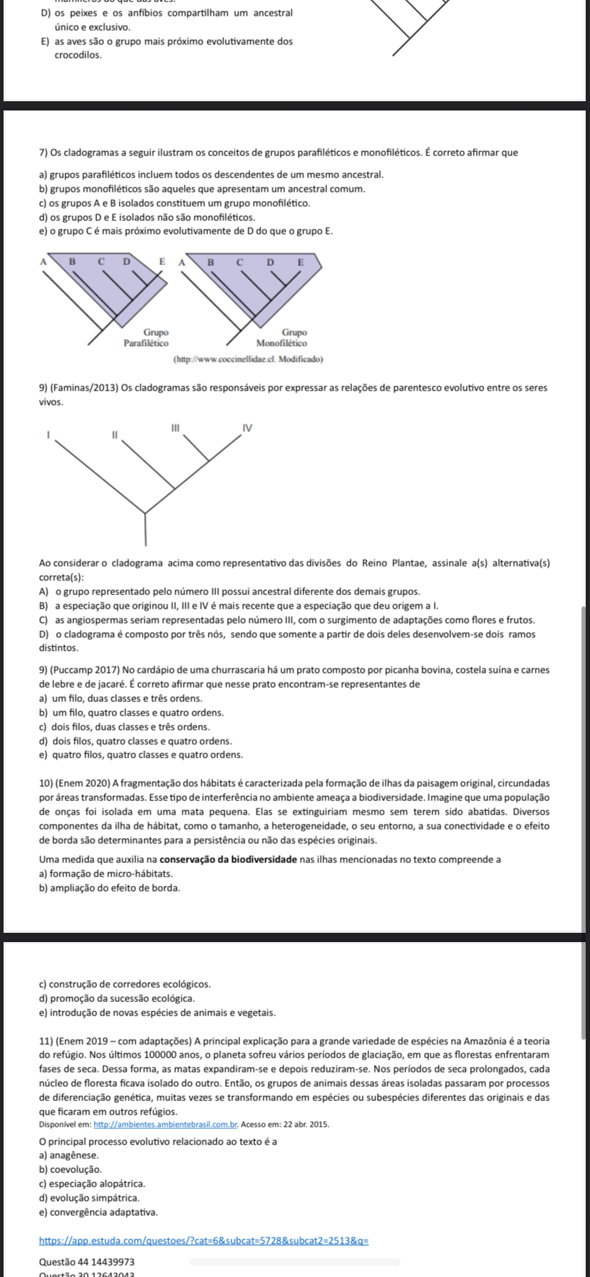 D) os peixes e os anfibios compartilham um ancestral e exclusivo. E) as aves são grupo mais evolutivamente dos crocodilos. 7) Os cladogramas a seguir ilustram conceitos de grupos parafiléticos e monofiléticos. É correto afirmar que a) grupos parafiléticos incluem todos descendentes de um mesmo ancestral. b) grupos monofiléticos são aqueles que apresentam um ancestral comum. c) os grupos A e B isolados constituem um grupo monofilético. d) os grupos D e E isolados não são monofiléticos. e) grupo C é mais próximo evolutivamente de D do que grupo E. A B D E A B D E Grupo Grupo Parafilético Monofilético (http://www.coccinellidae.c Modificado) 9) (Faminas/2013) Os cladogramas são responsáveis por expressar as relações de parentesco evolutivo entre os seres vivos. III IV II Ao considerar cladograma acima como representativo das divisões do Reino Plantae, assinale a(s) alternativa(s) correta(s): A) grupo representado pelo III possui ancestral diferente dos demais grupos. B) a especiação que originou II, III e IV é mais recente que a especiação que deu origem a I. C) as angiospermas seriam representadas pelo número III, com surgimento de adaptações como flores e frutos. D) cladograma é composto por três nós, sendo que somente a partir de dois deles desenvolvem-se dois ramos distintos. 9) (Puccamp 2017) No cardápio de uma churrascaria um prato composto por picanha bovina, costela suina e carnes de lebre e de jacaré. É correto afirmar que nesse prato encontram-se representantes de a) um filo, duas classes e três ordens. b) um filo, quatro classes e quatro ordens. c) dois filos, duas classes e três ordens. d) dois filos, quatro classes e quatro ordens. e) quatro filos, quatro classes e quatro ordens. 10) (Enem 2020) A fragmentação dos habitats é caracterizada pela formação de ilhas da paisagem original, circundadas por areas transformadas. Esse tipo de interferência no ambiente ameaça a biodiversidade. Imagine que uma população de onças foi isolada em uma mata pequena. Elas se extinguiriam mesmo sem terem sido abatidas. Diversos componentes da ilha de como tamanho, a heterogeneidade, seu entorno, a sua conectividade e efeito de borda são determinantes para a persistência ou não das espécies originais. Uma medida que auxilia na conservação da biodiversidade nas ilhas mencionadas no texto compreende a a) formação de micro-hábitats. b) ampliação do efeito de borda. c) construção de corredores ecológicos. d) promoção da sucessão ecológica. e) introdução de novas espécies de animais e vegetais. 11) (Enem 2019 com adaptações) A principal explicação para a grande variedade de espécies na é a teoria do refúgio. Nos últimos 100000 anos, planeta sofreu vários de glaciação, em que as florestas enfrentaram fases de seca. Dessa forma, as matas expandiram-se e depois reduziram-se. Nos de seca prolongados, cada núcleo de floresta ficava isolado do outro. Então, os grupos de animais dessas áreas isoladas passaram por processos de diferenciação genética, muitas vezes se transformando em espécies ou subespécies diferentes das originais e das que ficaram em outros refúgios. em: Acesso em: 22 abr. 2015. principal processo evolutivo relacionado ao texto é a a) anagênese. b) coevolução. c) especiação alopátrica. d) evolução e) convergência adaptativa. Questão 44 14439973