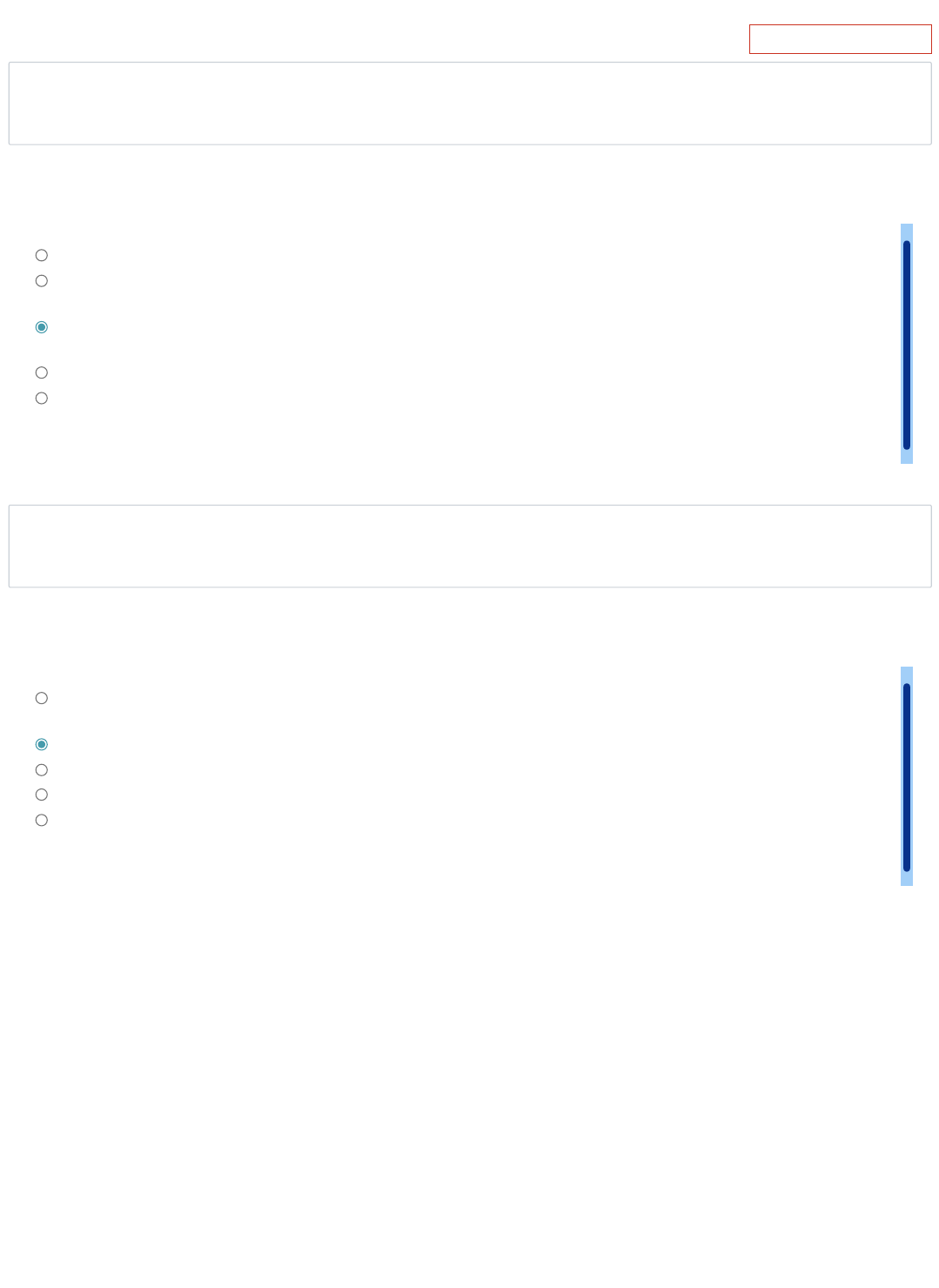 Questão 1 Ainda não respondida Vale 1,00 ponto(s). Questão 2 Ainda não respondida Vale 1,00 ponto(s). Na estatística, como ocorre a forma direta de coleta de dados? Escolha uma opção: a. NDA b. Quando o dado é obtido de uma fonte primária, ou seja, quando outros produzem as informações através de dados comuns c. Quando o dado é obtido de uma fonte primária, ou seja, quando eu colho a informação diretamente na fonte e produzo as informações a partir disto d. Quando o dado é obtido de uma fonte primária, ou seja, quando eu colho a informação indiretamente na fonte e. Quando o dado é obtido de uma fonte secundária, ou seja, quando eu colho a informação diretamente na fonte e produzo as informações a partir disto Limpar minha escolha A definição de variável contínua é: Escolha uma opção: a. É quando existe o desejo de dispor os elementos observados segundo uma ordem de preferência ou desempenho, atribui-se valores relativos atribuídos para indicar esta ordem b. É a variável que pode assumir qualquer valor num intervalo contínuo c. NDA d. Originam-se da contagem de itens e só podem assumir valores inteiros e. É aquela que existem com o objetivo de definir categorias, e as observações, mensurações e análises são feitas levando-se em conta estas mesmas categorias Limpar minha escolha Tempo restante 0:52:08 26/08/2025, 12:40 Avaliação Online https://ava.aquivocepode.com.br/avaunip/mod/quiz/attempt.php?attempt=3735845&cmid=56460#question-3736267-6 1/5 Questão 3 Ainda não respondida Vale 1,00 ponto(s). Questão 4 Ainda não respondida Vale 1,00 ponto(s). Questão 5 Ainda não respondida Vale 1,00 ponto(s). Marque a alternativa que se refere ao conceito de amostra. Escolha uma opção: a. É o conjunto de possíveis elementos a serem observados e de onde obteríamos os dados b. NDA c. Uma parte representativa da população que será examinada quando for impossível ou impraticável observar todo o grupo representado pela população d. É o conjunto de cinco elementos a serem observados e de onde obteríamos os dados duplicados e. É o conjunto de possíveis elementos a serem observados e de onde obteríamos os dados Limpar minha escolha Marque a alternativa incorreta: Escolha uma opção: a. NDA b. A amostra representa uma parte da população que será examinada quando for impossível ou impraticável observar todo o grupo representado pela população c. A população seria um subconjunto do universo, na medida em que se constitui de um grupo de objetos ou indivíduos com características comuns d. A população representa uma parte da amostra que será examinada quando for impossível ou impraticável observar todo o grupo representado pela população e. O universo seria o conjunto de possíveis elementos a serem observados e de onde obteríamos os dados Limpar minha escolha A definição de variável discreta é: Escolha uma opção: a. Originam-se da contagem de itens e só podem assumir valores inteiros b. NDA c. É aquela que existem com o objetivo de definir categorias, e as observações, mensurações e análises são feitas levando-se em conta estas mesmas categorias d. É a variável que pode assumir qualquer valor num intervalo contínuo e. É quando existe o desejo de dispor os elementos observados segundo uma ordem de preferência ou desempenho, atribui-se valores relativos atribuídos para indicar esta ordem Limpar minha escolha 26/08/2025, 12:40 Avaliação Online https://ava.aquivocepode.com.br/avaunip/mod/quiz/attempt.php?attempt=3735845&cmid=56460#question-3736267-6 2/5 Questão 6 Ainda não respondida Vale 1,00 ponto(s). Questão 7 Ainda não respondida Vale 1,00 ponto(s). Questão 8 Ainda não respondida Vale 1,00 ponto(s). Sobre os dados estatísticos, podemos afirmar: Escolha uma opção: a. NDA b. Dado bruto é o dado que pode assumir qualquer valor num intervalo contínuo c. Variável nominal em geral se origina da contagem de itens e só podem assumir valores inteiros d. Variáveis por posto são aquelas que existem com o objetivo de definir categorias, e as observações, mensurações e análises são feitas levando-se em conta estas mesmas categorias e. Variáveis contínuas: quando existe o desejo de dispor os elementos observados segundo uma ordem de preferência ou desempenho, atribuem-se valores relativos para indicar esta ordem Limpar minha escolha A definição de variável por posto é: Escolha uma opção: a. É a variável que pode assumir qualquer valor num intervalo contínuo b. É quando existe o desejo de dispor os elementos observados segundo uma ordem de preferência ou desempenho, atribui-se valores relativos atribuídos para indicar esta ordem NDA c. É aquela que existem com o objetivo de definir categorias, e as observações, mensurações e análises são feitas levando-se em conta estas mesmas categorias d. Originam-se da contagem de itens e só podem assumir valores inteiros Limpar minha escolha Na estatística, como ocorre a coleta de dados? Escolha uma opção: a. Forma racional ou irracional b. NDA c. Forma direta ou indireta d. Forma direta ou primária e. Forma simples ou composta Limpar minha escolha 26/08/2025, 12:40 Avaliação Online https://ava.aquivocepode.com.br/avaunip/mod/quiz/attempt.php?attempt=3735845&cmid=56460#question-3736267-6 3/5 Questão 9 Ainda não respondida Vale 1,00 ponto(s). Questão 10 Ainda não respondida Vale 1,00 ponto(s). Qual a estatística a ser adotada se deseja atribuir pesos distintos ou importâncias distintas aos elementos de um conjunto de dados. Escolha uma opção: a. Média aritmética ponderada b. Mediana c. Média aritmética simples d. Nenhumas das alternativas e. Moda Limpar minha escolha Para alguns autores, qual a medida mais representativa em um conjunto de dados? Escolha uma opção: a. Modal b. Mediana c. Moda d. Média aritmética e. Nenhumas das alternativas Limpar minha escolha Sobre nós Nossa visão de futuro e nossos objetivos são