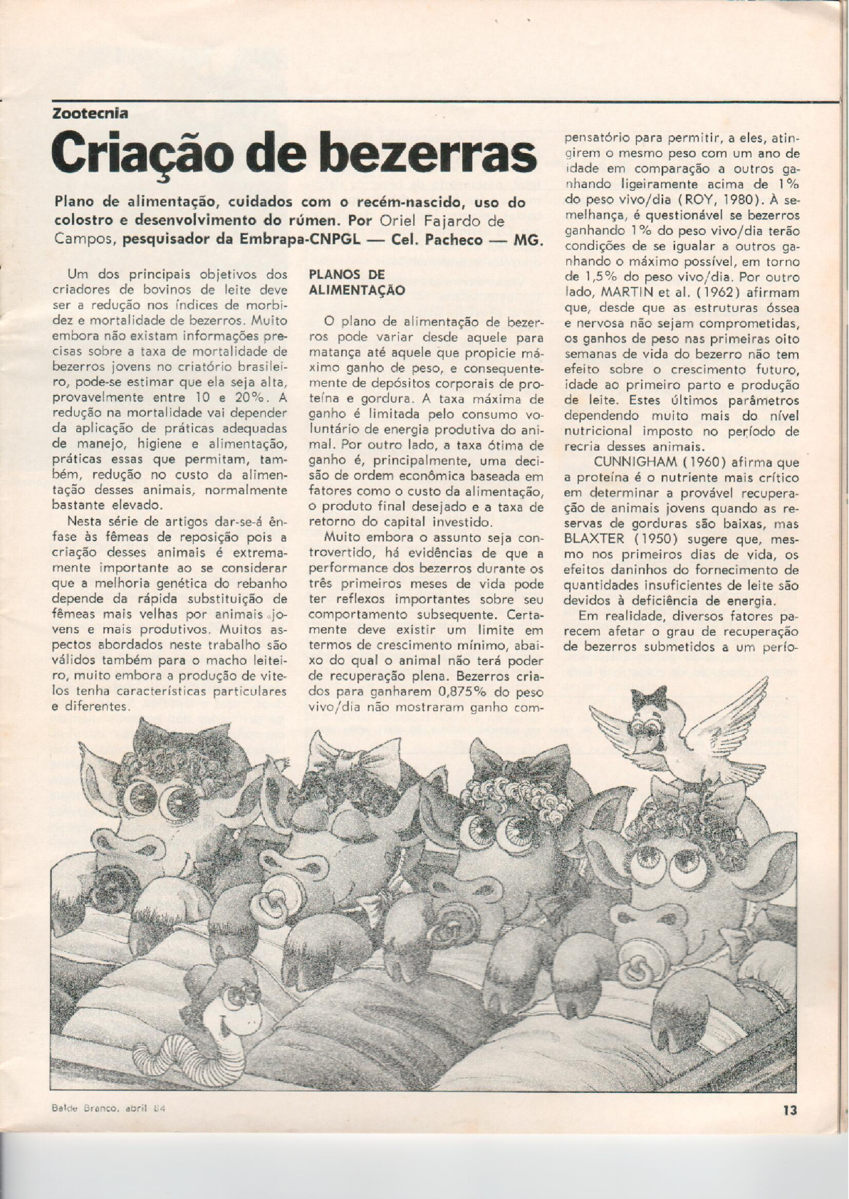 ea Zootecnia Criação de bezerras Plano de alimentação, cuidados com o recém-nascido, uso do colostro e desenvolvimento do rúmen. Por Oriel Fajardo de Campos, pesquisador da Embrapa-CNPGL — Cel. Pacheco — MG. Um dos principais objetivos dos criadores de bovinos de leite deve ser a redução nos índices de morbi- dez e mortalidade de bezerros. Muito embora não existam informações pre- cisas sobre a taxa de mortalidade de bezerros jovens no criatório brasilei- ro, pode-se estimar que ela seja alta, provavelmente entre 10 e 20%. A redução na mortalidade vai depender da aplicação de práticas adequadas de manejo, higiene e alimentação, práticas essas que permitam, tam- bém, redução no custo da alimen- tação desses animais, normalmente bastante elevado. Nesta série de artigos dar-se-á ên- fase às fêmeas de reposição pois a criação desses animais é extrema- mente importante ao se considerar que a melhoria genética do rebanho depende da rápida substituição de fêmeas mais velhas por animais .jo- vens e mais produtivos. Muitos as- pectos abordados neste trabalho são válidos também para o macho leitei- ro, muito embora a produção de vite- los tenha características particulares e diferentes. Balde Branco, abril Us PLANOS DE ALIMENTAÇÃO O plano de alimentação de bezer- ros pode variar desde aquele para matança até aquele que propicie má- ximo ganho de peso, e conseguente- mente de depósitos corporais de pro- teina e gordura. A taxa máxima de ganho é limitada pelo consumo vo- luntário de energia produtiva do ani- mal. Por outro lado, a taxa ótima de ganho é, principalmente, uma deci- são de ordem econômica baseada em fatores como o custo da alimentação, o produto final desejado e a taxa de retorno do capital investido. Muito embora o assunto seja con- trovertido, há evidências de que a performance dos bezerros durante os três primeiros meses de vida pode ter reflexos importantes sobre seu comportamento subsequente. Certa- mente deve existir um limite em termos de crescimento mínimo, abai- xo do qual o animal não terá poder de recuperação plena. Bezerros cria- dos para ganharem 0,875% do peso vivo/dia não mostraram ganho com- pensatório para permitir, a eles, atin- girem o mesmo peso com um ano de idade em comparação a outros ga- nhando ligeiramente acima de 1% do peso vivo/dia (ROY, 1980). À se- melhança, é questionável se bezerros ganhando 1% do peso vivo/dia terão condições de se igualar a outros ga- nhando o máximo possível, em torno de 1,5% do peso vivo/dia. Por outro lado, MARTIN et al. (1962) afirmam que, desde que as estruturas óssea e nervosa não sejam comprometidas, os ganhos de peso nas primeiras oito semanas de vida do bezerro não tem efeito sobre o crescimento futuro, idade ao primeiro parto e produção de leite. Estes últimos parâmetros dependendo muito mais do nível nutricional imposto no período de recria desses animais. CUNNIGHAM (1960) afirma que a proteina é o nutriente mais crítico em determinar a provável recupera- ção de animais jovens quando as re- servas de gorduras são baixas, mas BLAXTER (1950) sugere que, mes- mo nos primeiros dias de vida, os efeitos daninhos do fornecimento de quantidades insuficientes de leite são devidos à deficiência de energia. Em realidade, diversos fatores pa- recem afetar o grau de recuperação de bezerros submetidos a um perío- do de restrição alimentar, entre eles o nível da restrição, a duração do período de restrição, a natureza da restrição e o estágio de desenvolvi- mento do animal durante esta fase. De qualquer modo, deve-se conside- rar como indesejável qualquer res- trição nutricional à bezerra jovem. OS CUIDADOS COM OS BEZERROS COMEÇAM COM A VACA GESTANTE A influência da alimentação pré- -natal é crítica tanto para o cresci- mento normal do feto como para a sobrevivência do bezerro durante as primeiras semanas de vida. Muito embora a subnutrição geral (consu- mo insuficiente de vários nutrientes) seja a causa mais comum das baixas performances reprodutivas, a defi- ciência de energia tem sido reconhe- cida como a mais importante. Seus efeitos em vacas e bezerros são mos- trados no quadro 1 (CORAH et al., 19725). Deficiências pré-natais de energia, caroteno, vitaminas À e D, iodo, fós- foro, manganês, cobalto e selênio po- dem afetar o crescimento e saúde dos bezerros (N.R.C., 1968). Os sintomas dessas deficiências são, principalmen- te, ocorrência de partos distócicos, menor produção de colostro e leite, redução na concentração desses nu- trientes no colostro e no leite, au- mento na mortalidade embrionária e fetal, nascimento de bezerros defor- mados e/ou leves e debilitados, com baixas reservas hepáticas de glicogê- nio. Os assim nascidos são mais sus- ceptíveis às doenças, principalmente diarréias e pneumonias. Vacas devem ser conduzidas a pas- tos-maternidade 60 dias antes do parto previsto. Este pasto deverá ser pequeno, seco, limpo e localizado próximo ao estábulo para permi- tir alimentação diferenciada, observa- ções frequentes e assistência caso ocorra algum problema por ocasião do parto. Não se deve esquecer que o maior crescimento do feto ocorre nos três últimos meses de gestação. Por este motivo a vaca necessita de um período seco de seis a oito se- manas. A recomendação dos técnicos do Centro Nacional de Pesquisa de Gado de Leite (CNPGL) tem sido: a) du- rante os primeiros seis meses de ges- tação, vacas gordas podem perder peso, vacas em bom estado corporal devem manter peso e vacas magras devem ganhar peso; e, b) durante o último terço da gestação, todas as vacas devem ganhar em torno de 600 g/cdia, usando-se alimentação suple- mentar ao pasto, se necessário. QUADRO 1 performances e de seus bezerros. Efeito do nível de energia da dieta de vacas em gestação (últimos 30 dias) sobre seus Nível Alto Nível Baixo Consumo E.D.! (Mcal/cab/dia) 