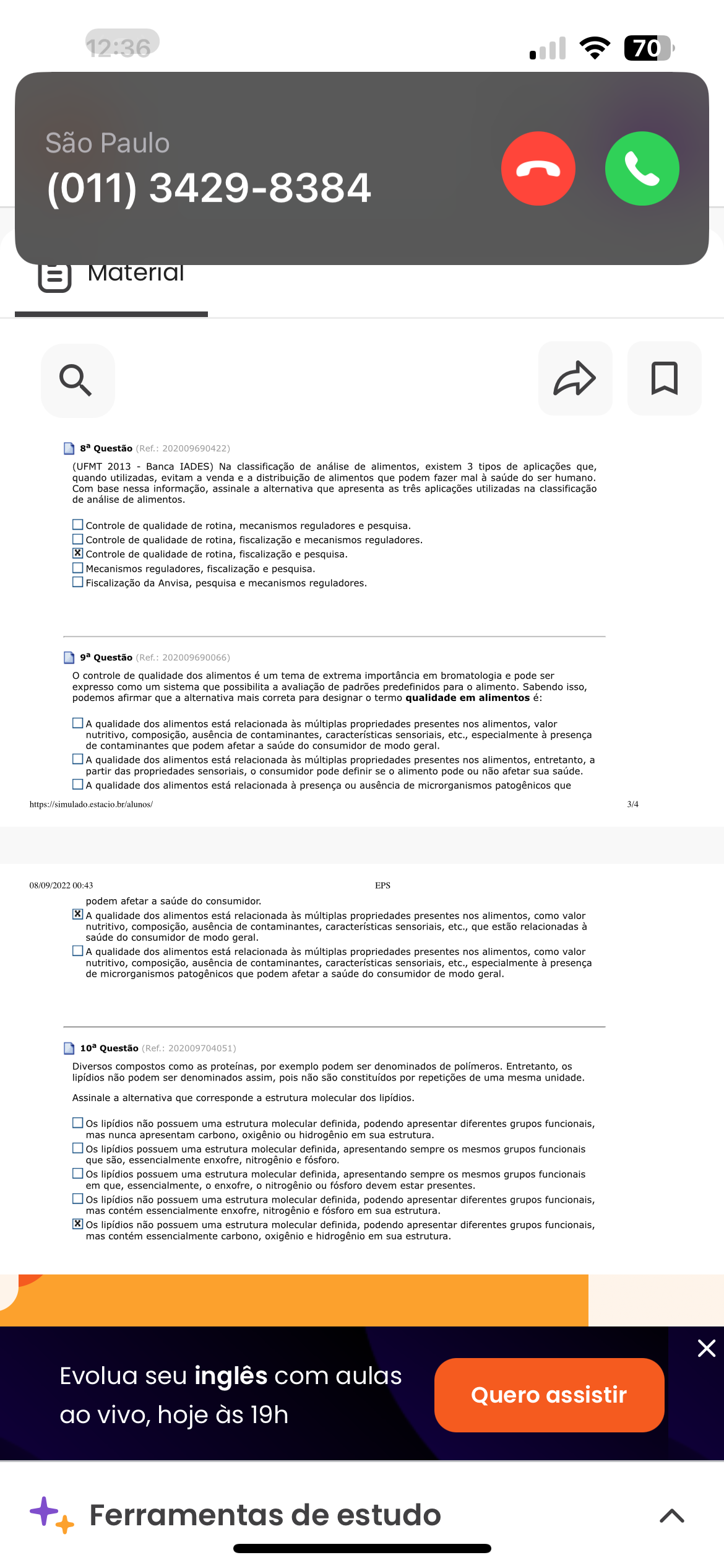12:36 70 São Paulo (011) 3429-8384 Material Questão (Ref.: 202009690422) (UFMT 2013 Banca IADES) Na classificação de análise de alimentos, existem 3 tipos de aplicações que, quando utilizadas, evitam a venda e a distribuição de alimentos que podem fazer mal à saúde do ser humano. Com base nessa informação, assinale a alternativa que apresenta as três aplicações utilizadas na classificação de análise de alimentos. Controle de qualidade de rotina, mecanismos reguladores e pesquisa. Controle de qualidade de rotina, fiscalização e mecanismos reguladores. Controle de qualidade de rotina, fiscalização e pesquisa. Mecanismos reguladores, fiscalização e pesquisa. Fiscalização da Anvisa, pesquisa e mecanismos reguladores. Questão (Ref.: 202009690066) controle de qualidade dos alimentos é um tema de extrema importância em bromatologia e pode ser expresso como um sistema que possibilita a avaliação de padrões predefinidos para alimento. Sabendo isso, podemos afirmar que a alternativa mais correta para designar termo qualidade em alimentos é: A qualidade dos alimentos está relacionada às múltiplas propriedades presentes nos alimentos, valor nutritivo, composição, ausência de contaminantes, características sensoriais, etc., especialmente à presença de contaminantes que podem afetar a saúde do consumidor de modo geral. A qualidade dos alimentos está relacionada às múltiplas propriedades presentes nos alimentos, entretanto, a partir das propriedades sensoriais, consumidor pode definir se alimento pode ou não afetar sua saúde. A qualidade dos alimentos está relacionada à presença ou ausência de microrganismos patogênicos que https://simulado estacio br/alunos/ 3/4 08/09/2022 00:43 EPS podem afetar a saúde do consumidor. A qualidade dos alimentos está relacionada às múltiplas propriedades presentes nos alimentos, como valor nutritivo, composição, ausência de contaminantes, características sensoriais, etc., que estão relacionadas à saúde do consumidor de modo geral. A qualidade dos alimentos está relacionada às múltiplas propriedades presentes nos alimentos, como valor nutritivo, composição, ausência de contaminantes, características sensoriais, etc., especialmente à presença de microrganismos patogênicos que podem afetar a saúde do consumidor de modo geral. Questão (Ref.: 202009704051) Diversos compostos como as proteínas, por exemplo podem ser denominados de polímeros. Entretanto, os lipídios não podem ser denominados assim, pois não são constituídos por repetições de uma mesma unidade. Assinale a alternativa que corresponde a estrutura molecular dos lipídios. Os lipídios não possuem uma estrutura molecular definida, podendo apresentar diferentes grupos funcionais, mas nunca apresentam carbono, oxigênio ou hidrogênio em sua estrutura. Os lipídios possuem uma estrutura molecular definida, apresentando sempre mesmos grupos funcionais que são, essencialmente enxofre, nitrogênio e fósforo. Os lipídios possuem uma estrutura molecular definida, apresentando sempre os mesmos grupos funcionais em que, essencialmente, O enxofre, nitrogênio ou fósforo devem estar presentes. Os lipídios não possuem uma estrutura molecular definida, podendo apresentar diferentes grupos funcionais, mas contém essencialmente enxofre, nitrogênio e fósforo em sua estrutura. Os lipídios não possuem uma estrutura molecular definida, podendo apresentar diferentes grupos funcionais, mas contém essencialmente carbono, oxigênio e hidrogênio em sua estrutura. X Evolua seu inglês com aulas Quero assistir ao vivo, hoje às 19h Ferramentas de estudo