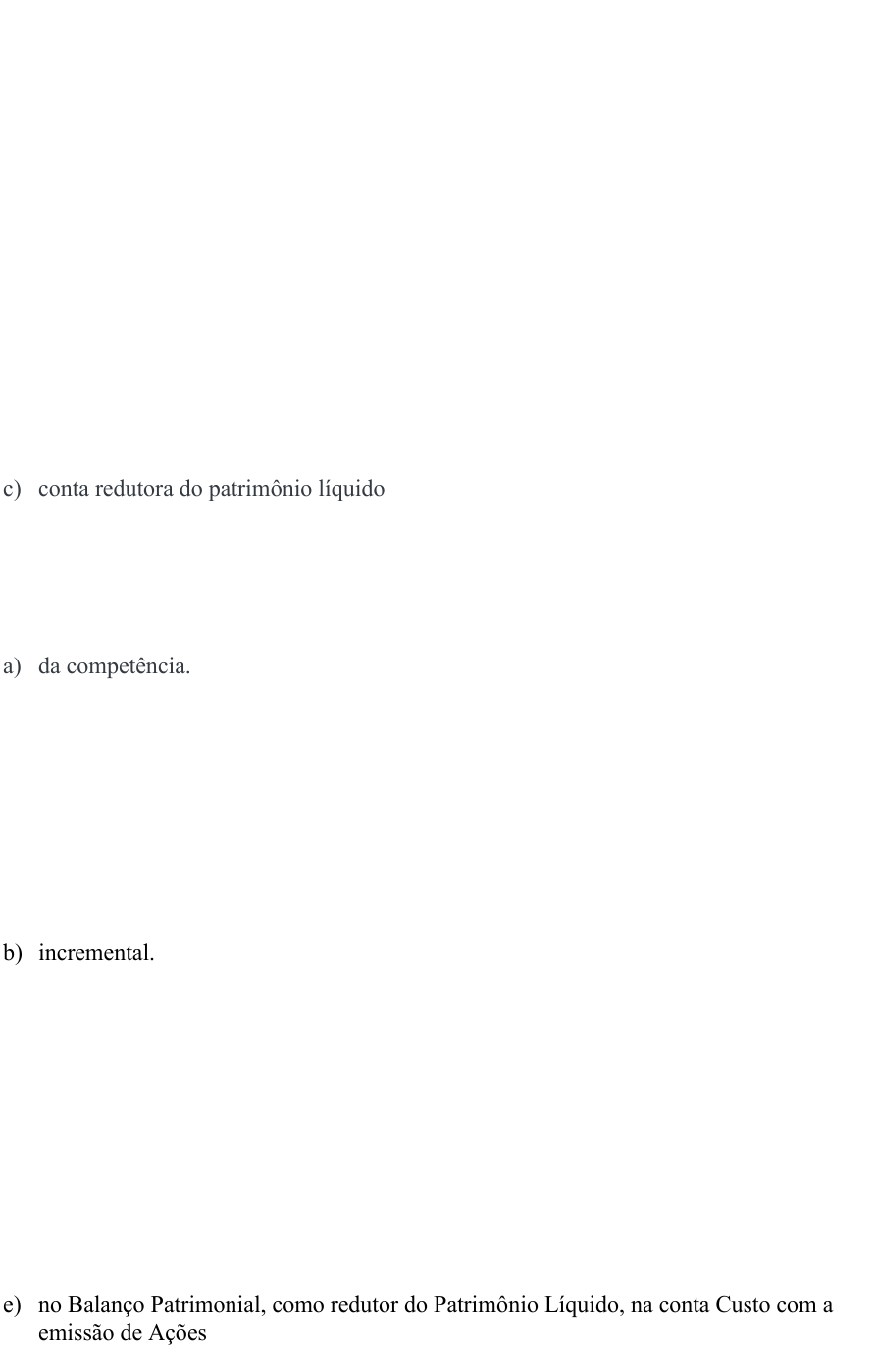 UNIVERSIDADE FEDERAL DE ALAGOAS FACULDADE DE ECONOMIA, ADMINISTRAÇÃO E CONTABILIDADE NOME:___________________________________________________________________ Professor: Tiago de Moura Soeiro | Disciplina: Avançada I | Data: ____/____/________ LISTA DE EXERCÍCIOS CPC 08 1. Considerando-se os estritos termos do Pronunciamento Técnico CPC 08 (R1), aprovado pela Deliberação CVM no 649, de 16/12/2010, os custos de transação incorridos na captação de recursos mediante a emissão de títulos patrimoniais devem ser considerados como: a) despesa do exercício social b) conta redutora do passivo a longo prazo c) conta redutora do patrimônio líquido d) conta de ativo / juros a apropriar e) redutora do valor da captação, no passivo 2. De acordo com o CPC 08 - Custos de Transação e Prêmios na Emissão de Títulos e Valores Mobiliários, os custos de transação na emissão de debêntures devem ser apropriados ao resultado em função da fluência do prazo, o que ilustra a aplicação do princípio a) da competência. b) do registro pelo valor original. c) da entidade. d) da oportunidade. e) da prudência. 3. (CESPE/Auditor de Contas Públicas/TCE -PB/201 8) O CPC definiu c usto de transação como o gasto incorrido e diretamente atribuível, entre outras, às atividades necessárias à distribuição primária de ações ou bônus de subscrição. Ainda segundo o CPC, o referido custo, quanto à sua natureza, é um gasto a) fixo. b) incremental. c) operacional. d) diferencial. e) financeiro. 4. (FGV/SEFIN-RO/Técnico Tributário/2018) No ano de 2016, a Cia. ABC abriu seu capital por meio da emissão de títulos patrimoniais. Os custos de transação, diretamente atribuíveis à emissão, foram de R$ 10.000. Assinale a opção que indica onde foram reconhecidos os custos de transação nas Demonstrações Contábeis, de 31/12/2 016, da Cia. ABC. a) Na Demonstração do Resultado do Exercício como Outras Despesas Operacionais. b) Na Demonstração do Resultado do Exercício como Despesa Financeira. c) No Balanço Patrimonial como Despesa Antecipada. d) No Balanço Patrimonial como Reserva de Capital. e) no Balanço Patrimonial, como redutor do Patrimônio Líquido, na conta Custo com a emissão de Ações. CONVICTA Máquina de escrever José Aldo Gomes de Oliveira CONVICTA Destacar CONVICTA Destacar CONVICTA Destacar CONVICTA Destacar 5. (FCC/Analista de Gestão/ Contabilidade/SABESP/201 4) Uma empresa obteve recursos por meio da emissão de debêntures no valor de R$ 40.000.000. As debêntures apresentaram as seguintes características: − Data da emissão: 31/ 12/2011. − Taxa de juros contratada: 12% a o ano. − Prazo total de resgate: 8 anos. − Pagamentos: parcelas anuais de R$ 8.052.114. Para a colocação das debêntures no mercado a empresa incorreu em custos de serviços de assessoria jurídica e financeira que totalizaram R$ 800.000. A taxa de custo efetivo da emissão foi 12 ,6% ao ano. O valor dos encargos financeiros apropriados no resultado de 2012 foi, em reais, a) 4.800.000. b) 5.040.000. c) 4.704.000. d) 8.052.114. e) 4.939.200. 6. (FCC/Analista de Gestão Contábil/Prefeitura de Recife/2019) Em 30/6/2017, a Cia. Só Recursos obteve um empréstimo no valor de R$ 3.000.000,00 com as seguintes características: - Prazo total: 4 anos. - Taxa de juros com postos: 4,2 % ao se mestre. - Pagamentos: parcelas iguais e se mestrais no valor de R$ 449.270,70 cada. Para a obtenção do empréstimo a empresa incorreu em custos de transação no valor total de R$ 100.000,00 e a taxa de custo efetivo foi 5,0% ao semestre. O valor total dos encargos financeiros reconhecidos no resultado de 2017, decorrente do empréstimo obtido, foi, em reais, a) 126.000,00. b) 121.800,00. c) 145.000,00 d) 150.000,00. e) 226.000,00. 7. (FCC/Analista em Gestão/Contábeis/DP E-A M/2018) Uma em presa obteve um empréstimo no valor de R$ 30.000.000,00 que foi contratado com taxa de juros compostos de 0,9% ao mês. O empréstimo foi liberado pela instituição financeira no dia 01/12/2012 e será liquidado em 10 parcelas semestrais de R$ 3.984.418,94, vencendo-se a primeira parcela no dia 01/06/2013. Para a obtenção dos recursos, a empresa incorreu em c ustos de transação no valor total de R$ 884.384,29, faz endo com que o custo efetivo da operação fosse de 1% ao mês. O valor do saldo contábil líquido apresentado no balanço patrimonial de 31/12/2012 para o passivo relativo ao empréstimo obtido foi, em reais, a) 30.270.000,00. b) 29.406.771,87. c) 29.377.656,25. d) 30.300.000,00. e) 31.193.228,13. CONVICTA Destacar CONVICTA Balão de comentário D - Caixa - 39.200.000,00 D - Custo de Transação - 800.000,00 C - Debêntures a Resgatar - 40.000.000,00 Encargos Financeiros = 39.200.000,00 x 12,6% = 4.399.200,00 CONVICTA Balão de comentário 2.900.000,00 x 5% = 145.000,00 CONVICTA Destacar CONVICTA Destacar CONVICTA Balão de comentário 30.000.000,00 - 884.384,29 = 29.115.615,71 * 1,01 = 29.406.771,87 8. (FCC/Técnico da Receita Estadual/SEFAZ-M A/2016) A Cia. Cabriole obteve, em 01/ 12/2015, um empréstimo no valor de R$ 500.0 00,00, com taxa de juros com postos contrata da de 1,5% ao mês e para pagamento integral (principal e juros) em 01/12/2017. Os c ustos incorridos e pagos no ato da contratação para a obtenção deste empréstimo foram R$ 4.000,0 0. Sabendo-se que este em préstimo é mensurado pelo custo amortizado, o reconhecimento desta operação financeira, em 01/12/2015, provocou o aumento a. do ativo circulante no valor de R$ 500.000,00. b. do passivo não circulante no valor de R$ 496.000,00. c. do passivo circulante no valor de R$ 507.500,00. d. da despesa financeira no valor de R$ 4.000 ,00. e. do ativo circulante no valor de R$ 496.000,00 e da despesa financeira no valor de R$ 4.000,00. 9. (FCC/Auditor Fiscal da Receita Estadual/S EF AZ-MA/2016) Uma empresa contratou um empréstimo junto a uma instituição financeira de fomento com as seguintes características: − Dat